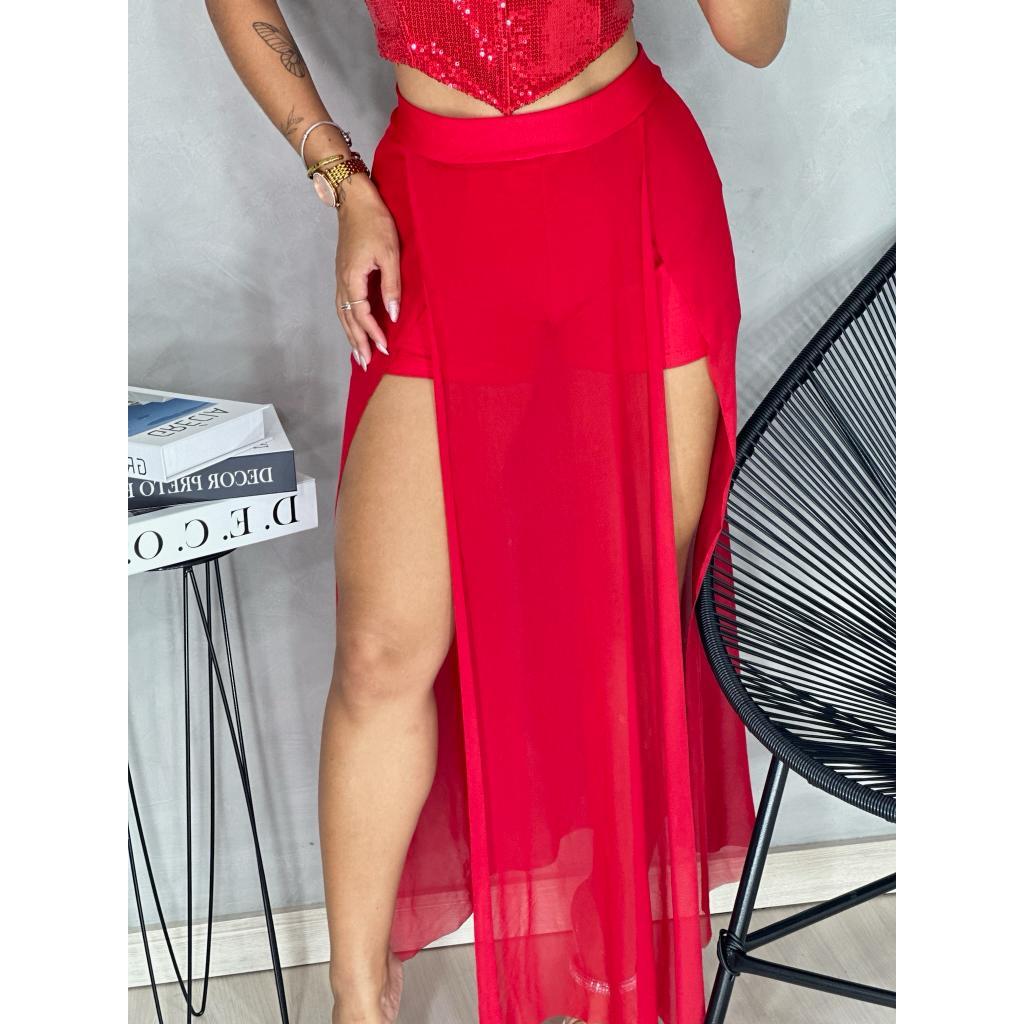 Saia Longa Transparente de Tule com Fenda Shortinho Elegante Moda Saida de Praia Piscina Verão 2026 Ano Novo