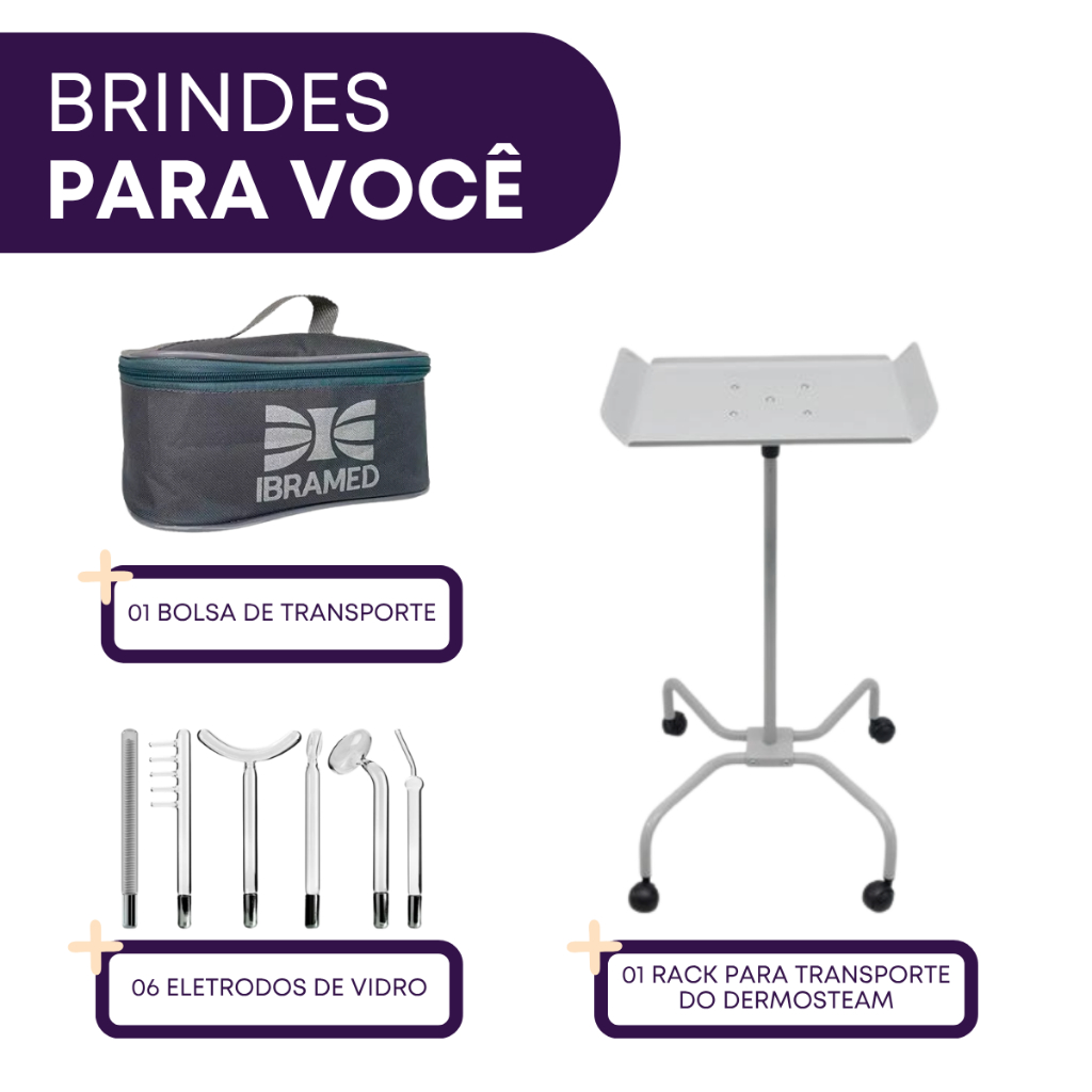 Kit Dermosteam Led Ibramed Vapor de Ozônio + HF Alta Frequência 6 Eletrodos + Carrinho