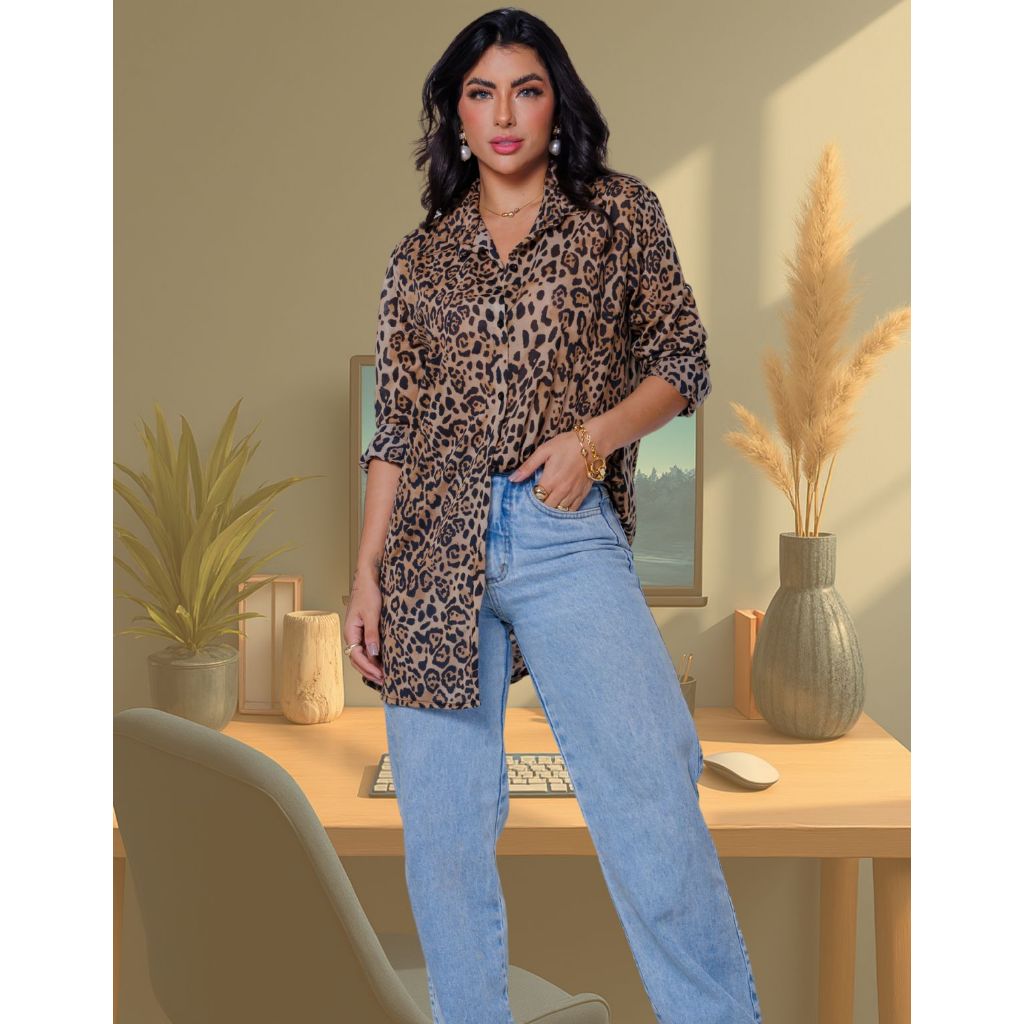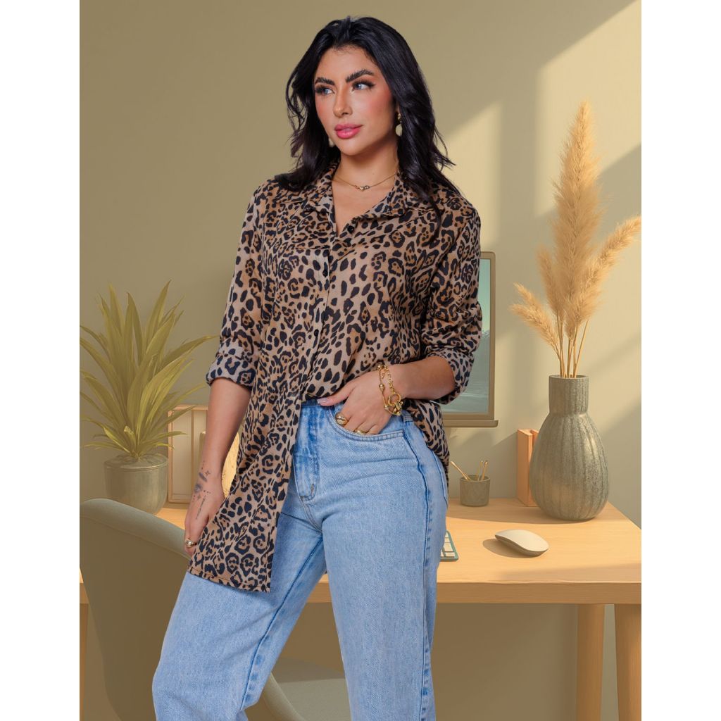 Chemise Camisa Feminina Animal Print Comprida