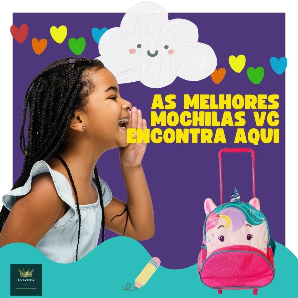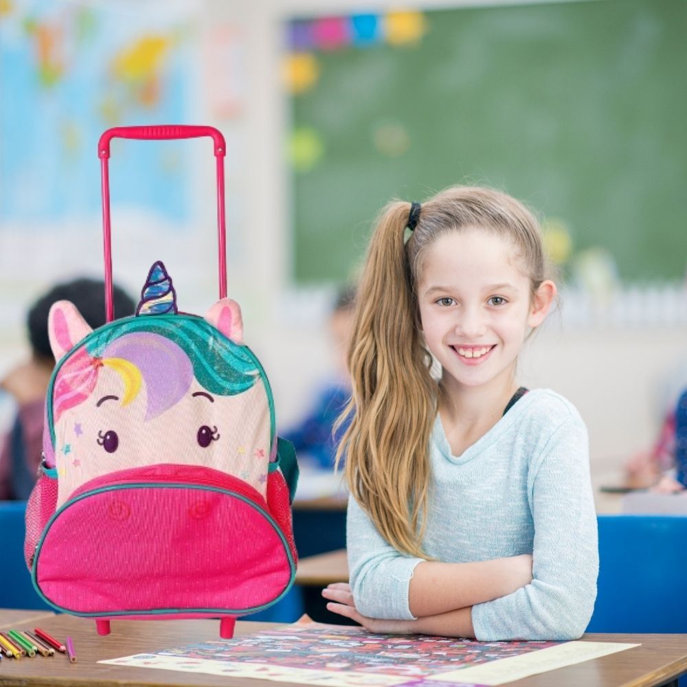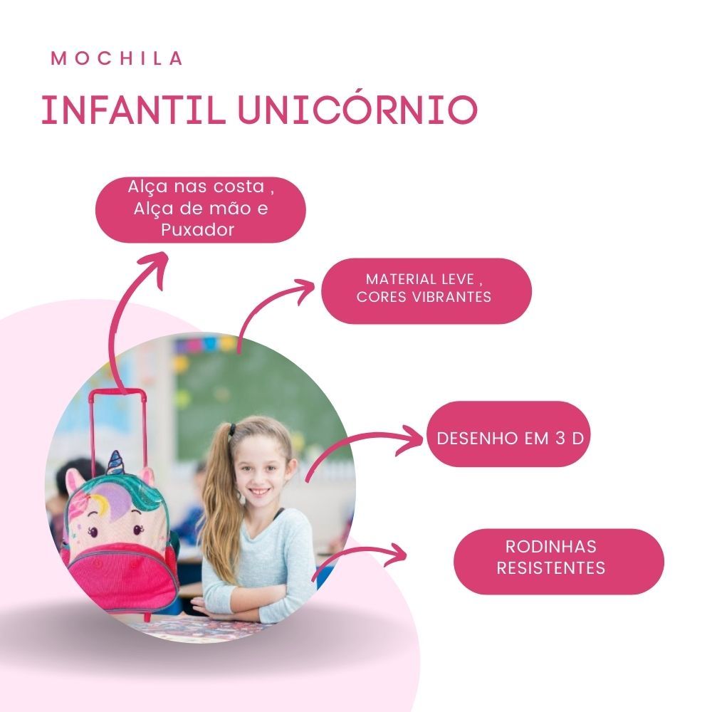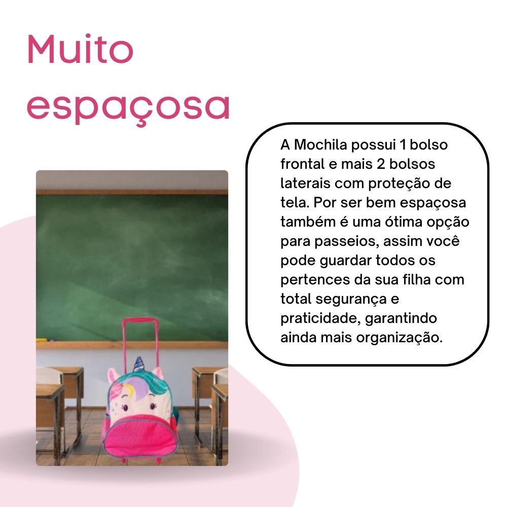 Mochila Infantil Escolar Com Rodinhas Unicórnio Arco-Íris Rosa e Verde bebê Passeio Creche