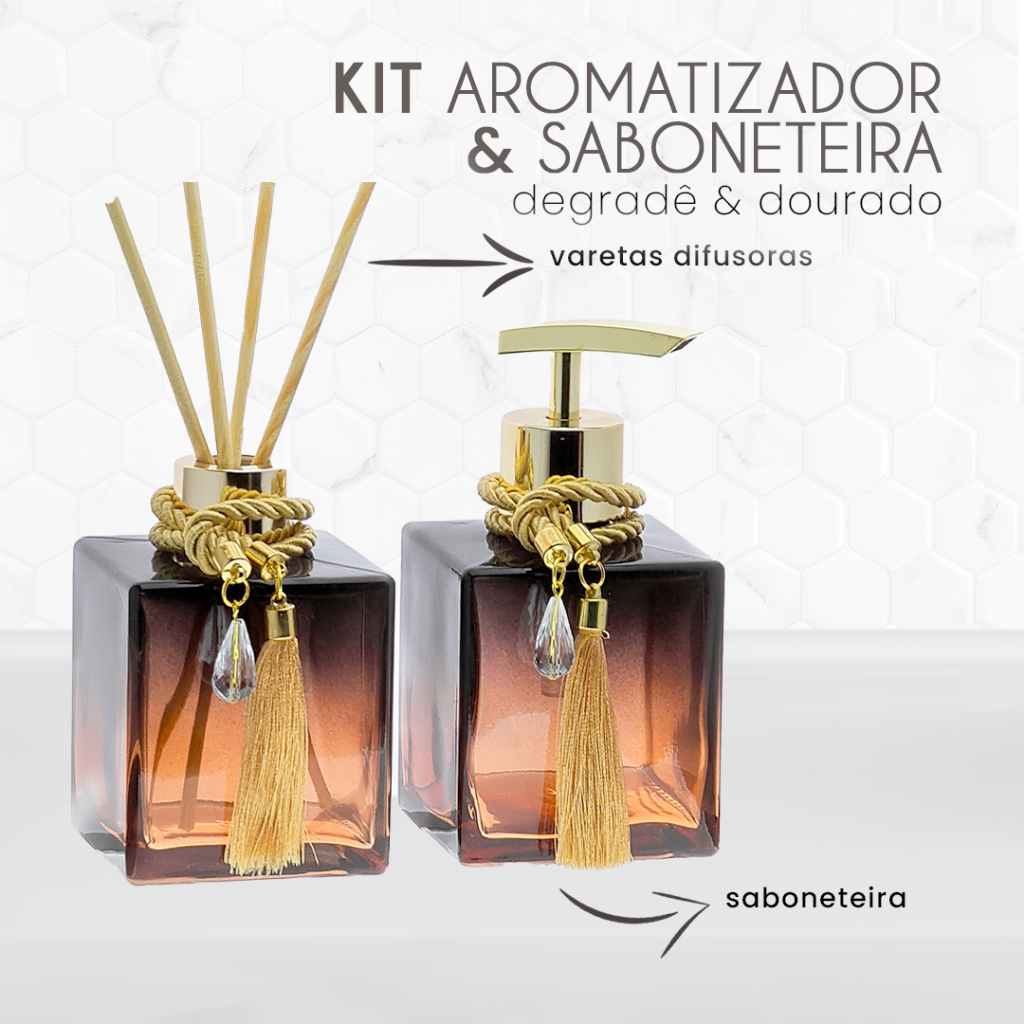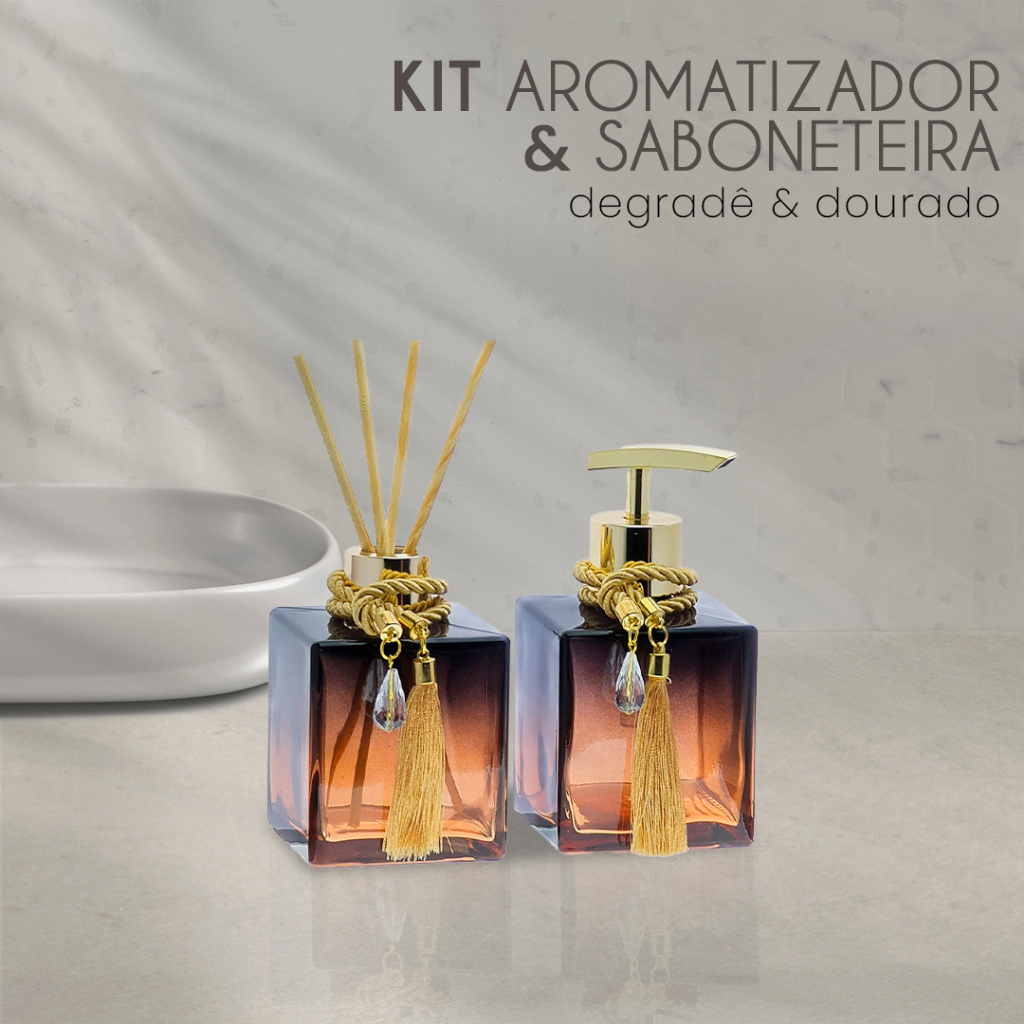 Kit Banheiro Vidro Cubo Preto e Rosé Aromatizador Difusor e Porta Sabonete Líquido 250ml Lavabo Luxo