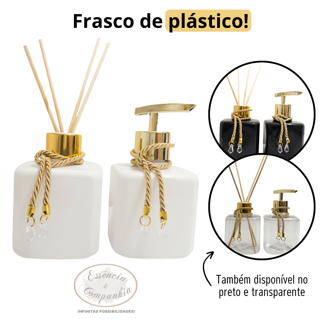 Banheiro Kit Frasco Plástico Branco Com Cordão Dourado Aromatizador de Ambiente e Saboneteira Lavabo