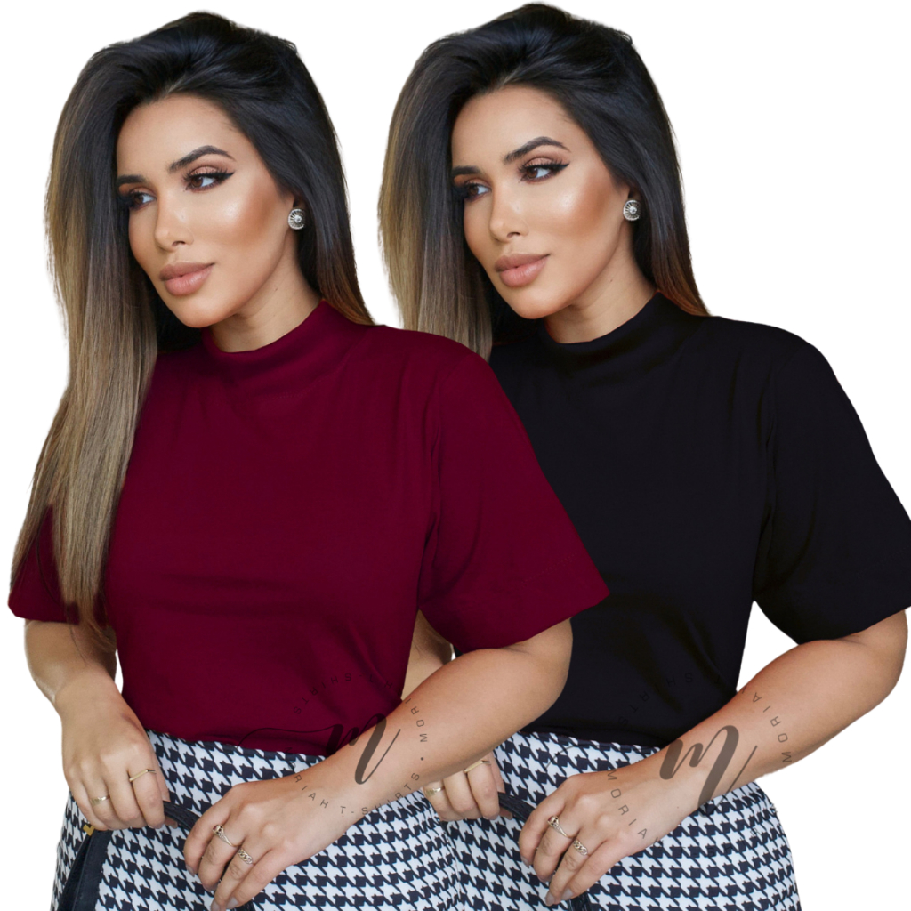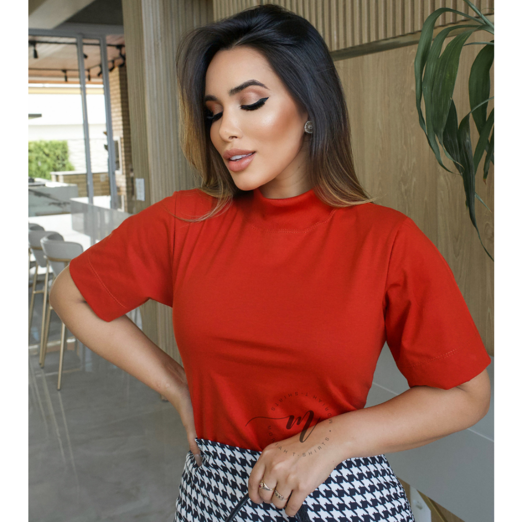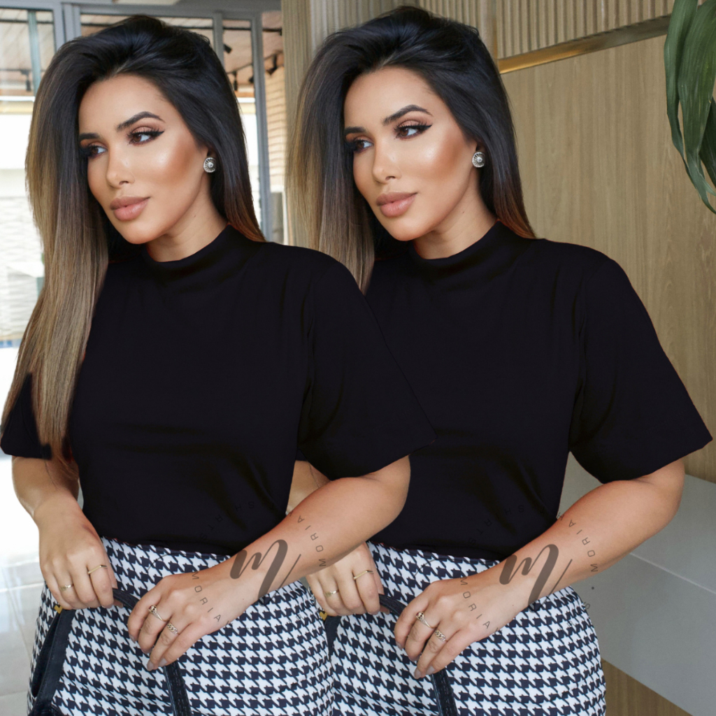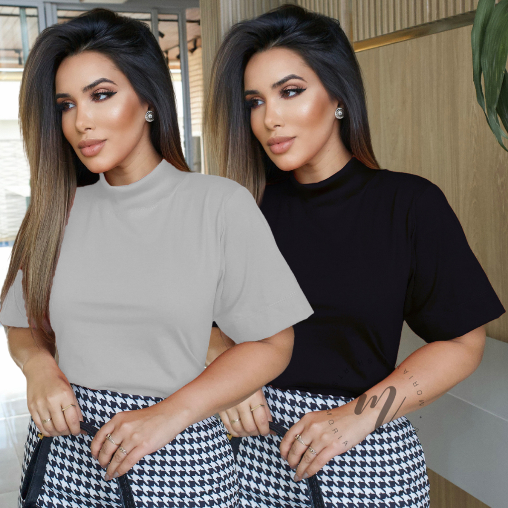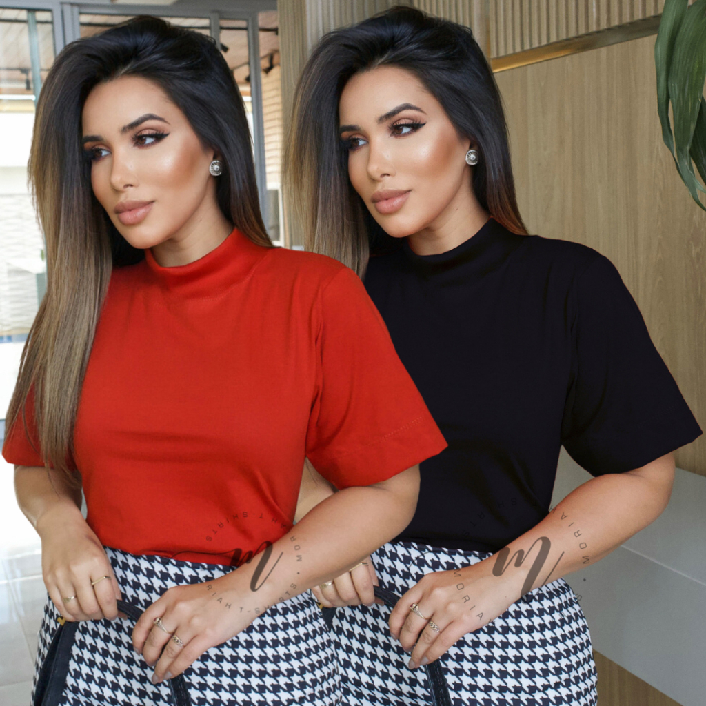 Tshirt Feminina Gola Alta Blusinha Gola Alta Moda Blogueira Blusa Camiseta Estilosa Algodão Blusas Feminina Basica