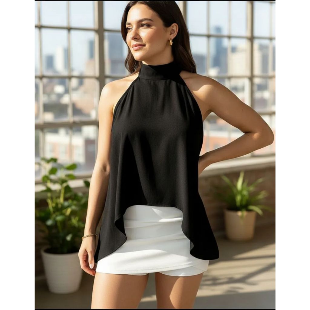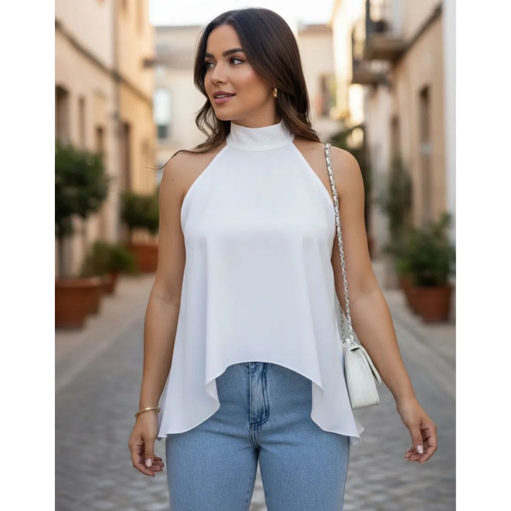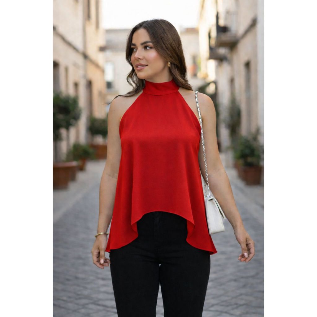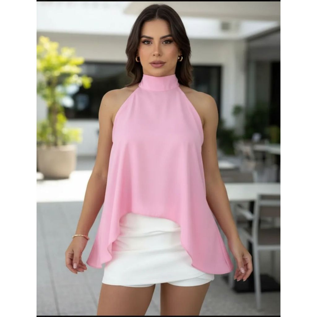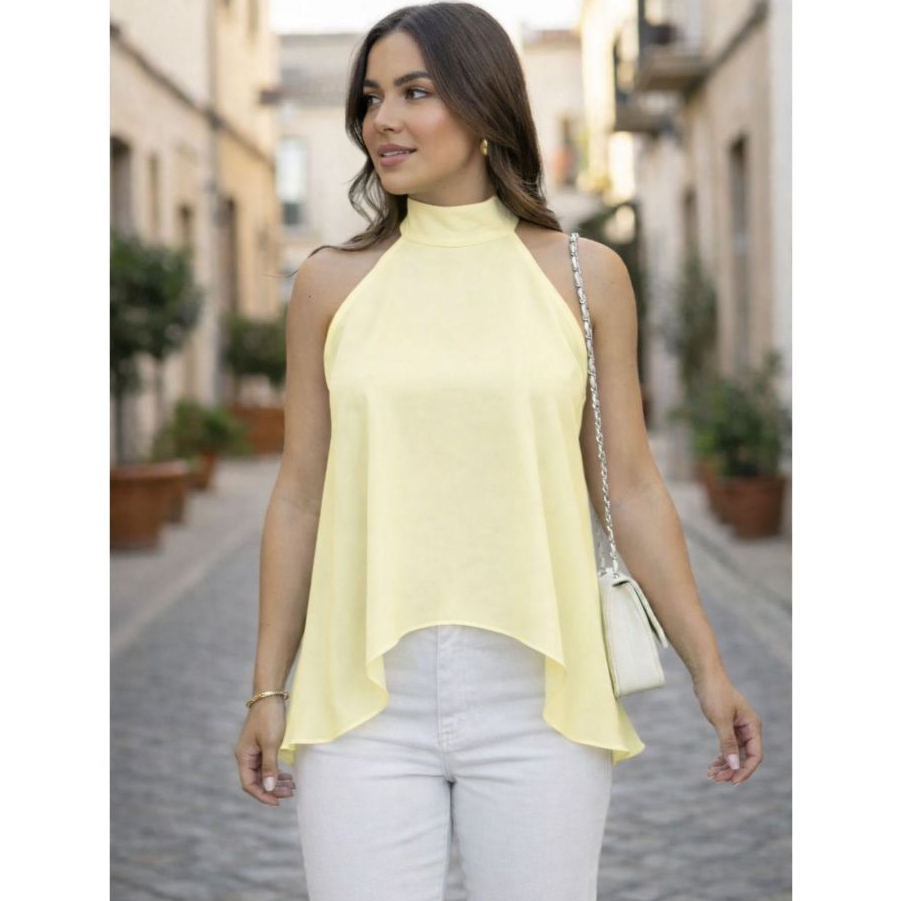 Blusa Feminina Bata Com Gola Alta Amarração no Pescoço Assimétrica Tendência