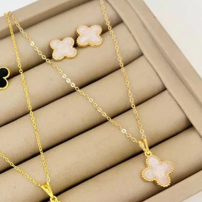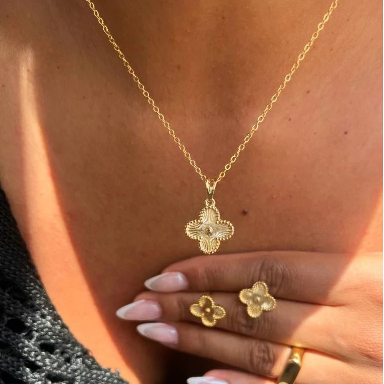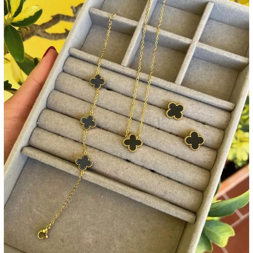 Conjunto Trevo Virginia Colar e Brinco Folheados a Prata 925 Banhado Ouro 18k