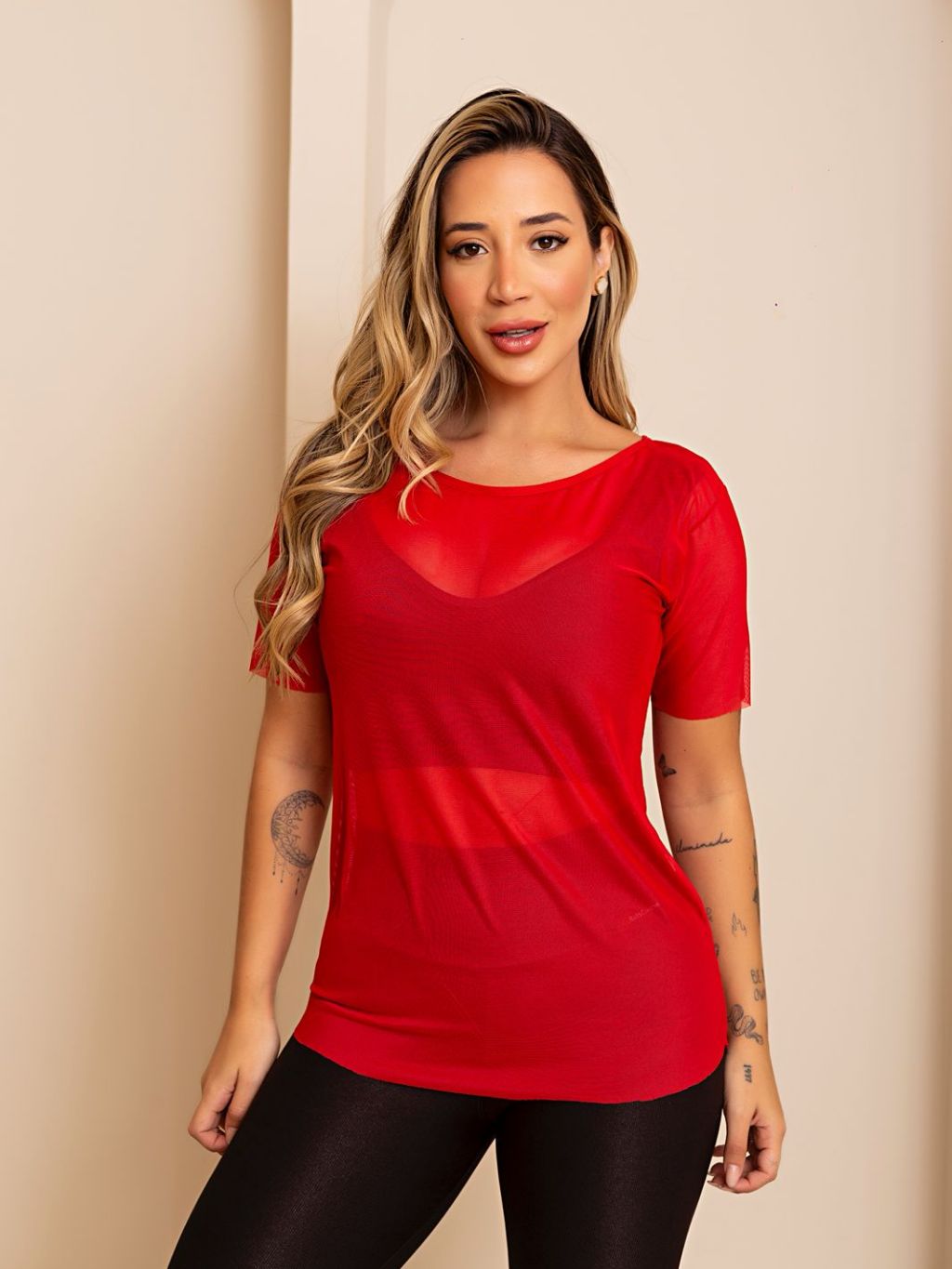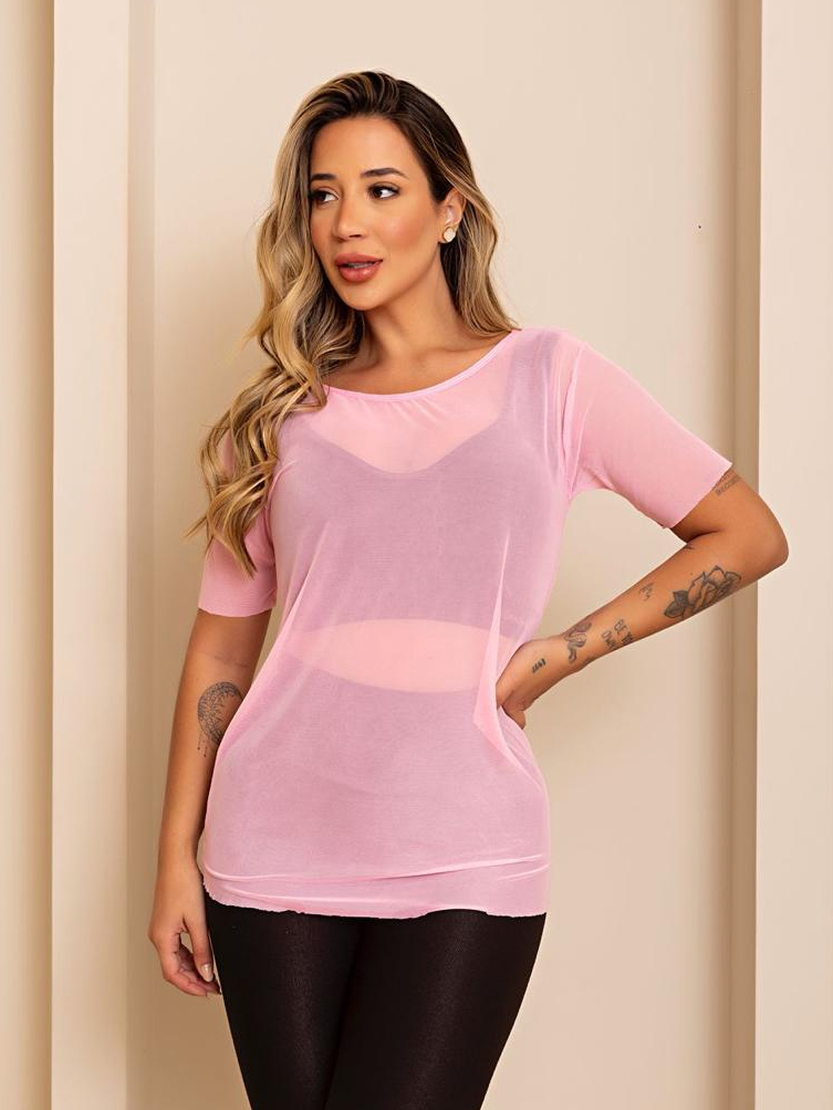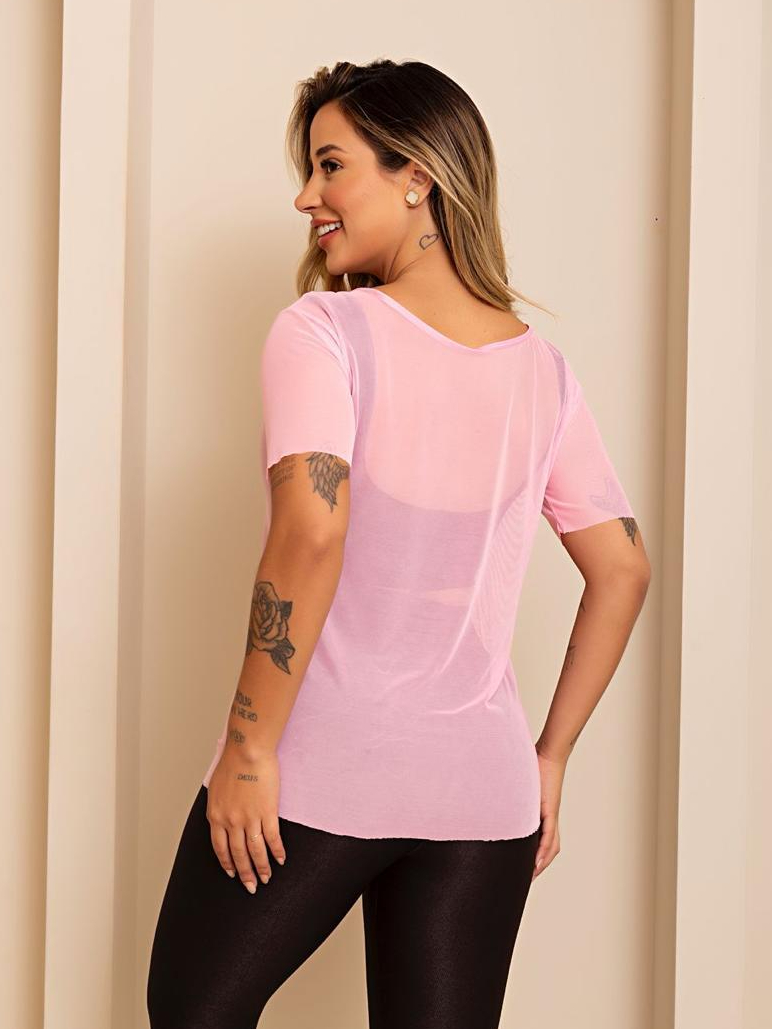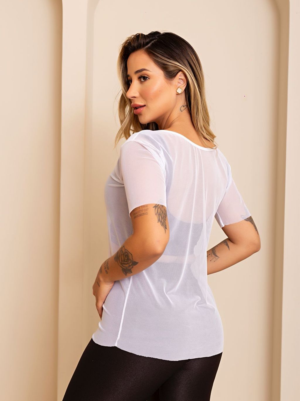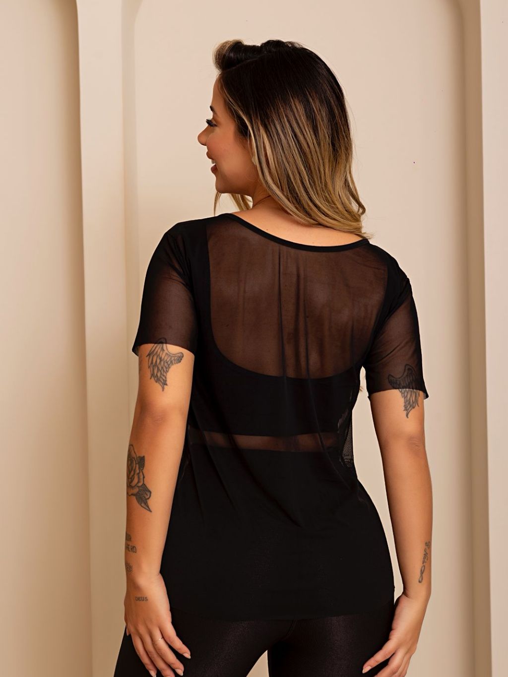 Kit 2 Blusas Feminina Transparente De Tule Manga Curta Camiseta Academia Treino Fitness Musculação