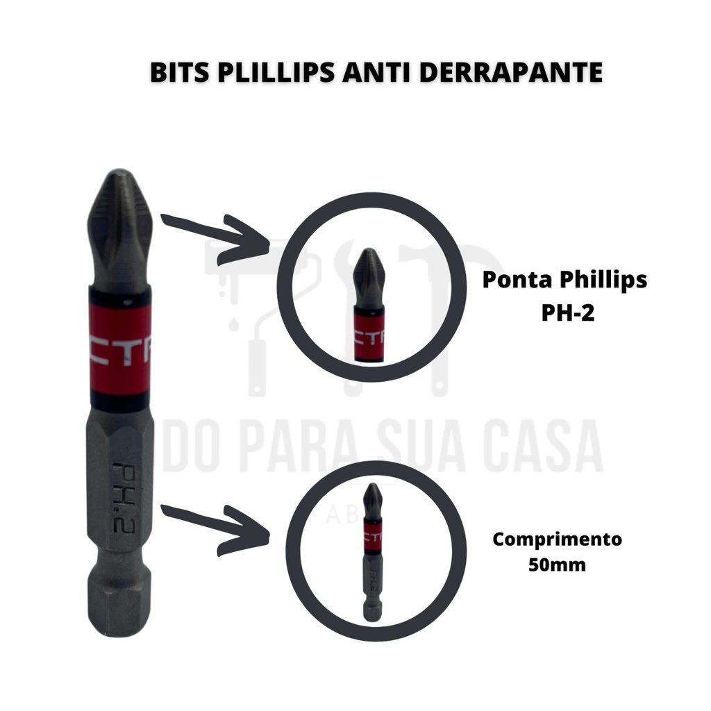 KIT COM 2 Bits Phillips PH2x50mm Ponta Antiderrapante e Magnética - Usado em qualquer marca de parafusadeira.