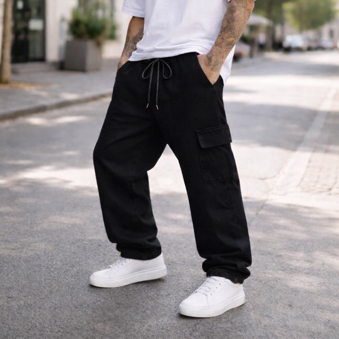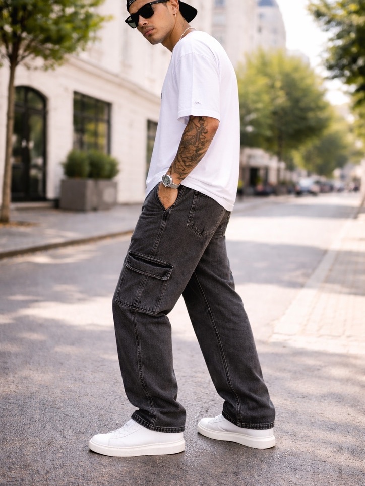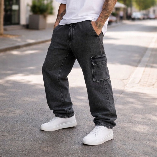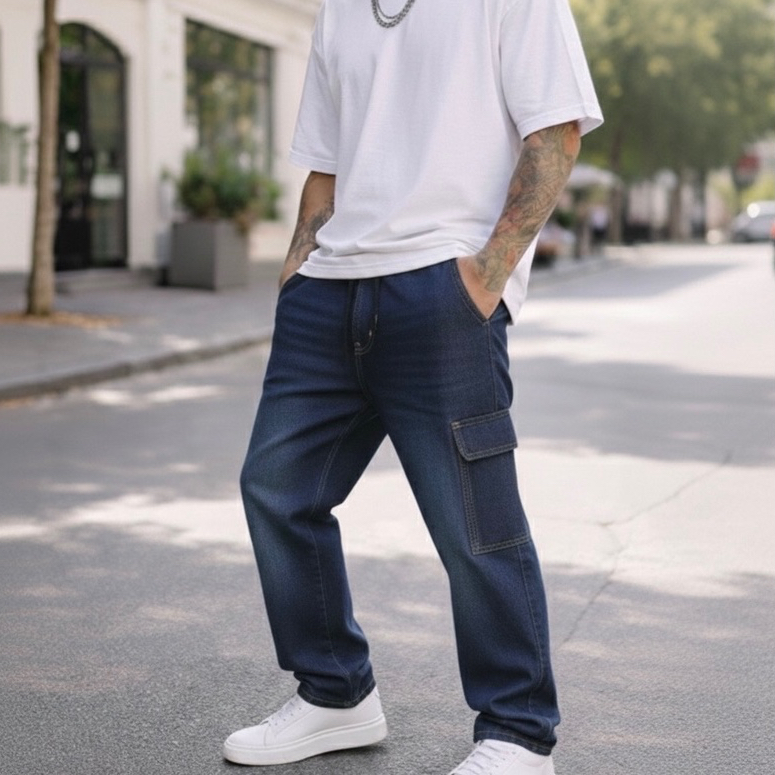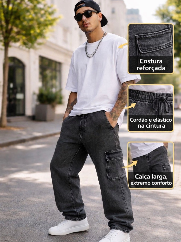 Calça Cargo Masculina Grafite Preta Azul Larga Sarja Jeans Bolsos Laterais