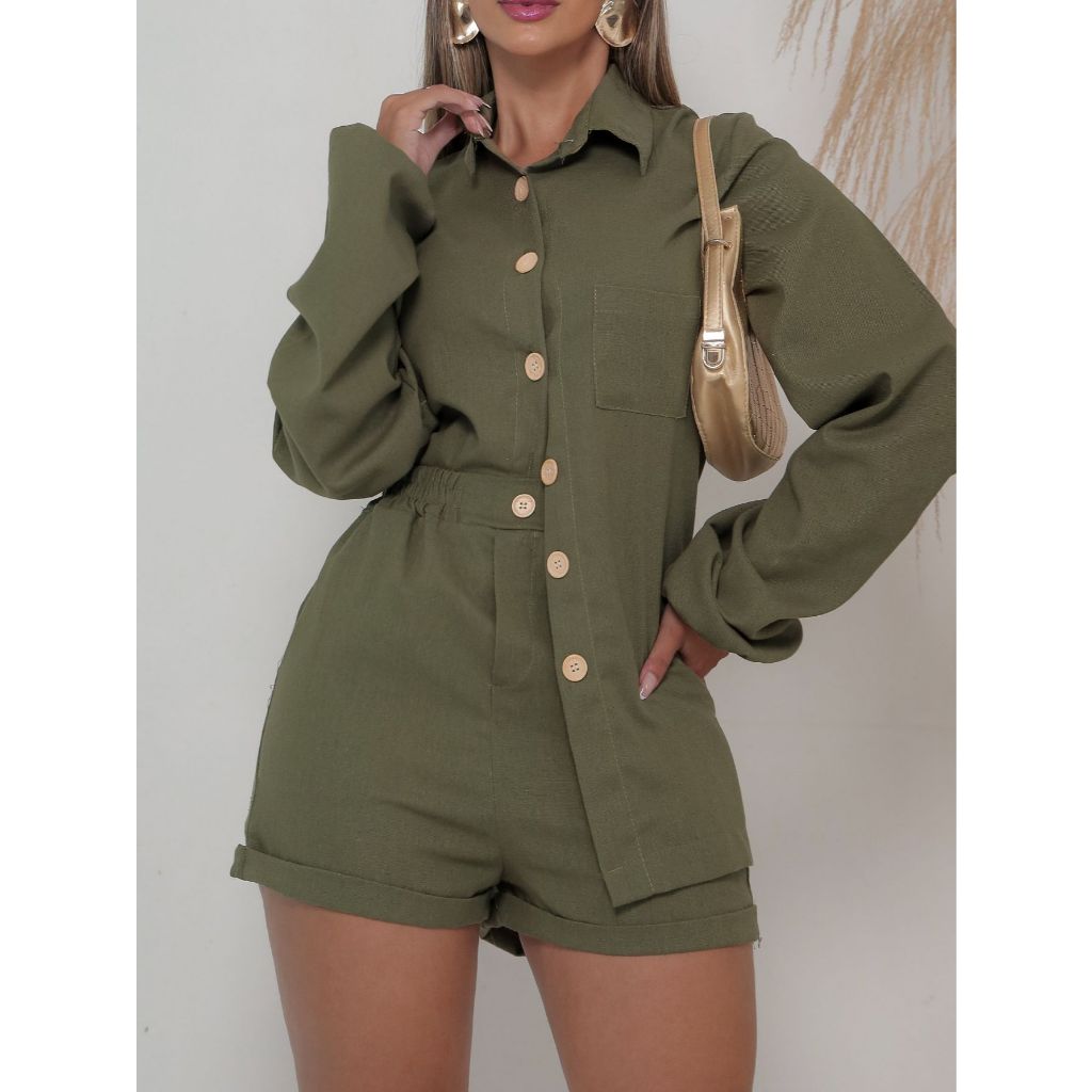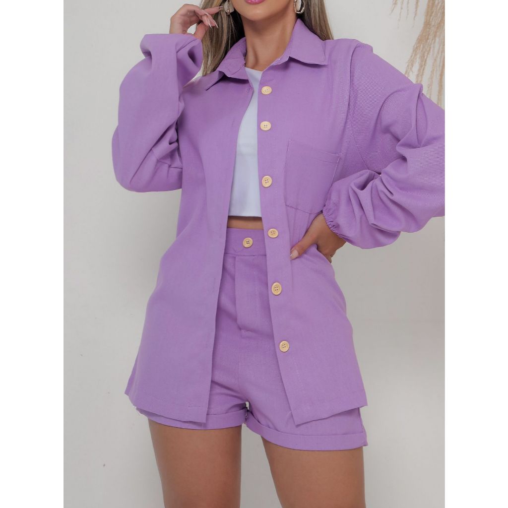 Conjunto Linho Feminino Camisa E Short Linha com Bolsos e Botões