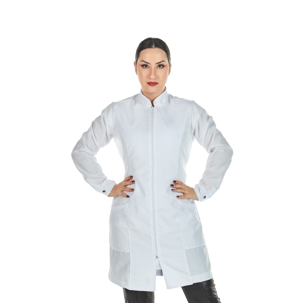 Jaleco Feminino Gola Padre Zíper Manga Longa Branco Oxford Acinturado Dentista Profissional