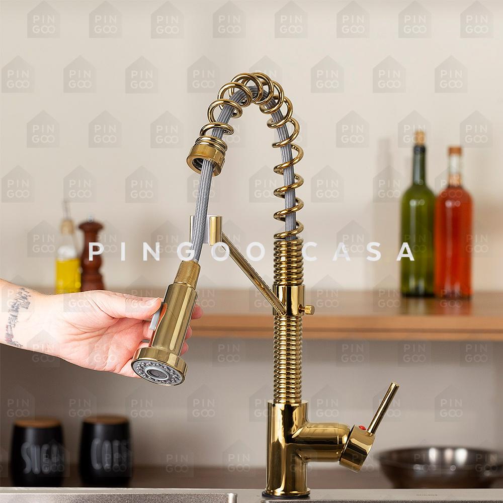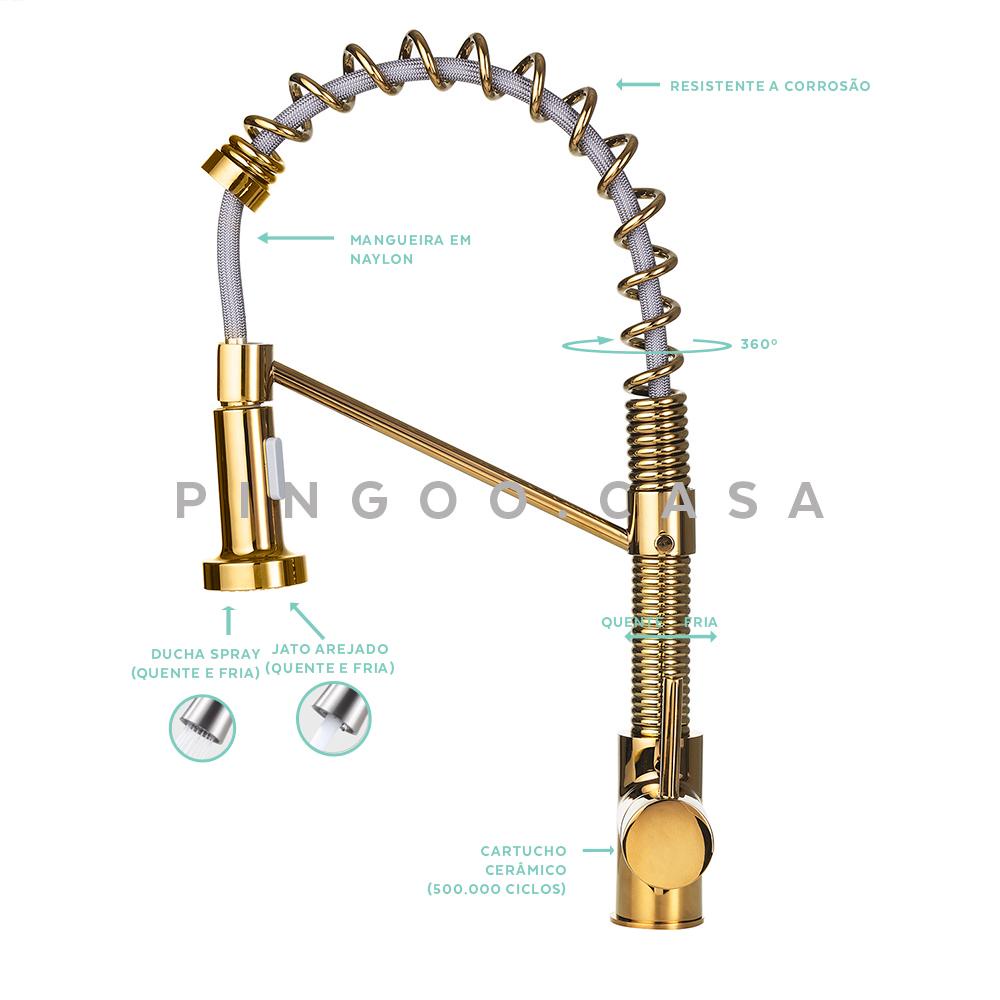 Torneira para cozinha Gourmet Misturador Monocomando Extensível em Aço inox Escovado Araguari Pingoo - Dourado