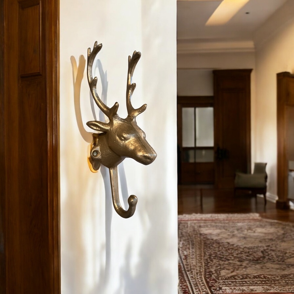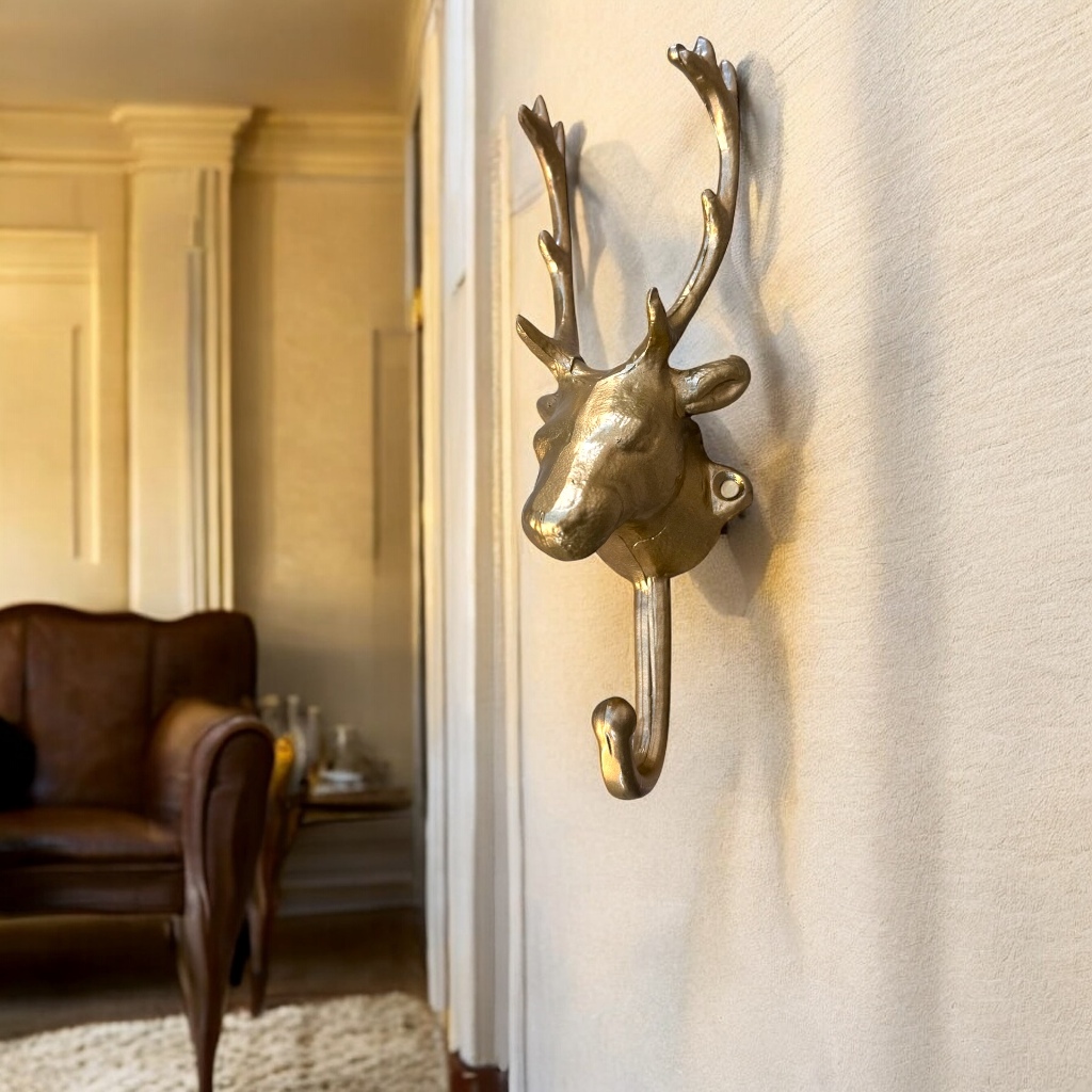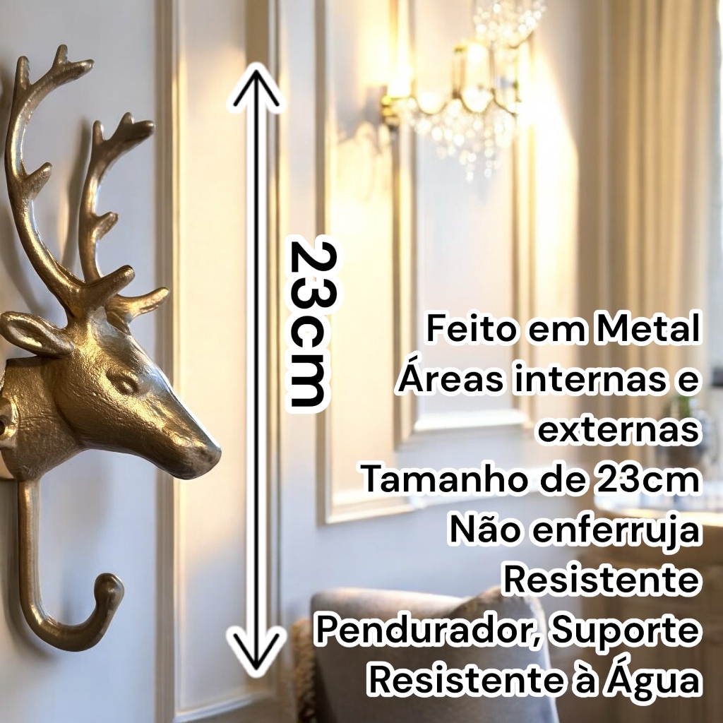 Gancho Decorativo Cabeça de Cervo Rena Em Metal 23cm Parede Bolsa Casaco Toalha Rústico