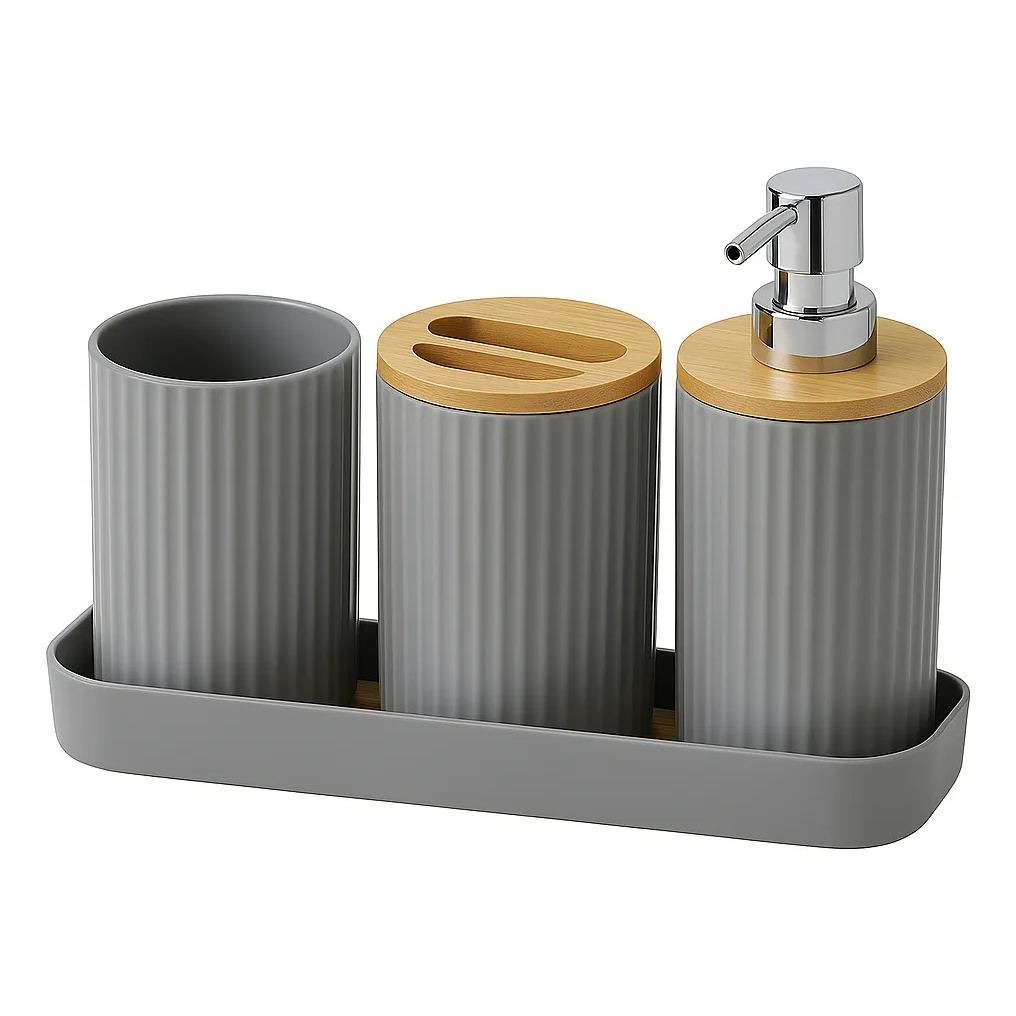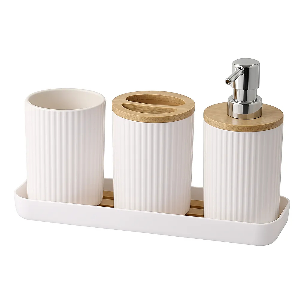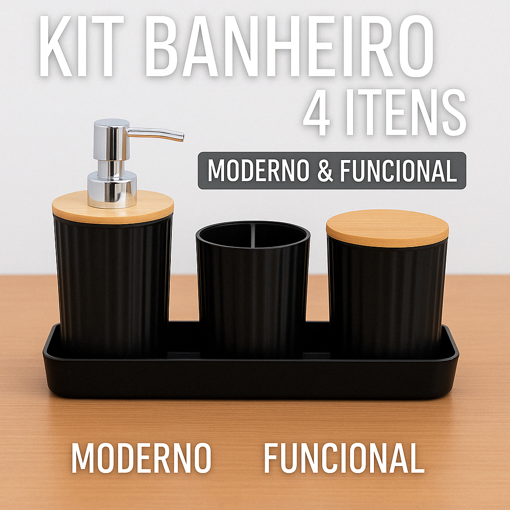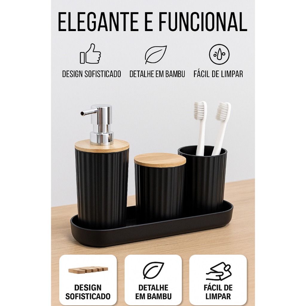 Kit Banheiro 4 Peças Bambu Moderno com Dispenser Porta Escova Sabonete Base Organizadora