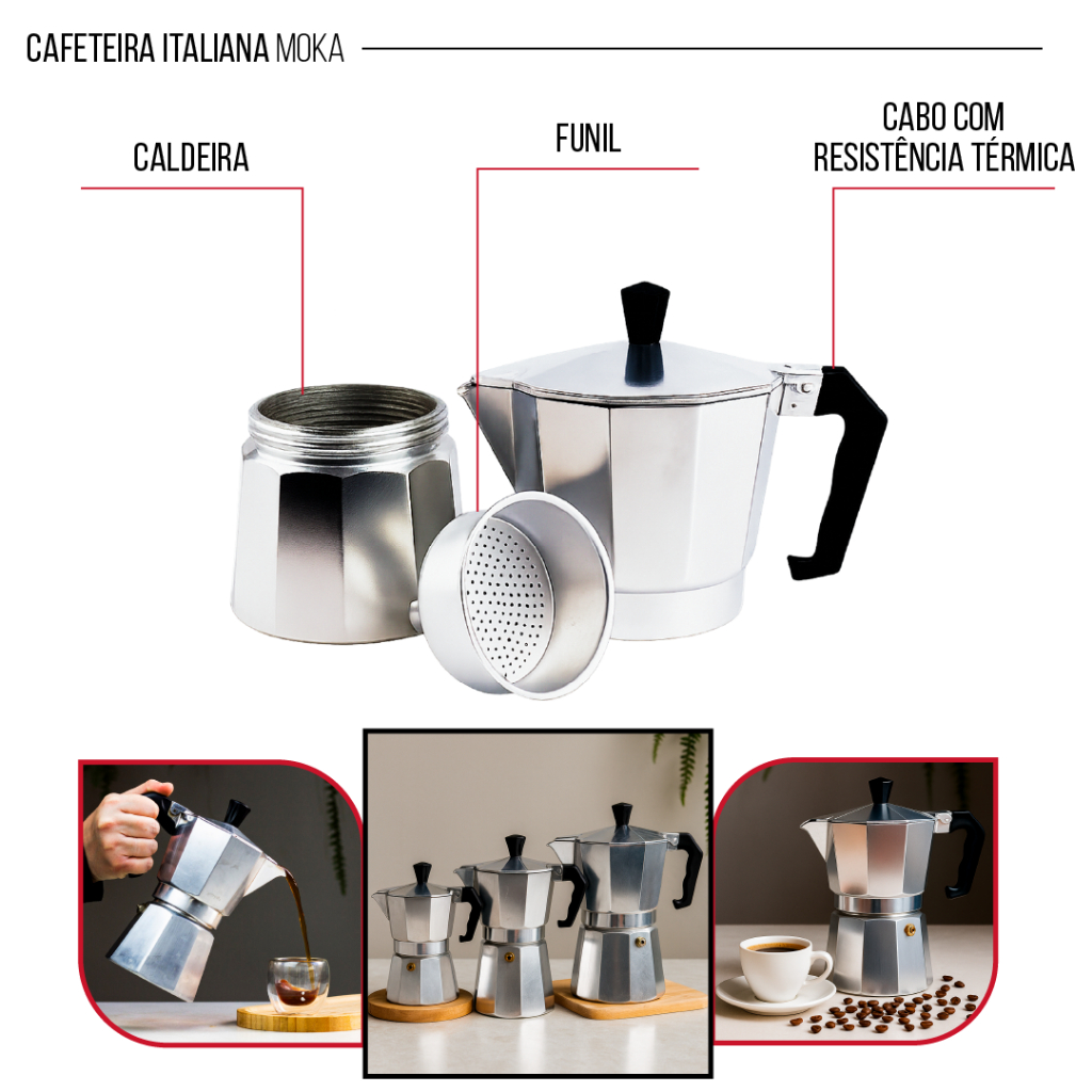Cafeteira Moka de Alumínio 6/9 Xícaras – Cafeteira Italiana para Café Expresso Rápido no Fogão