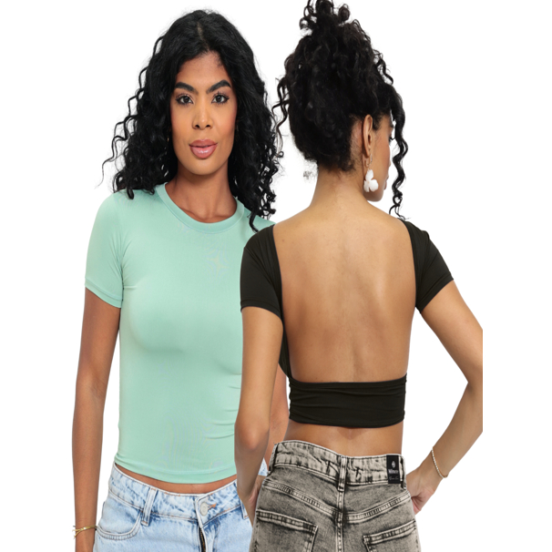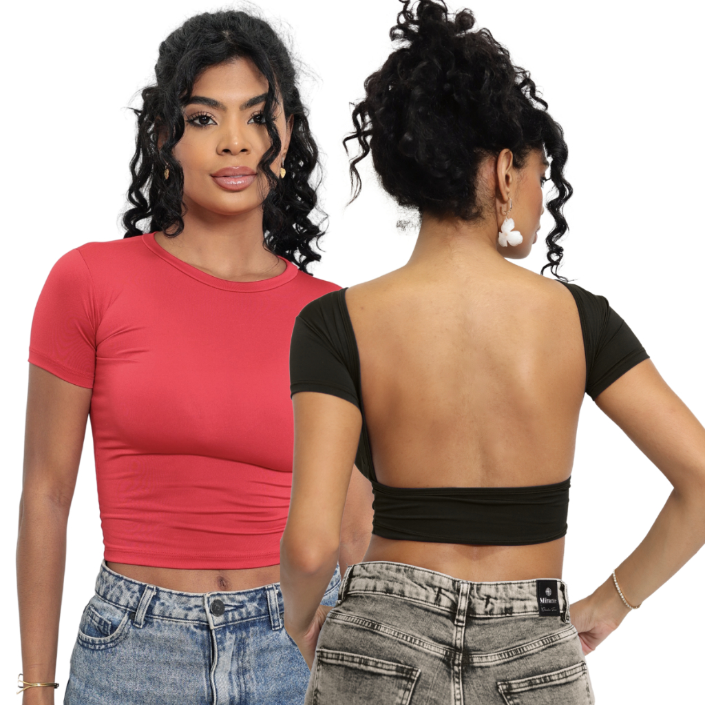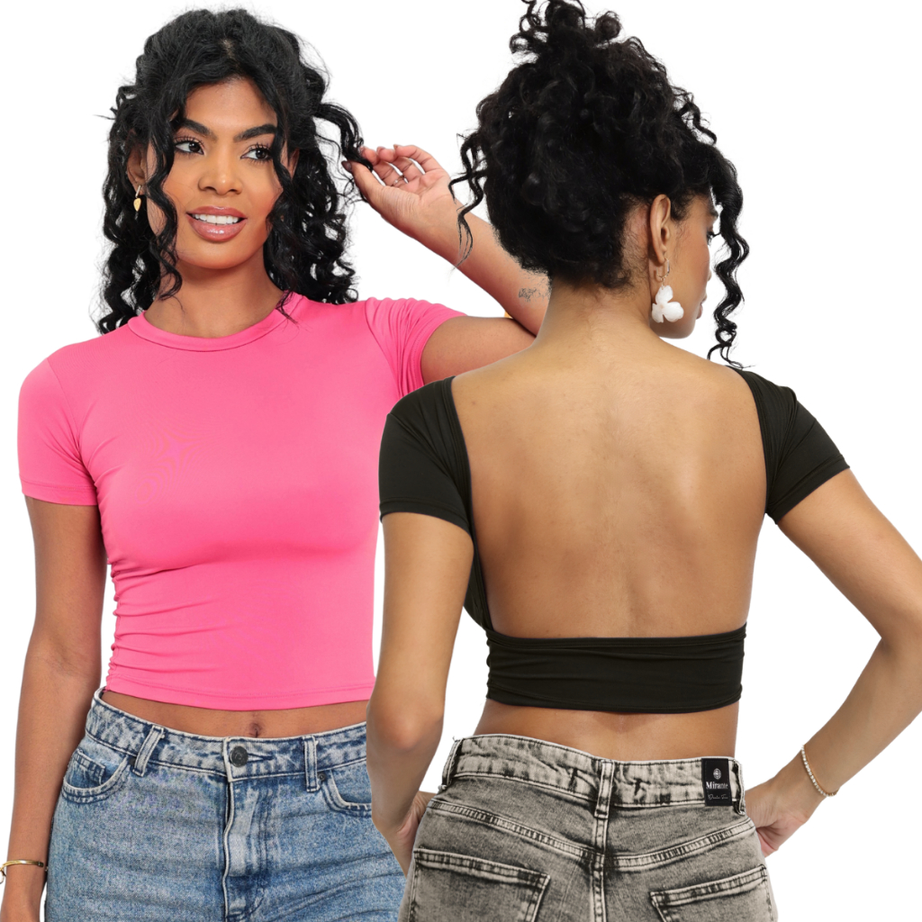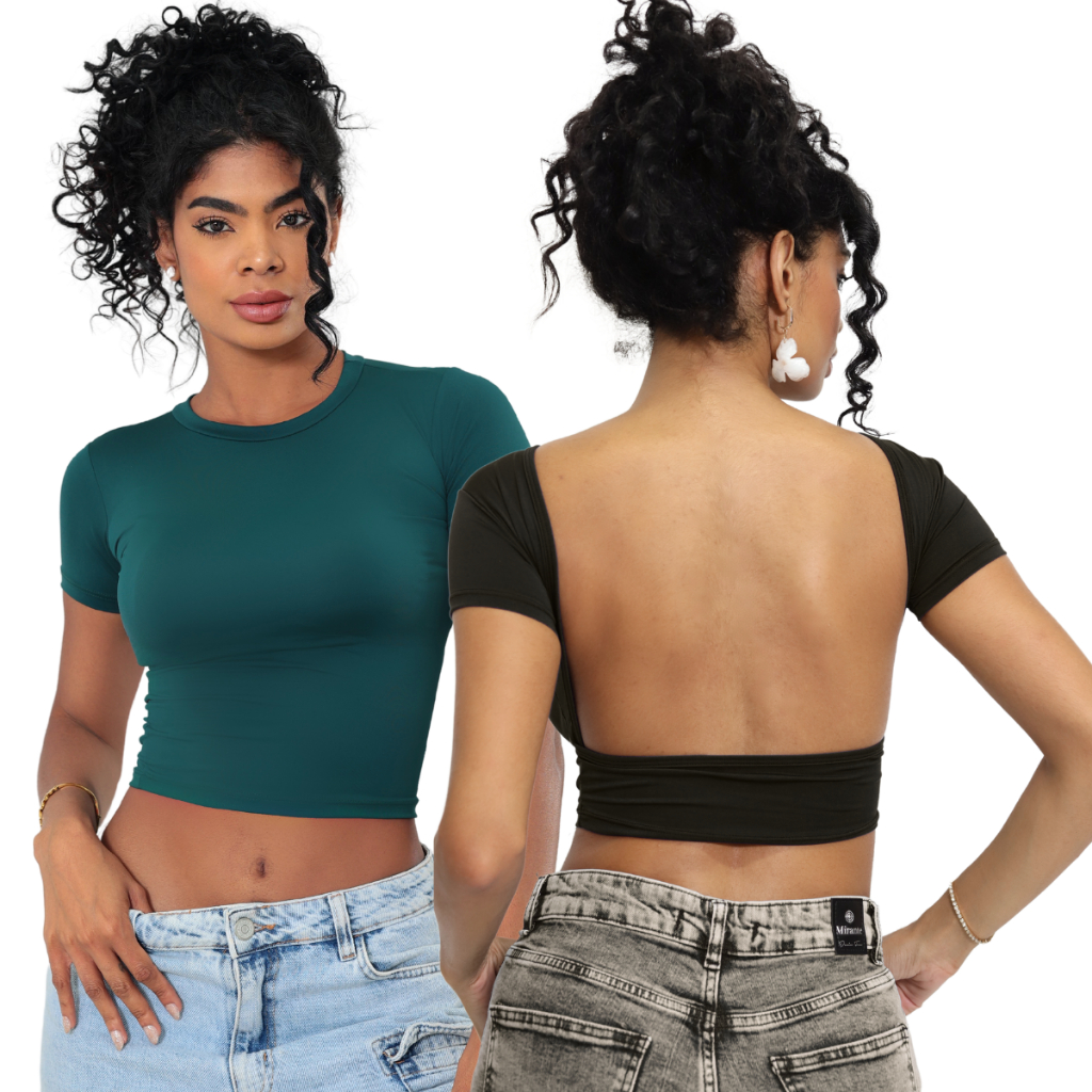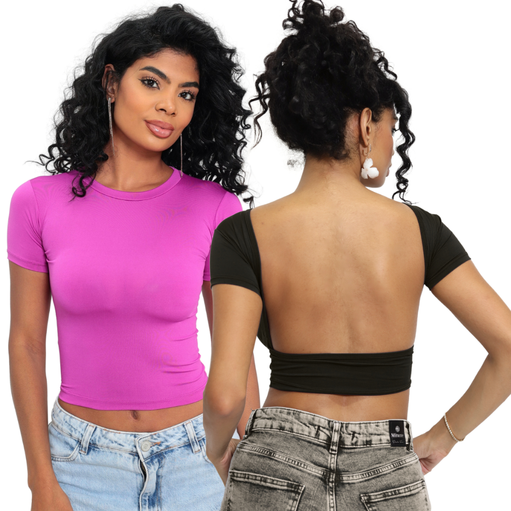 Kit 02 Baby Tee e Mostra Costas Feminina : Blusa Slim Fit Manga Curta