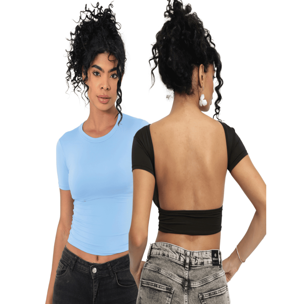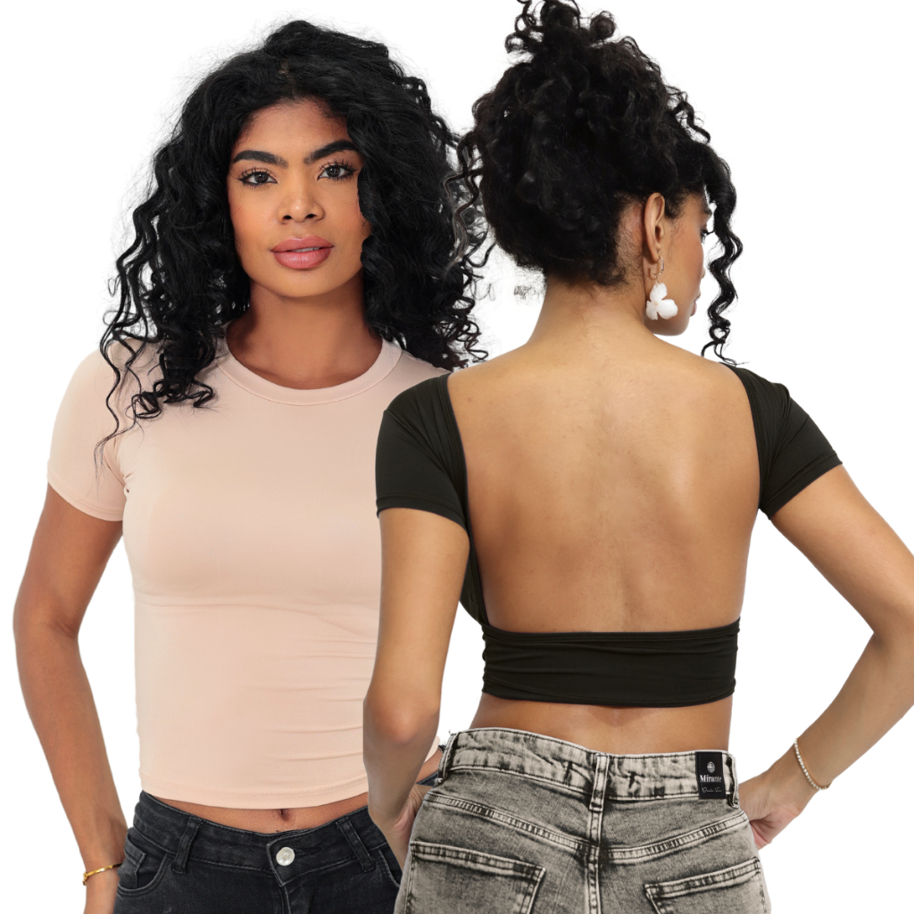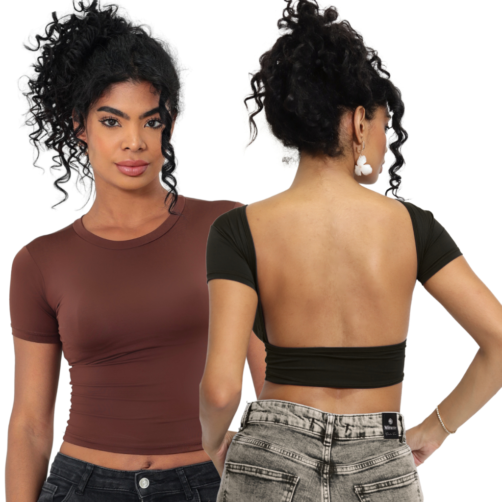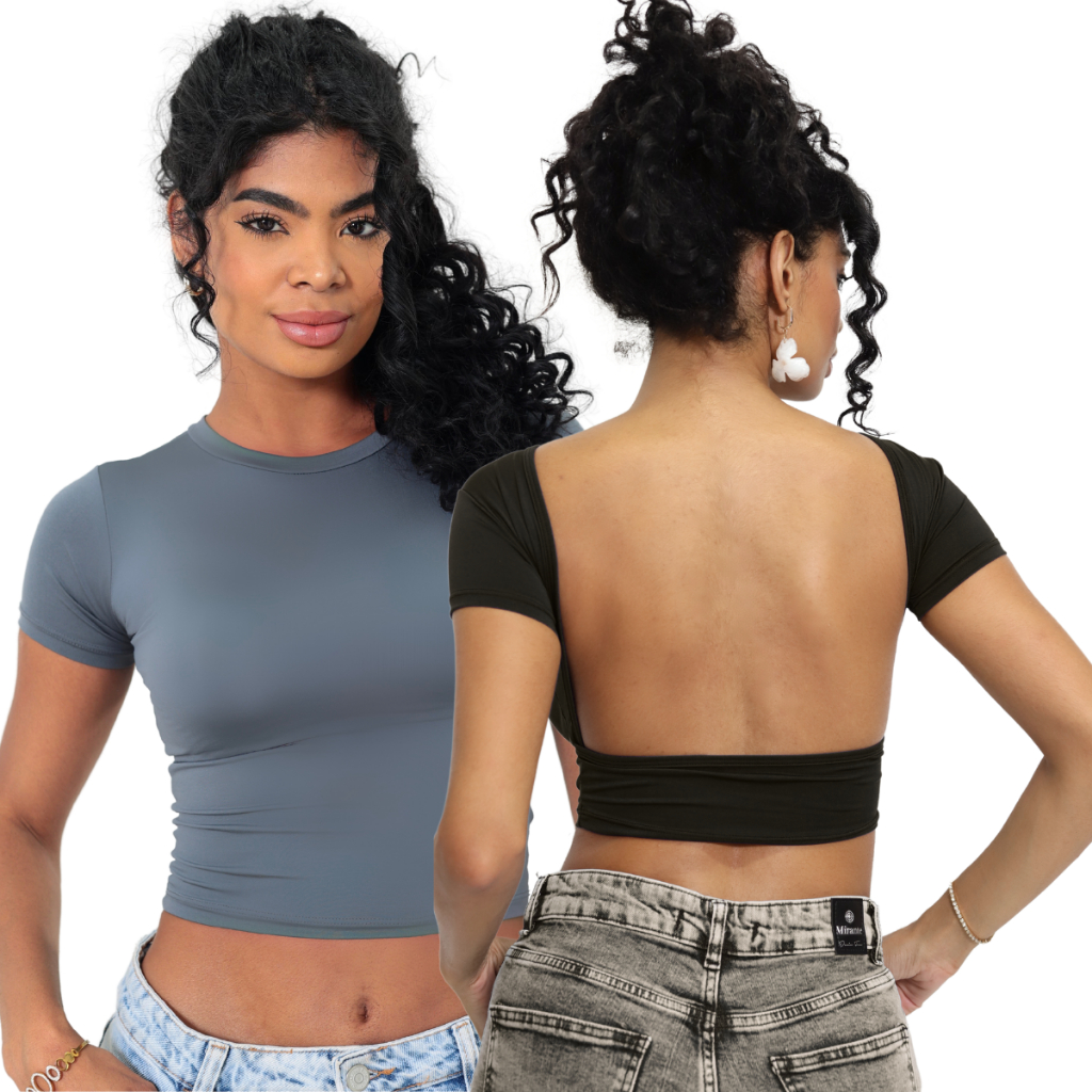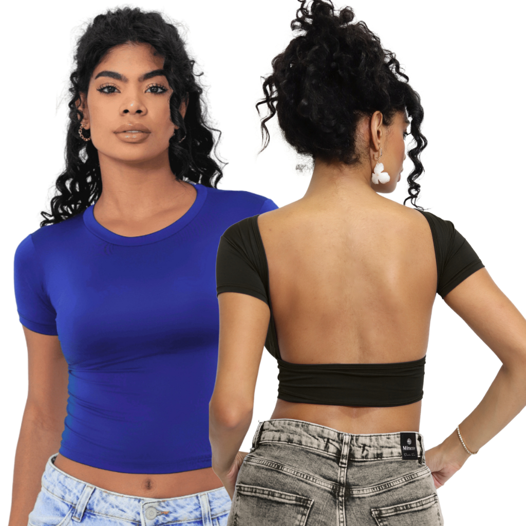 Kit 02 Baby Tee e Mostra Costas Feminina : Blusa Slim Fit Manga Curta
