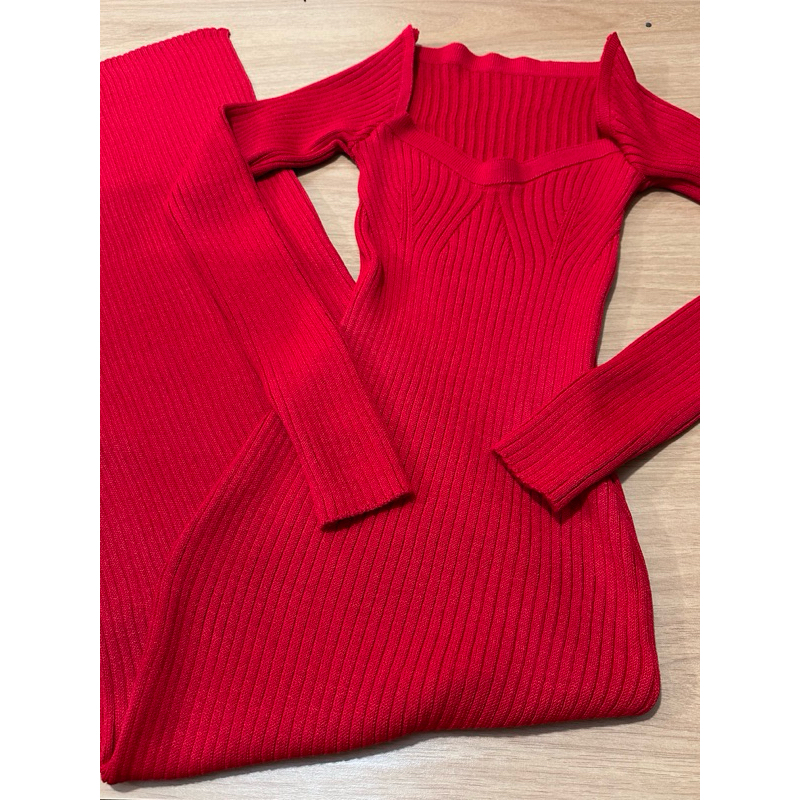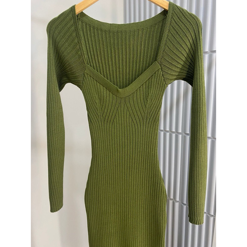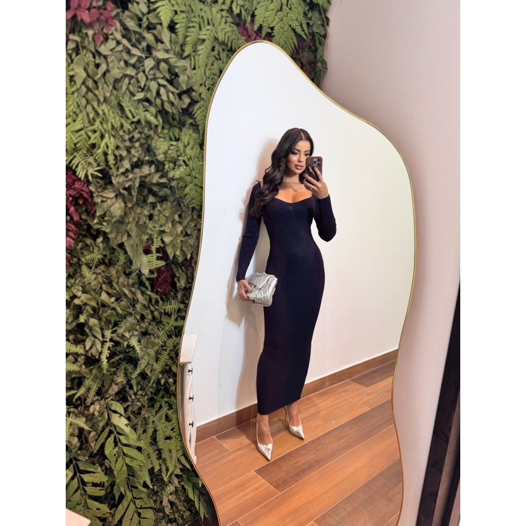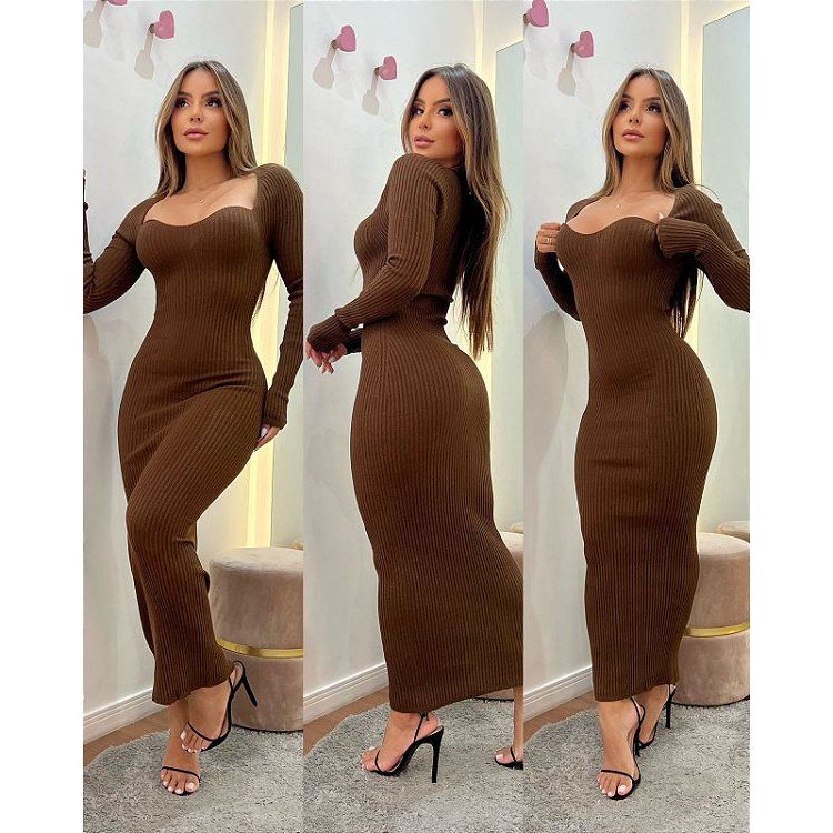 Vestido Decote Coração Max Mídi Longuete Canelado Tricot Inverno