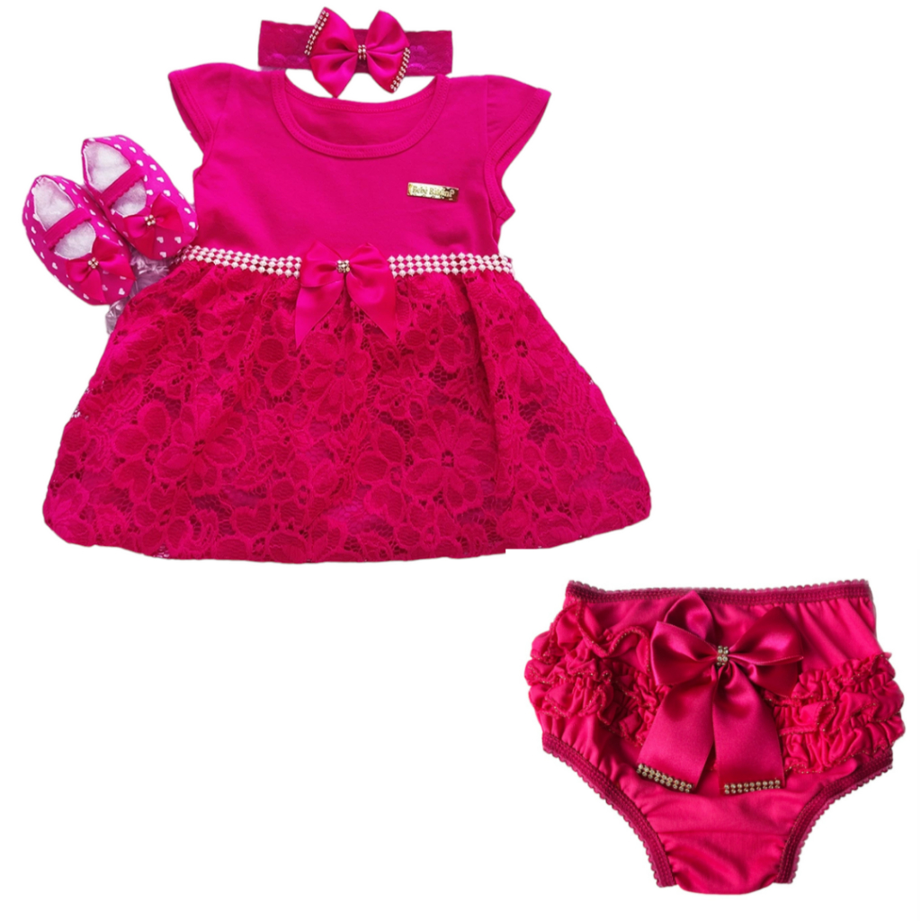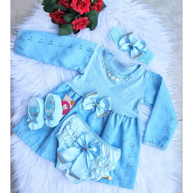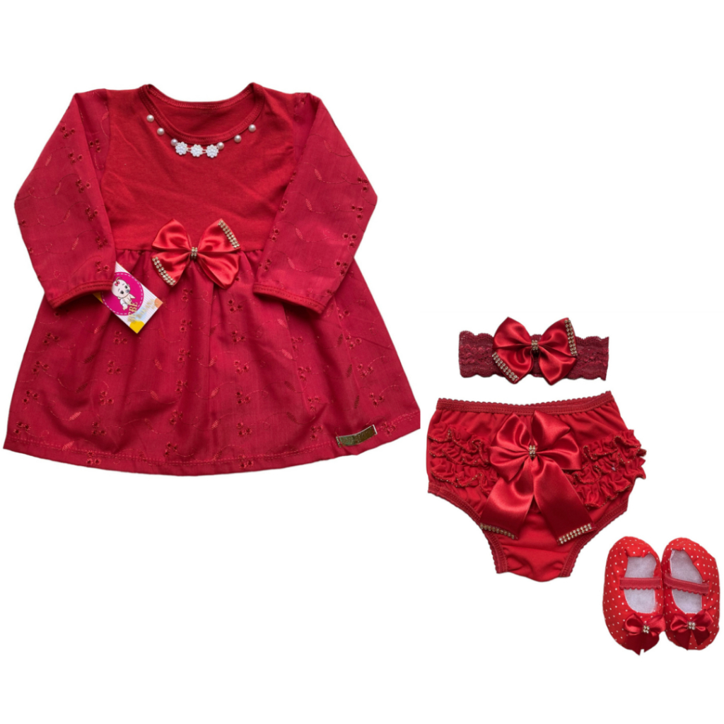 Vestido Infantil Menina Natal Conjunto 4 Peças Roupa De Bebê Calcinha Batizado Mesversario Verão