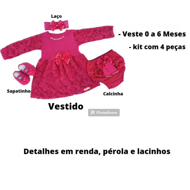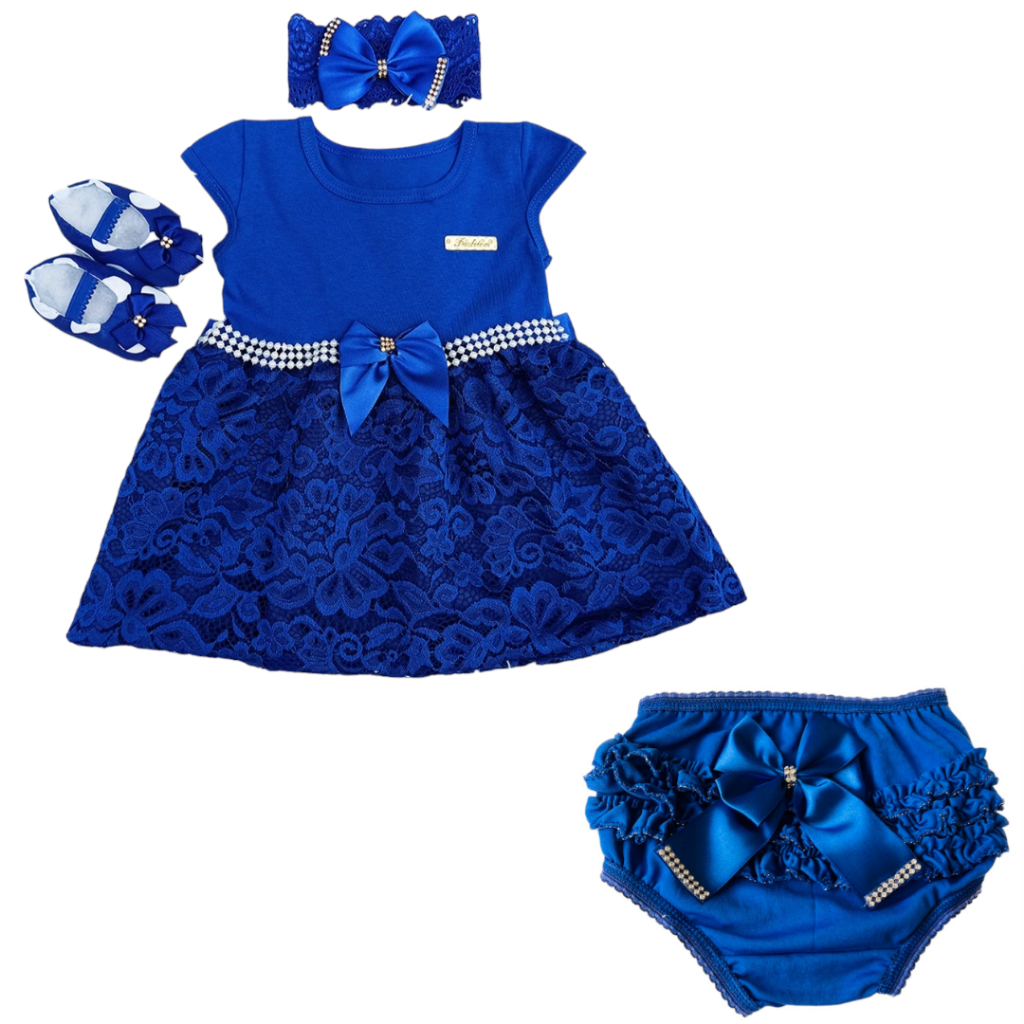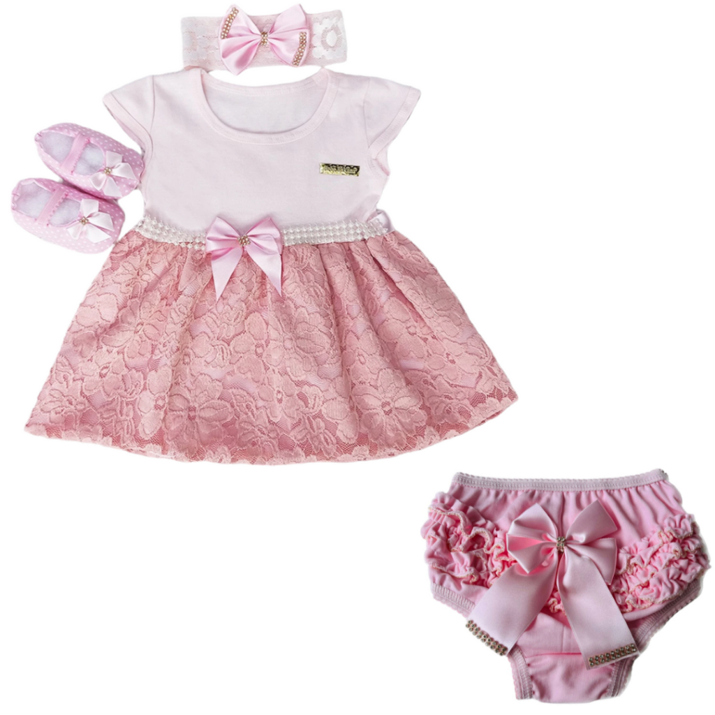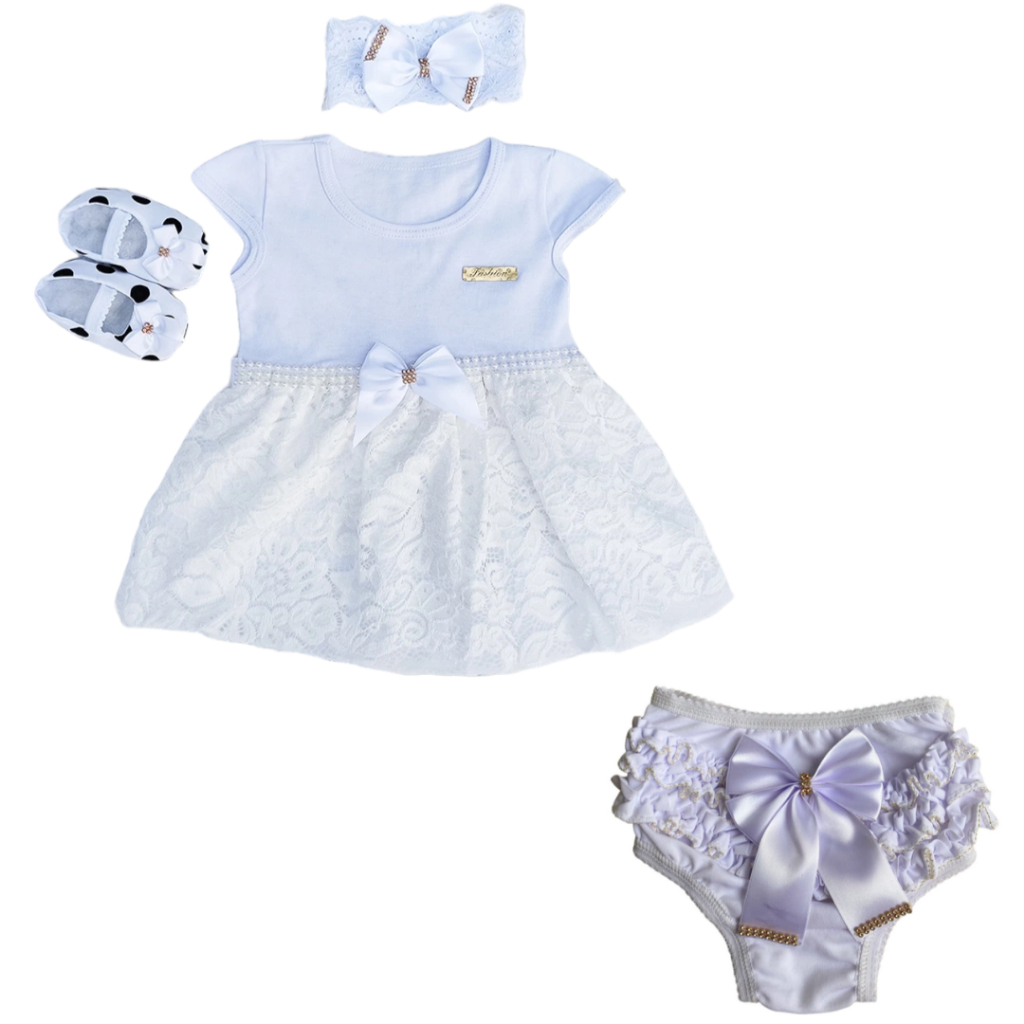 Vestido Infantil Menina Natal Conjunto 4 Peças Roupa De Bebê Calcinha Batizado Mesversario Verão