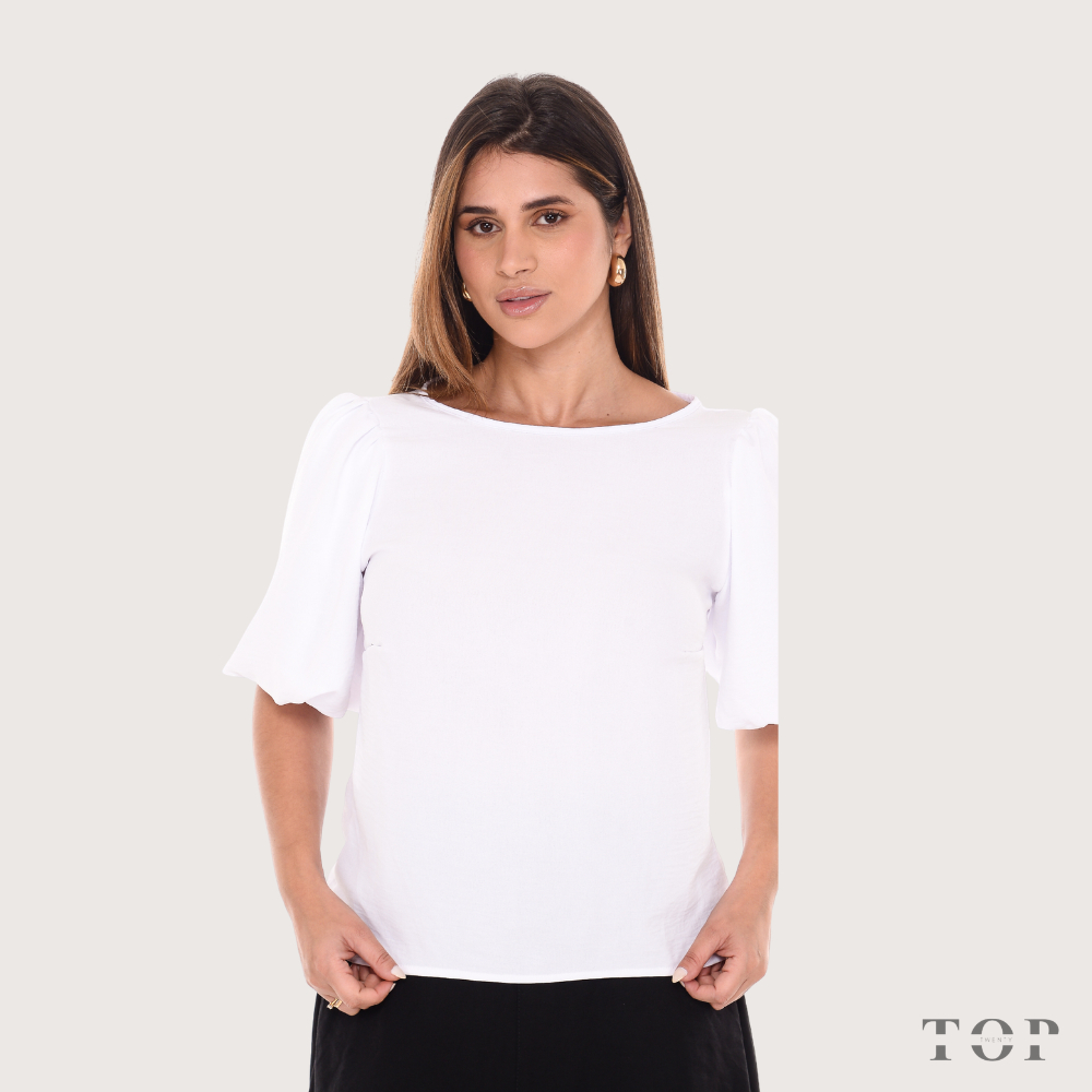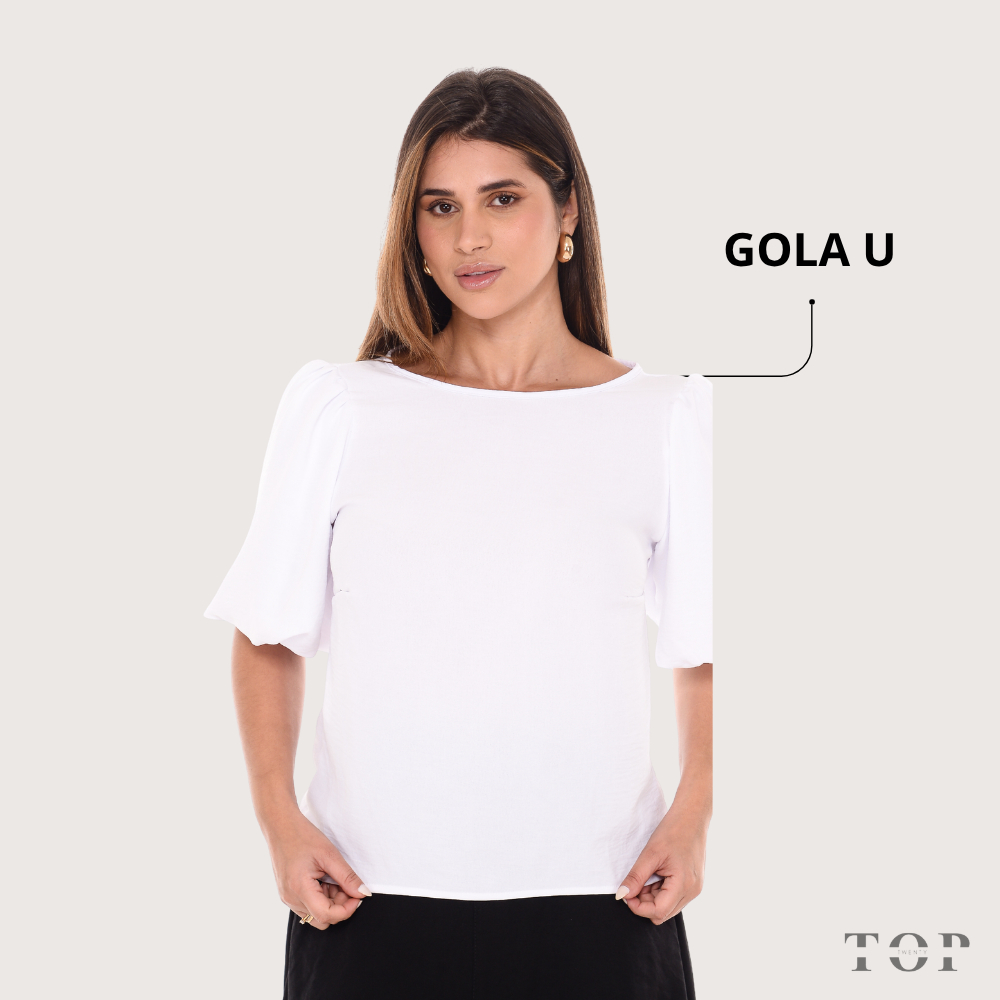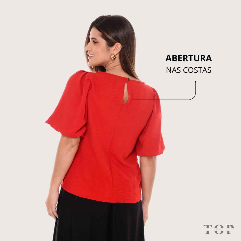 Blusa Feminina Manga Balonê Gola U com Abertura em Gota nas Costas