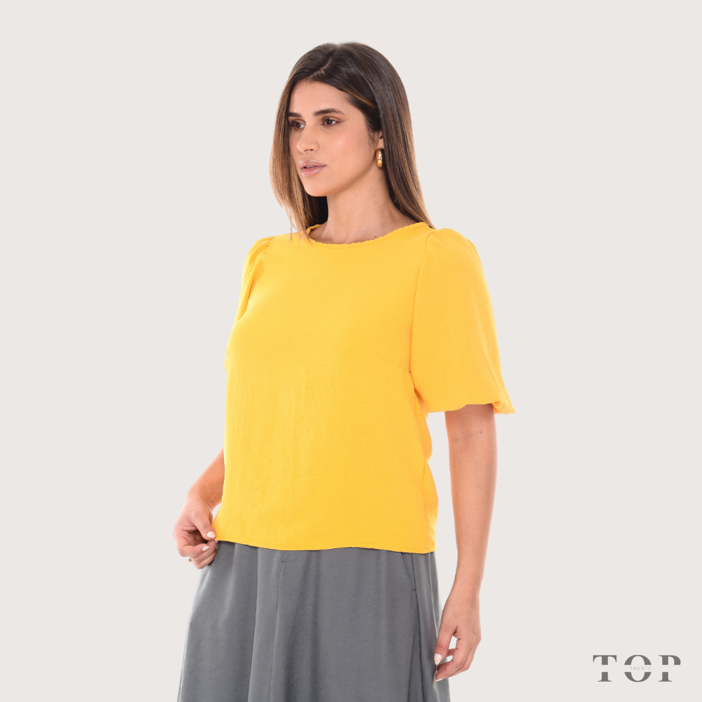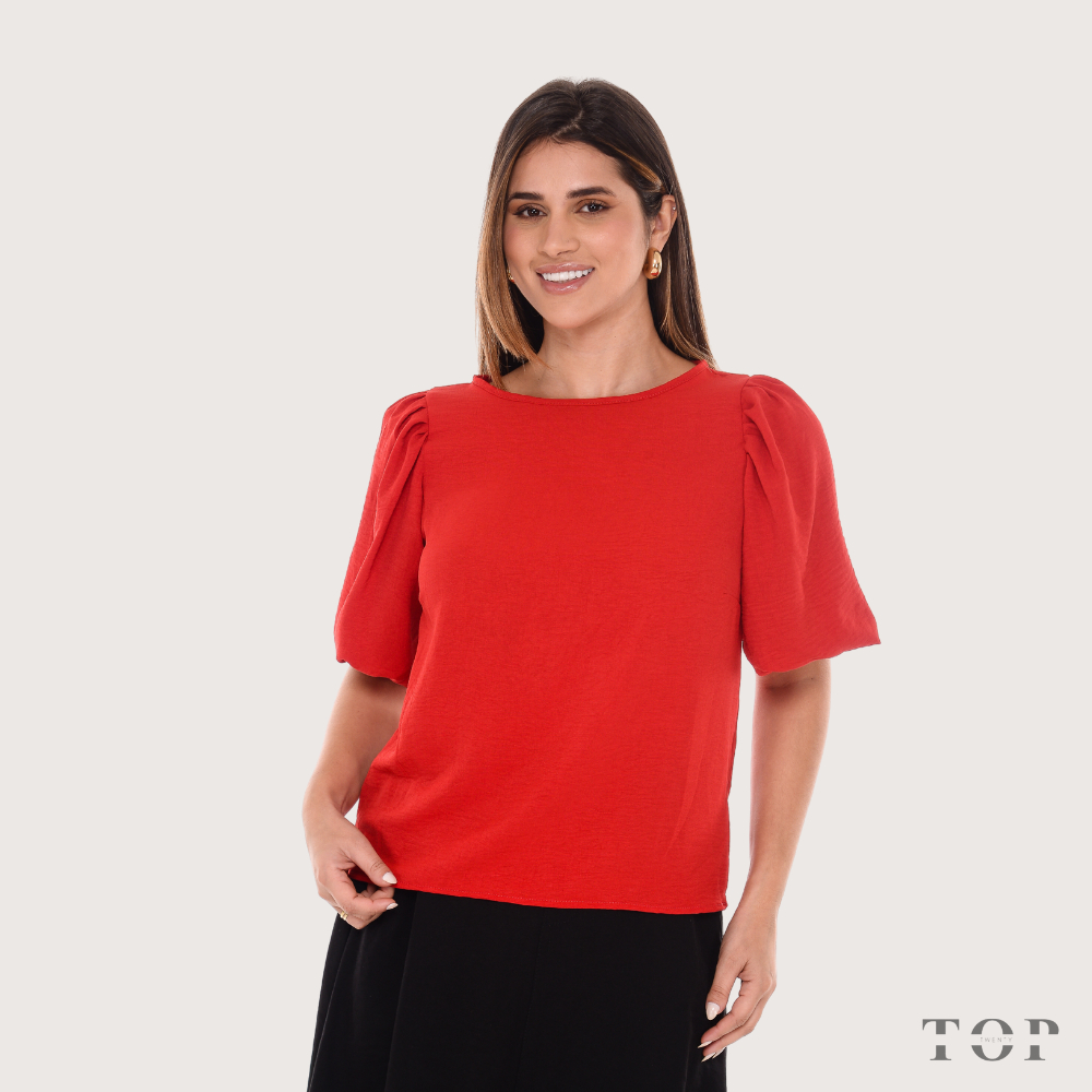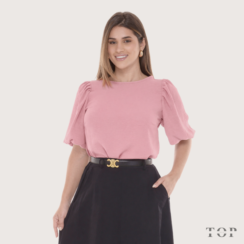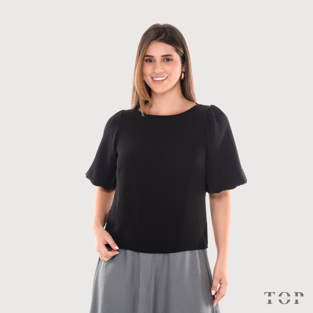 Blusa Feminina Manga Balonê Gola U com Abertura em Gota nas Costas