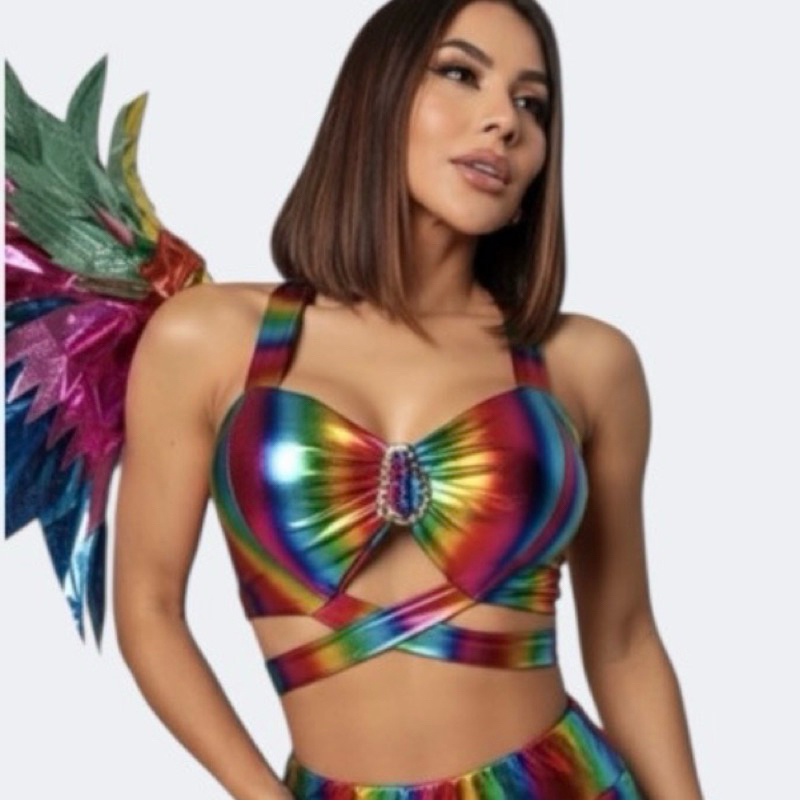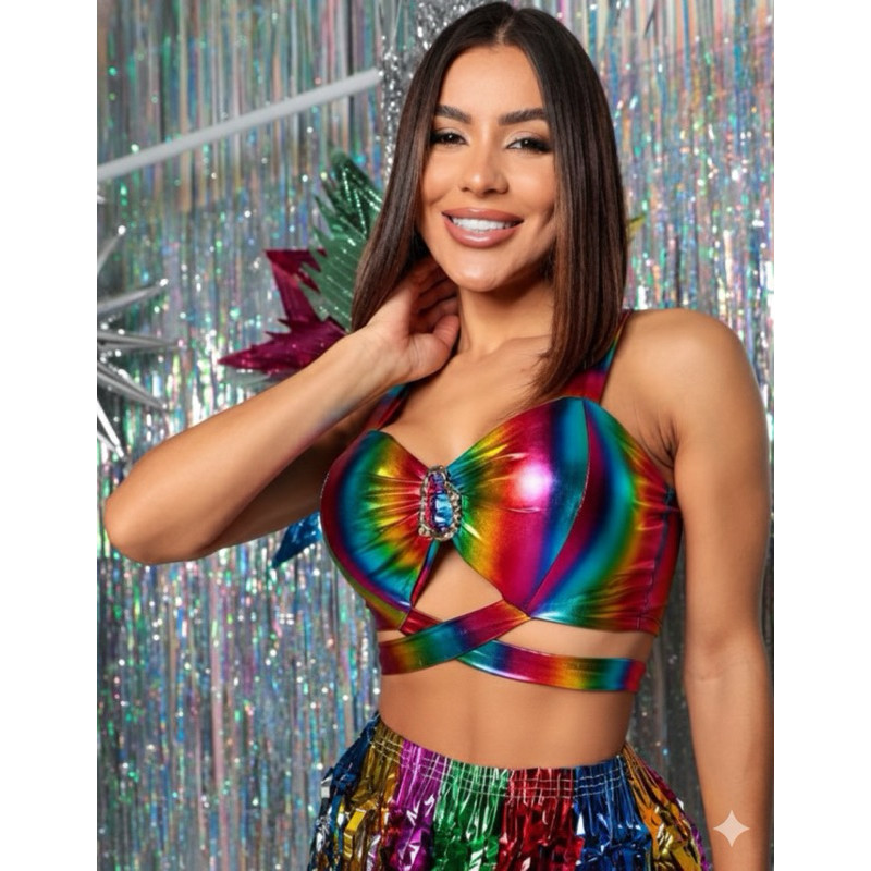 Conjunto Carnaval Larissa Cropped Metalizado e Saia Fitilho