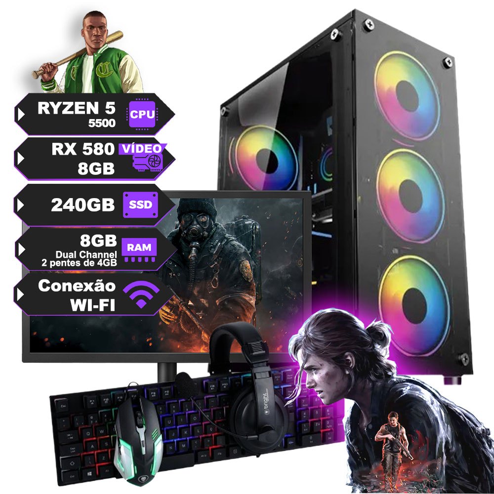 PC Gamer Completo Ryzen 5 5500, Placa Vídeo RX580 8GB, SSD 240GB, RAM 8GB, Wi-Fi e Monitor de 20"