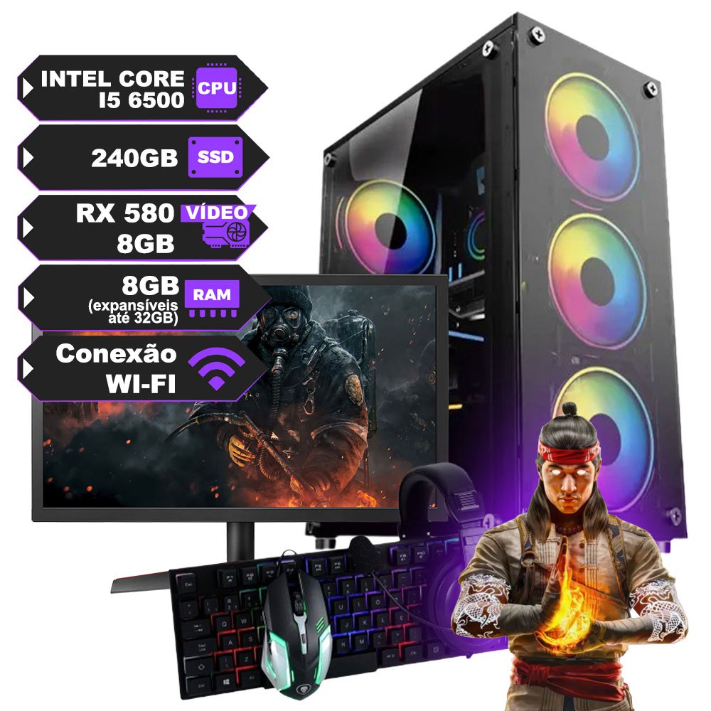 Pc Gamer Completo Core I5 6º 6500, Placa Vídeo RX580 8GB, SSD 240GB, RAM 8GB, WiFi e Monitor de 20