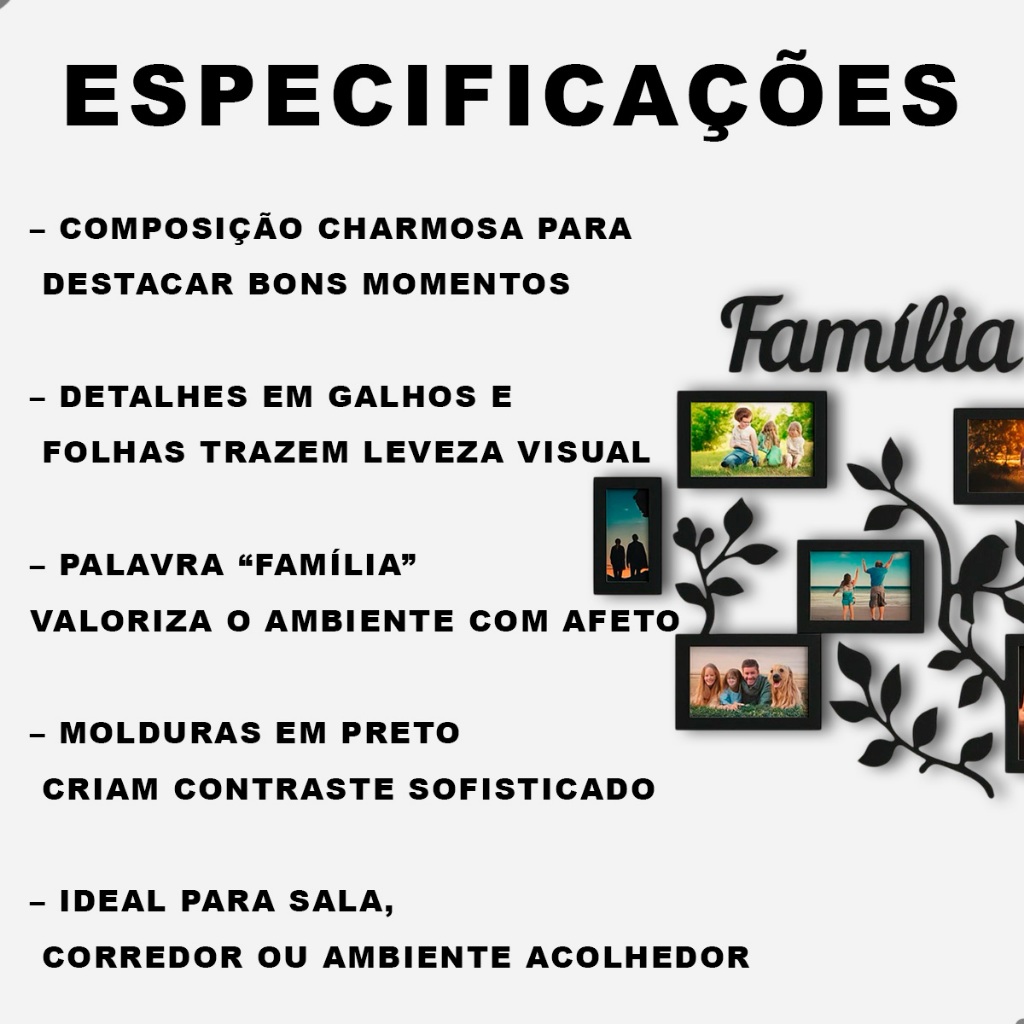 Painel de Parede Família em MDF com Molduras para Fotos 15x10cm Decorativo Ambiente Acolhedor e Afetivo