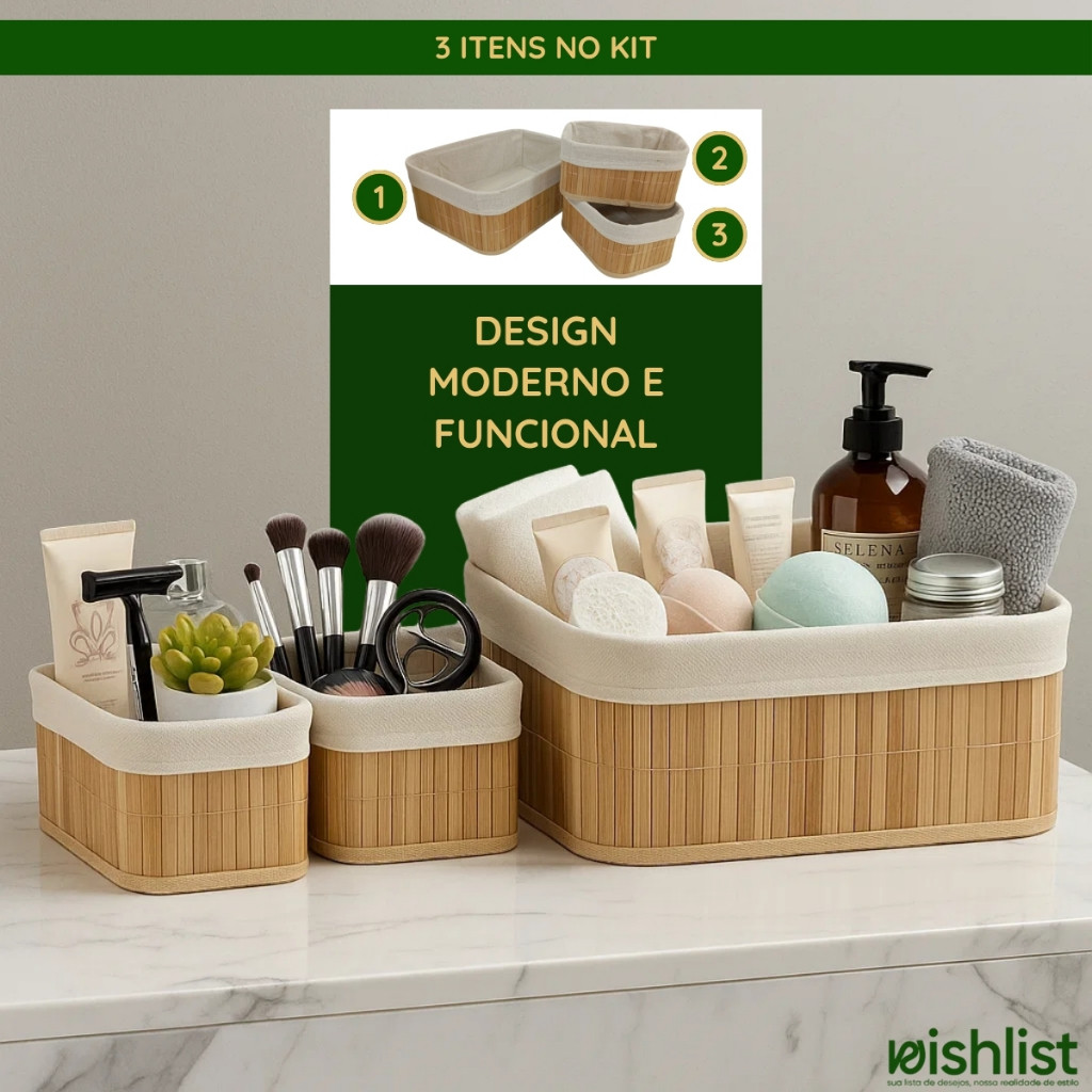 Kit 3 Cestos Organizador Moderno Bambu Fibra Algodão Decoração Armazenamento Elegante