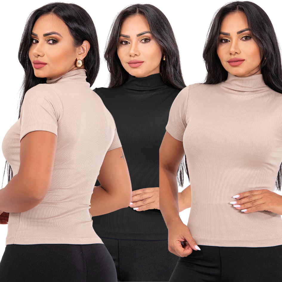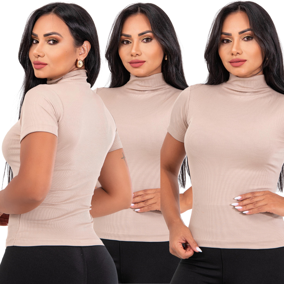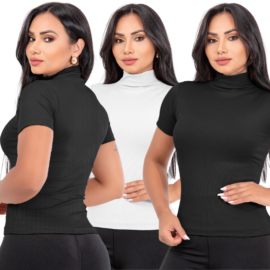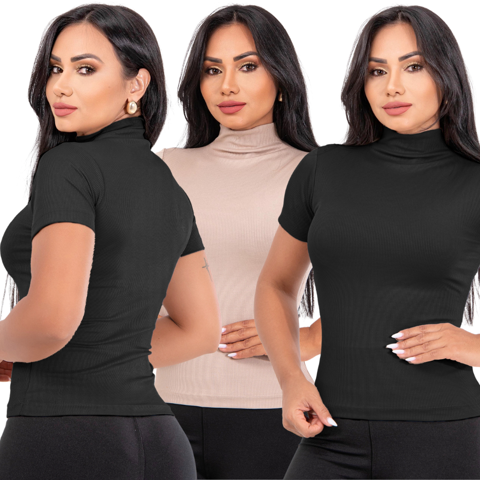 Kit 3 Blusas Feminina Manga Curta Gola Alta Canelada Moda Blogueira T-Shirt na Ribana