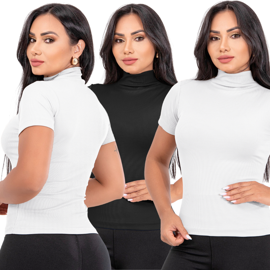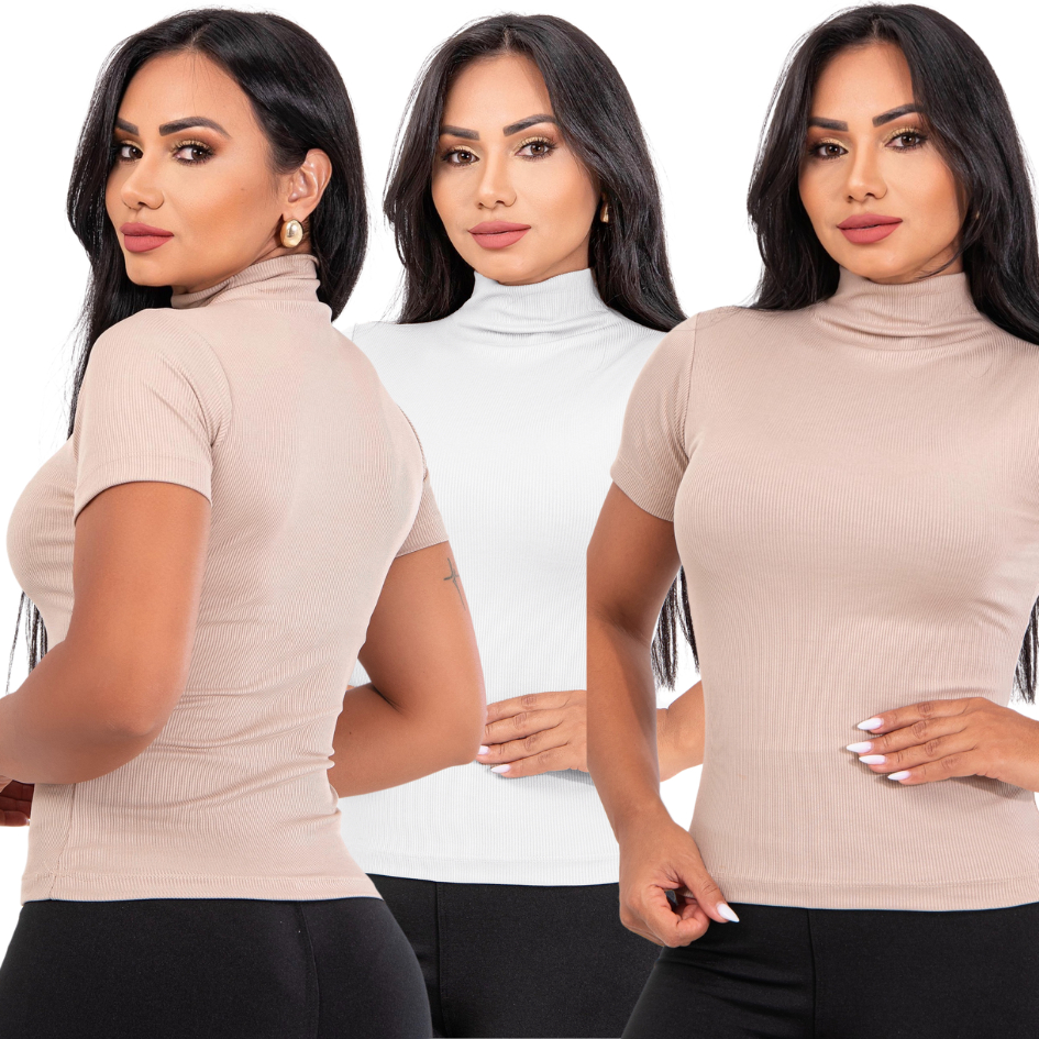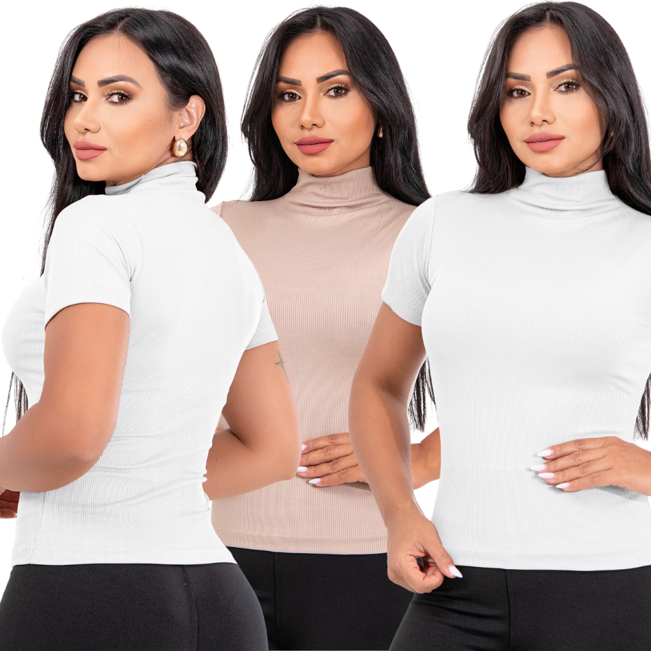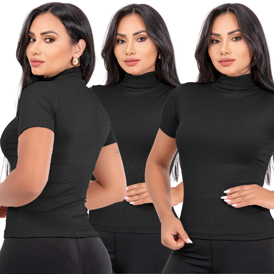 Kit 3 Blusas Feminina Manga Curta Gola Alta Canelada Moda Blogueira T-Shirt na Ribana