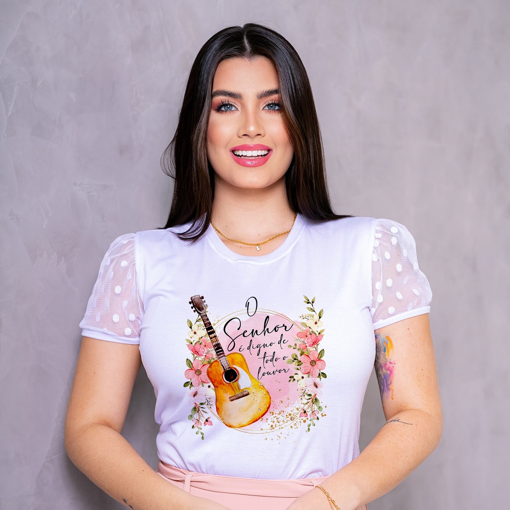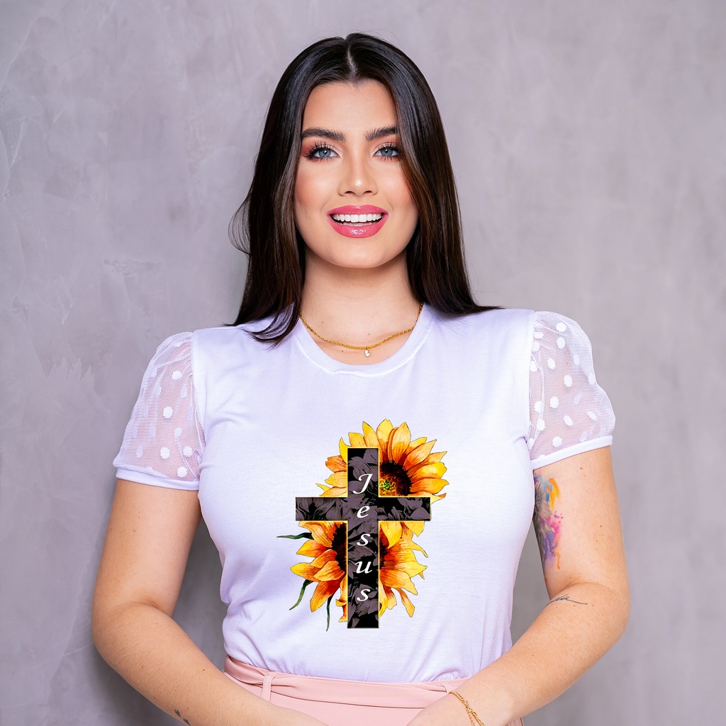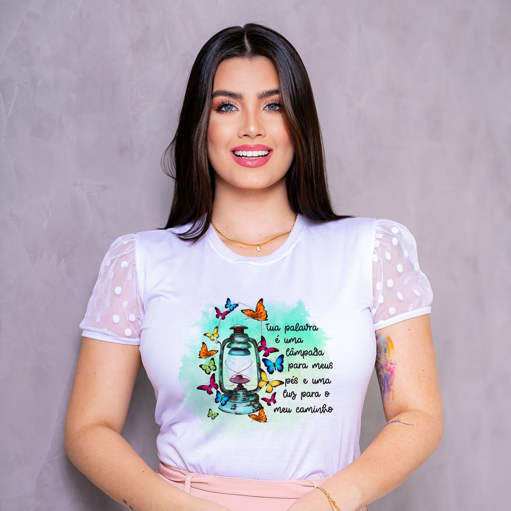 Blusa T-Shirt Manga de Tule - Cristã Evangélica