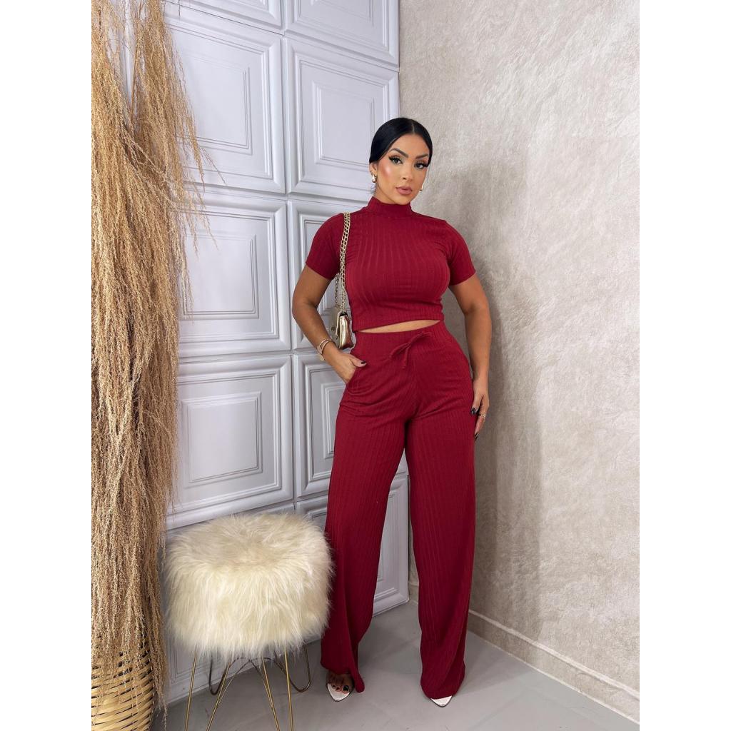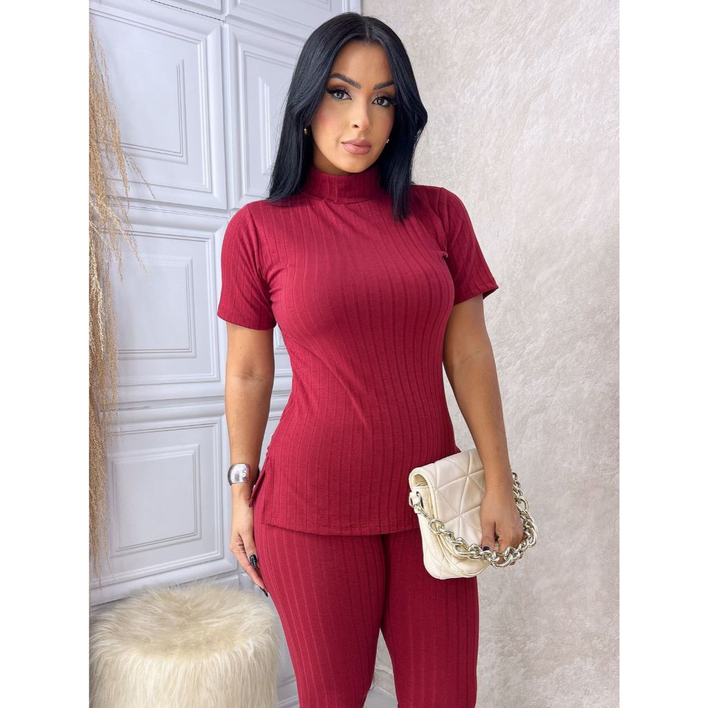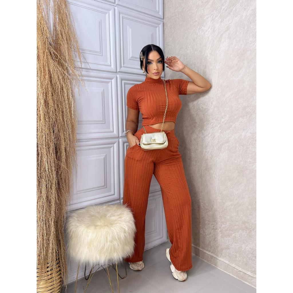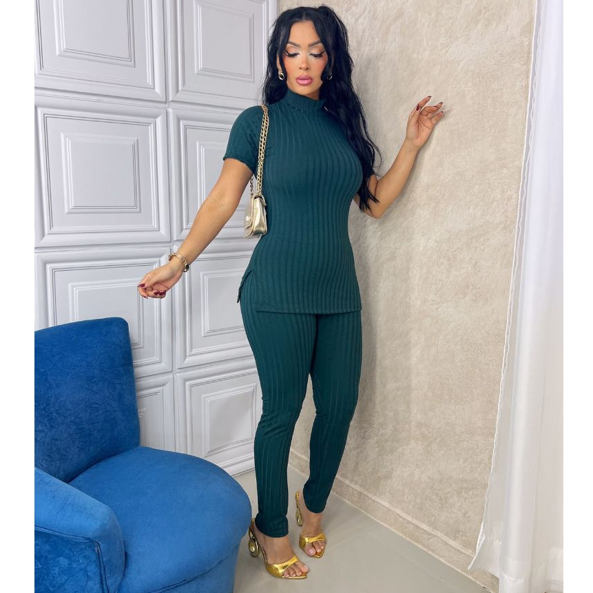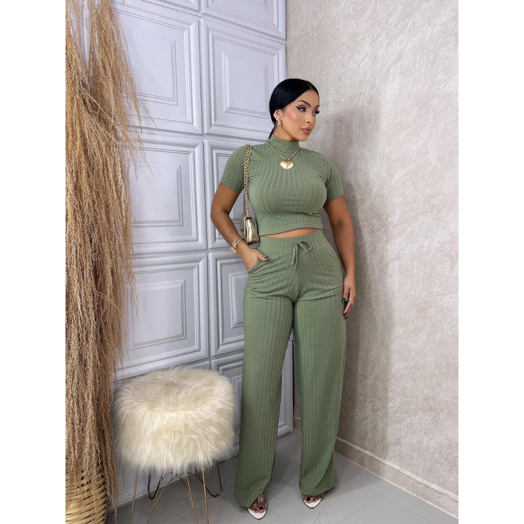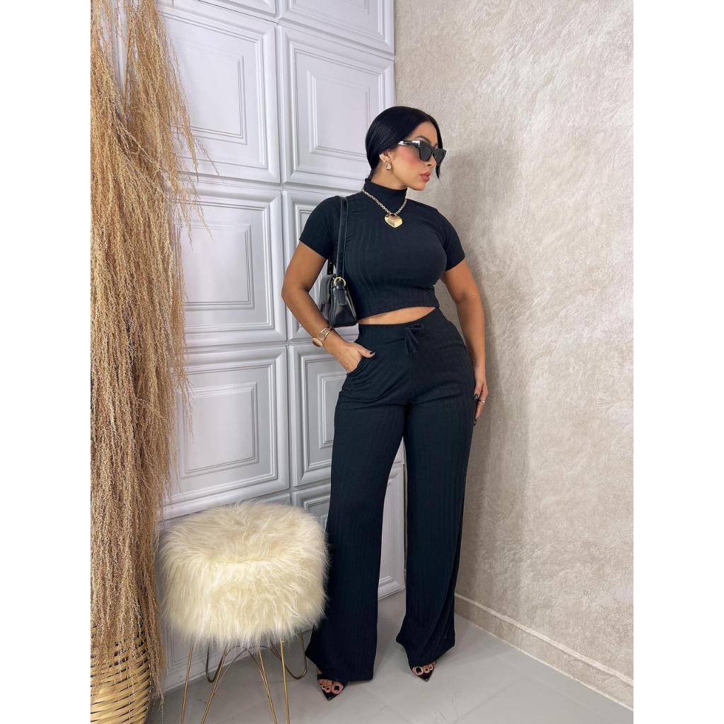 Conjunto Feminino Canelado Calça e Blusa Malha Com Elastano Premium