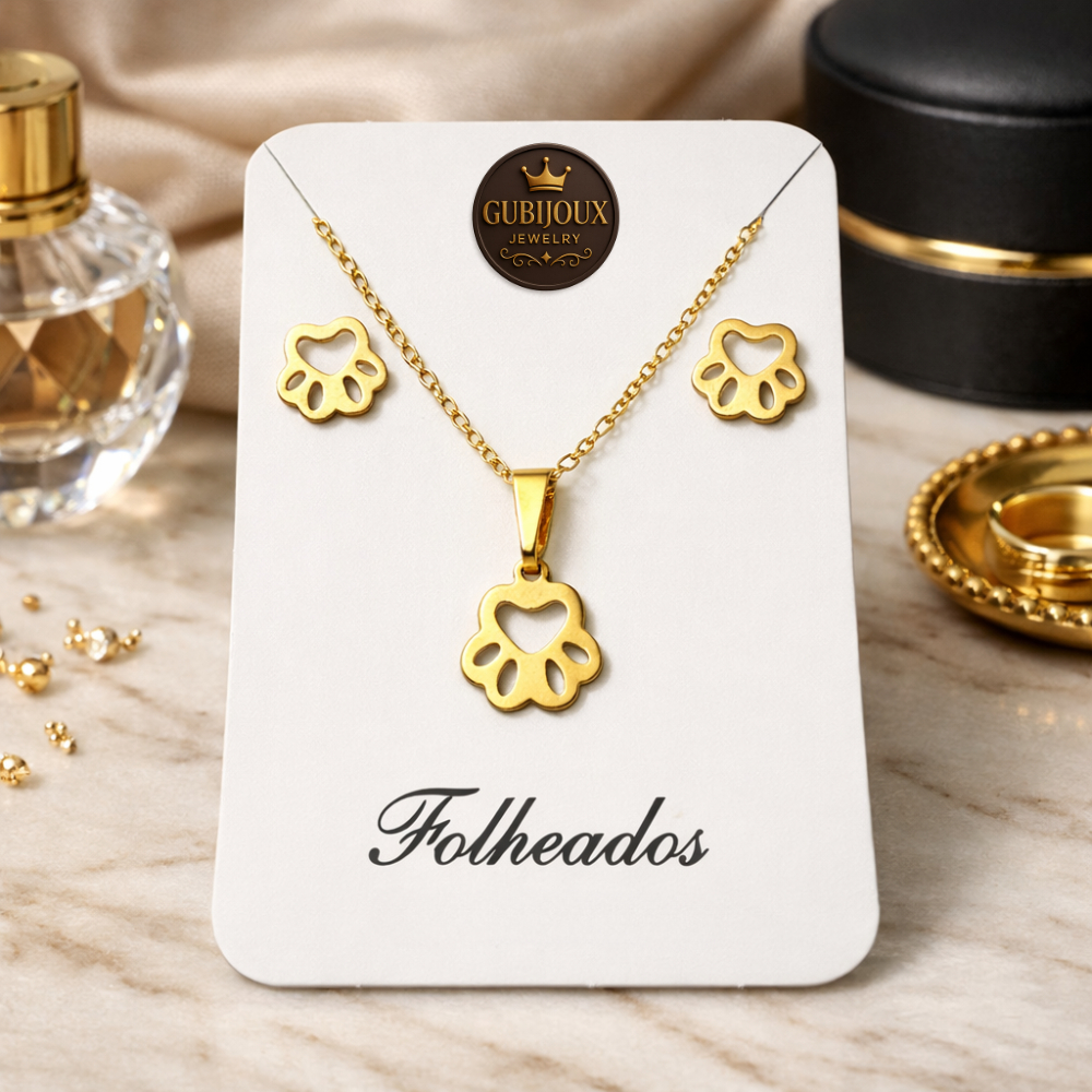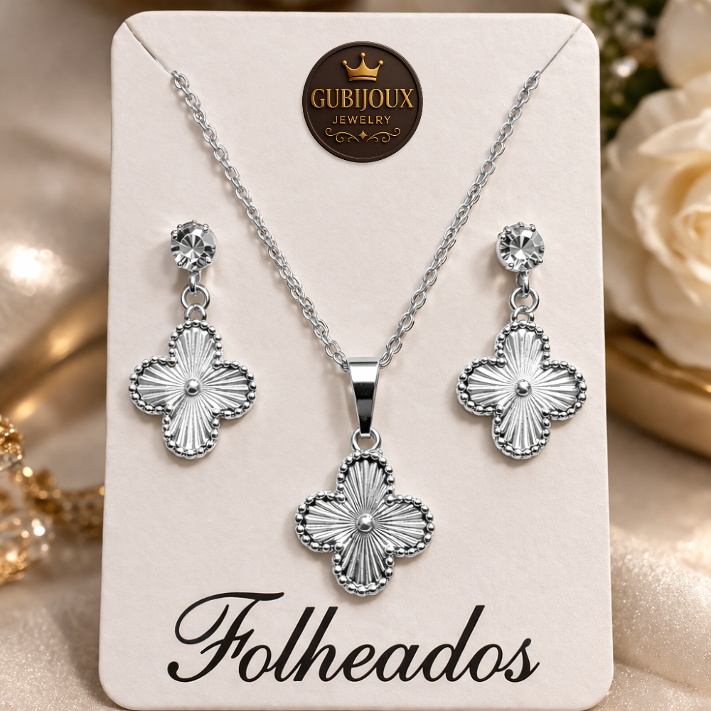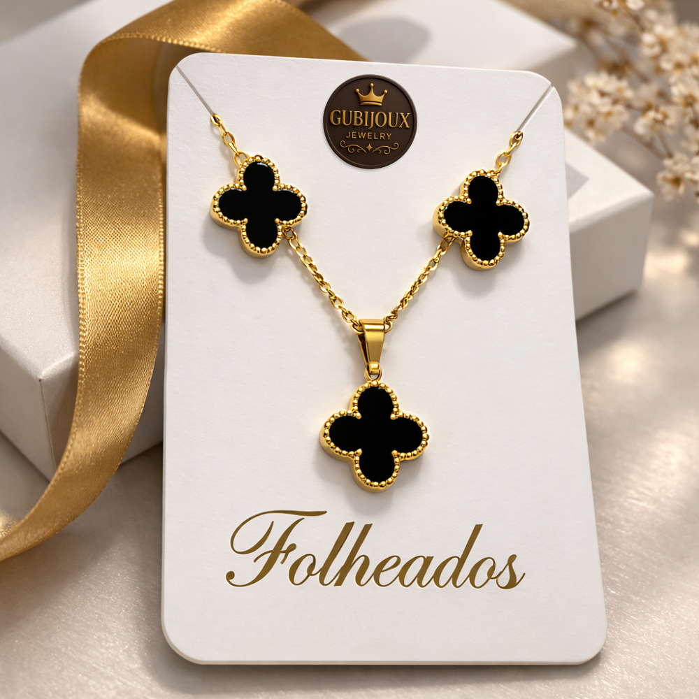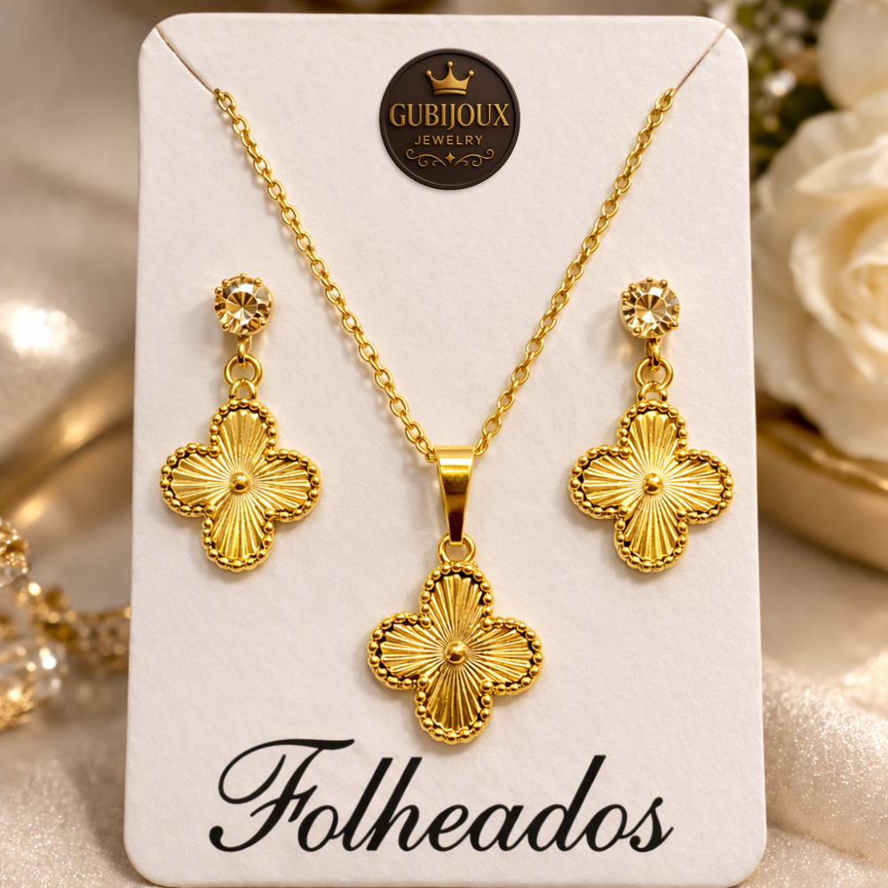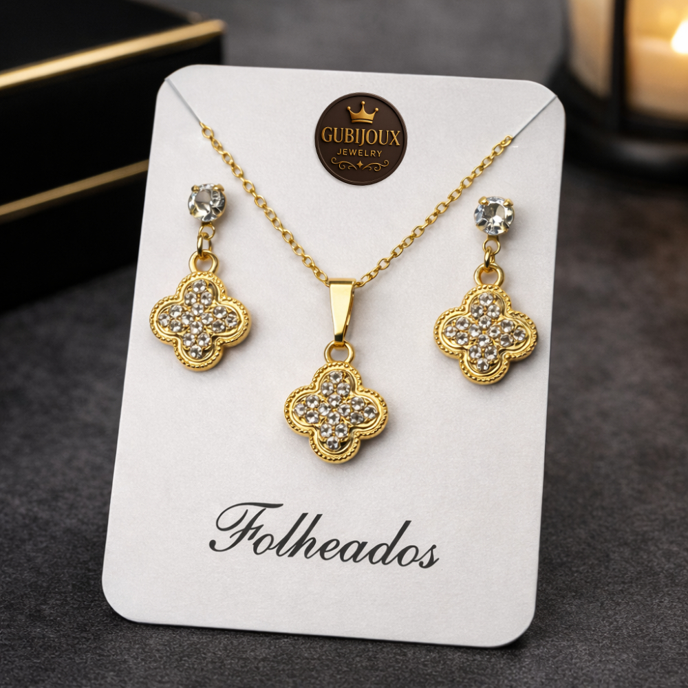 Conjunto Colar Brinco Trevo Folheado a Ouro18k