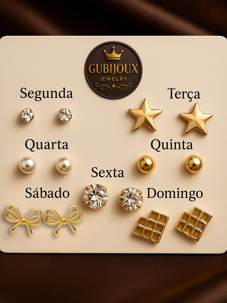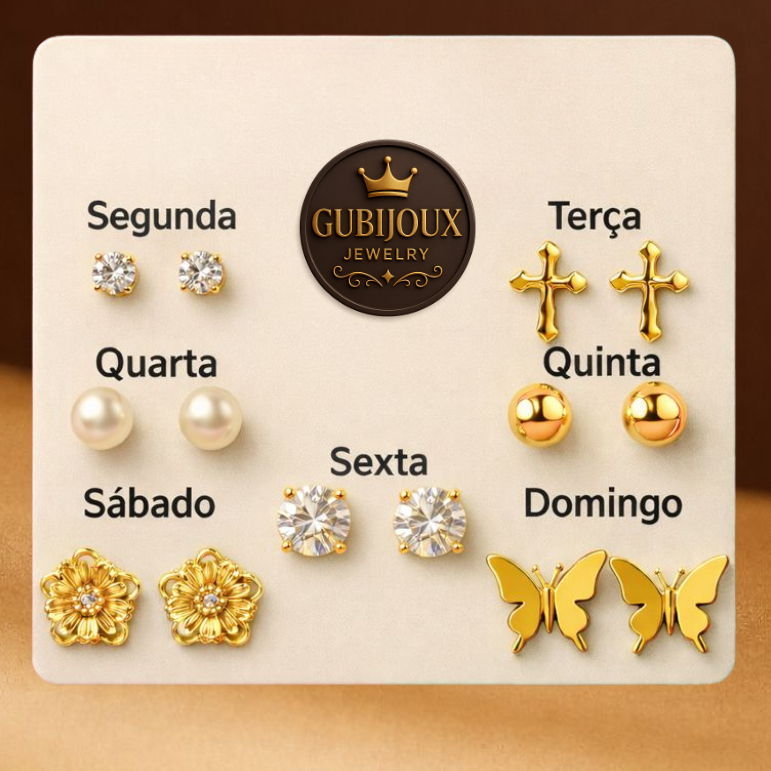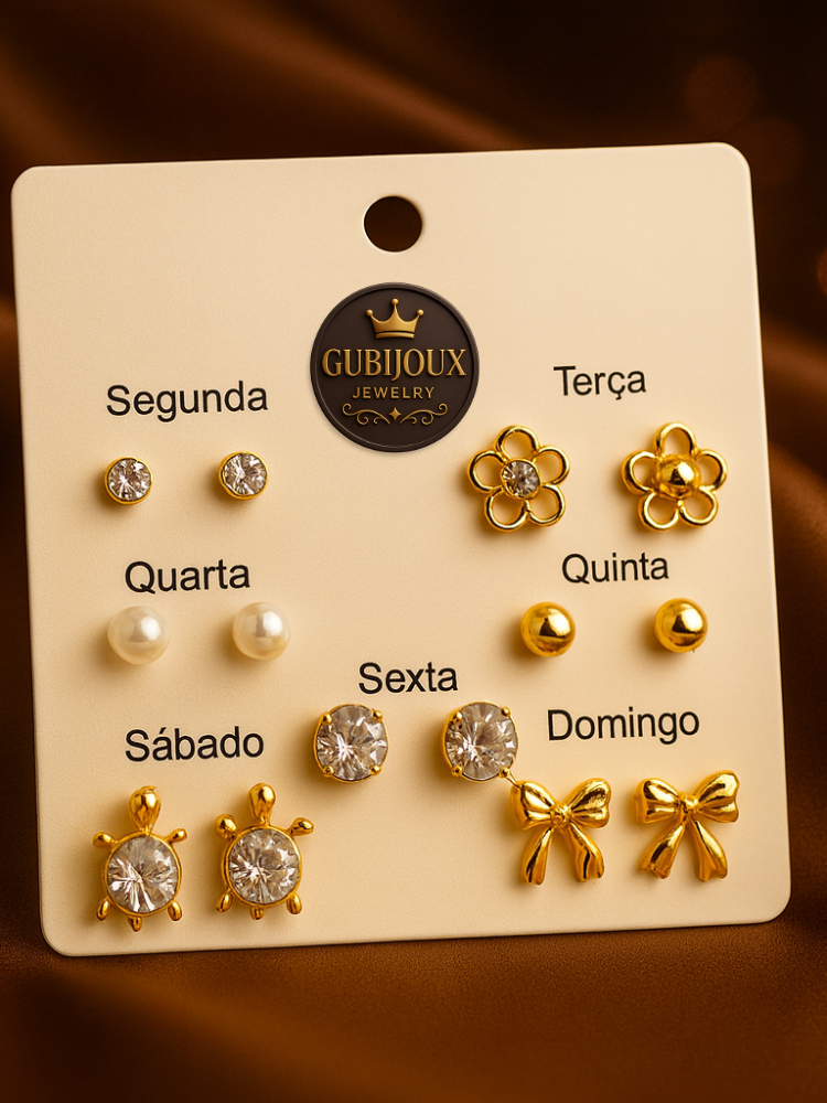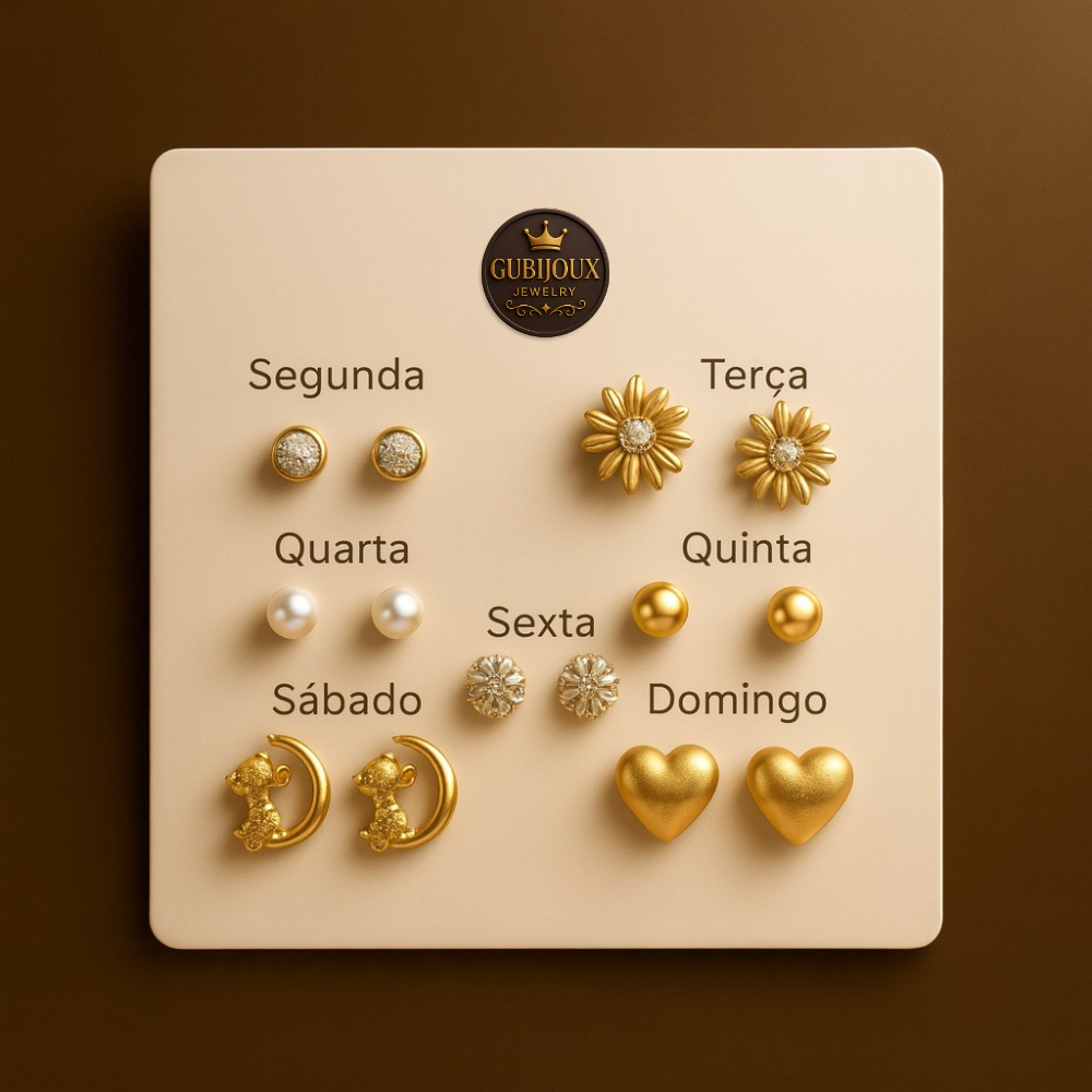 Kit 7 Pares Brincos Semana Inteira Dourados Fofo Coração Pérola | Look Completo