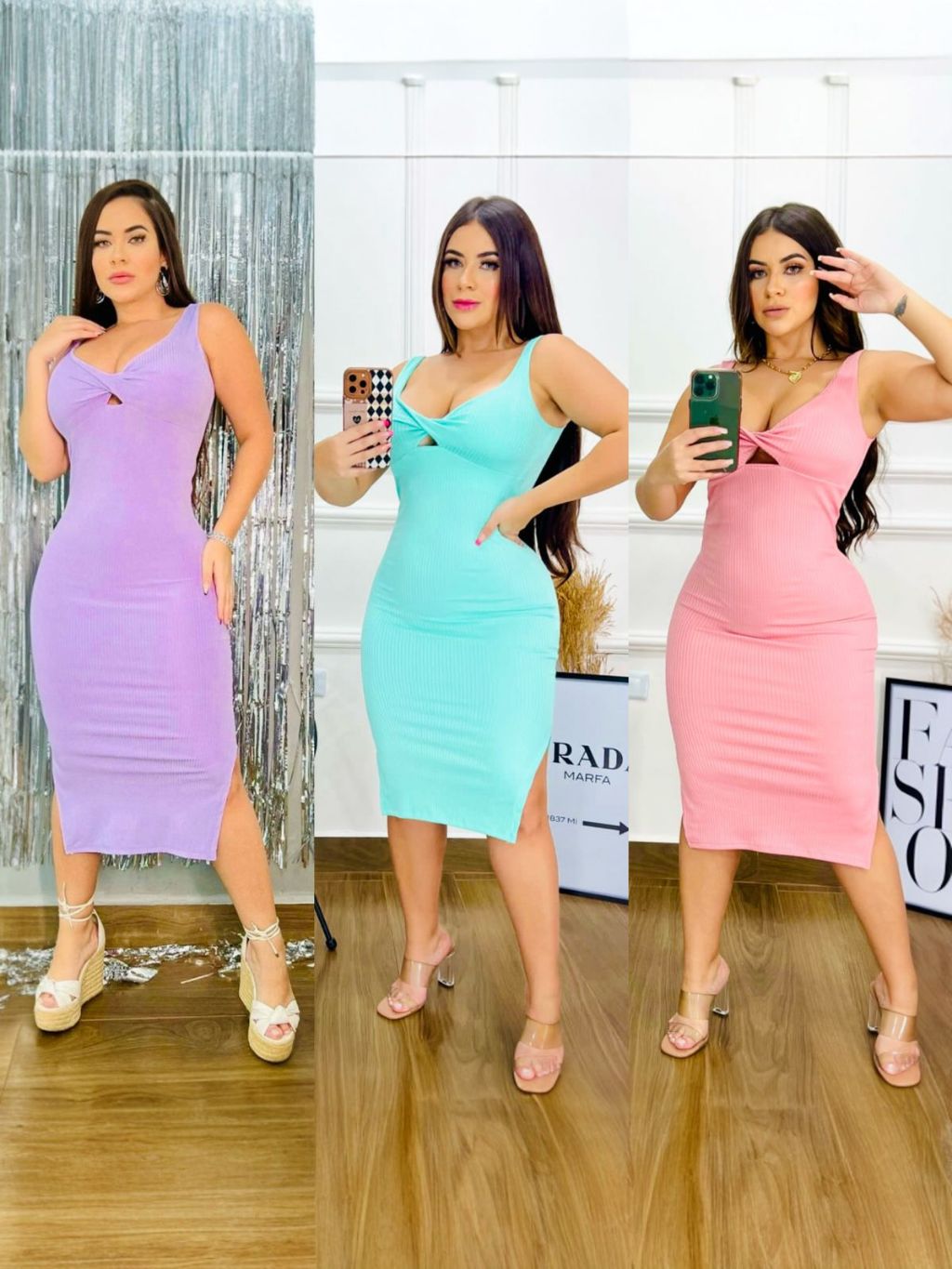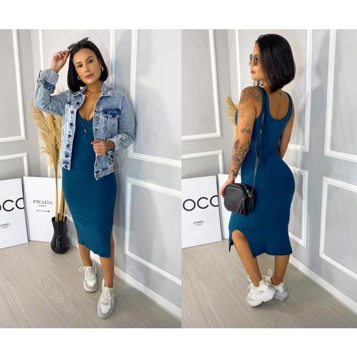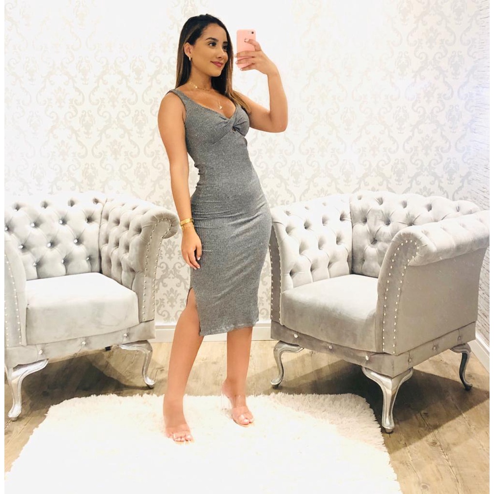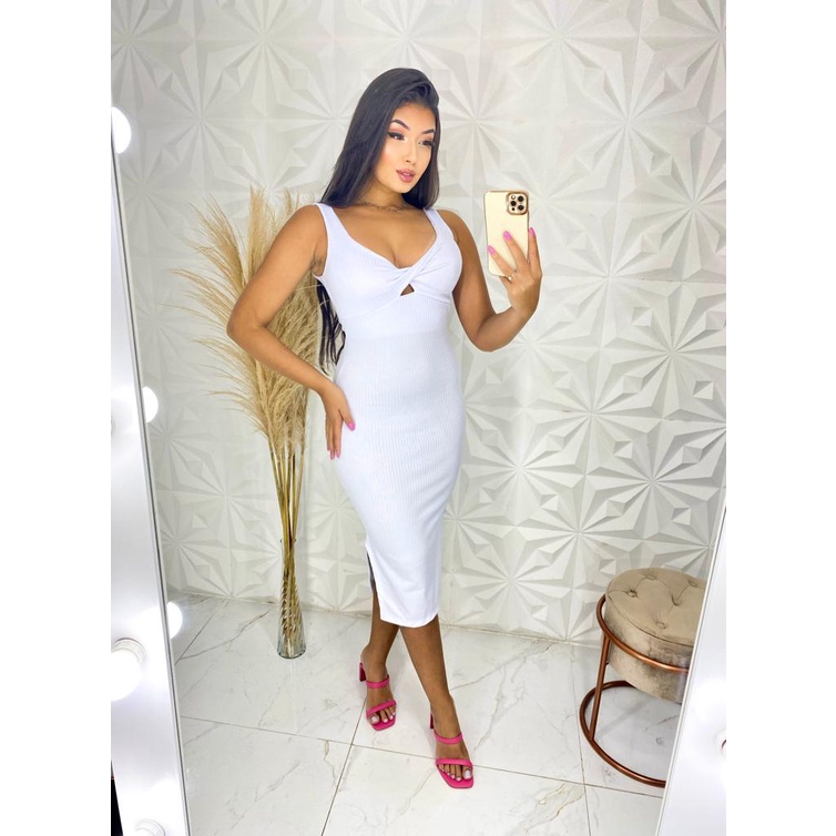 Vestido Feminino Midi Canelado Com Bojo Decote V