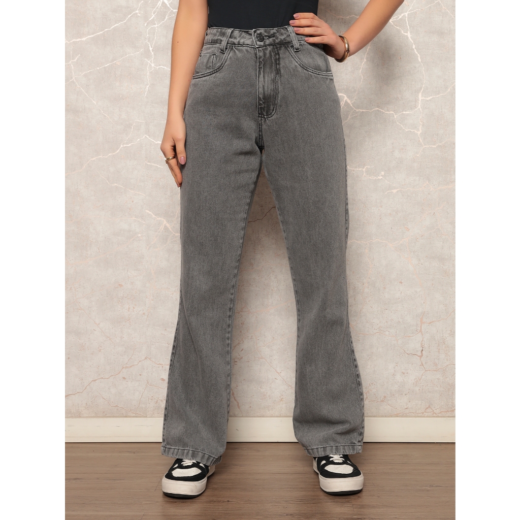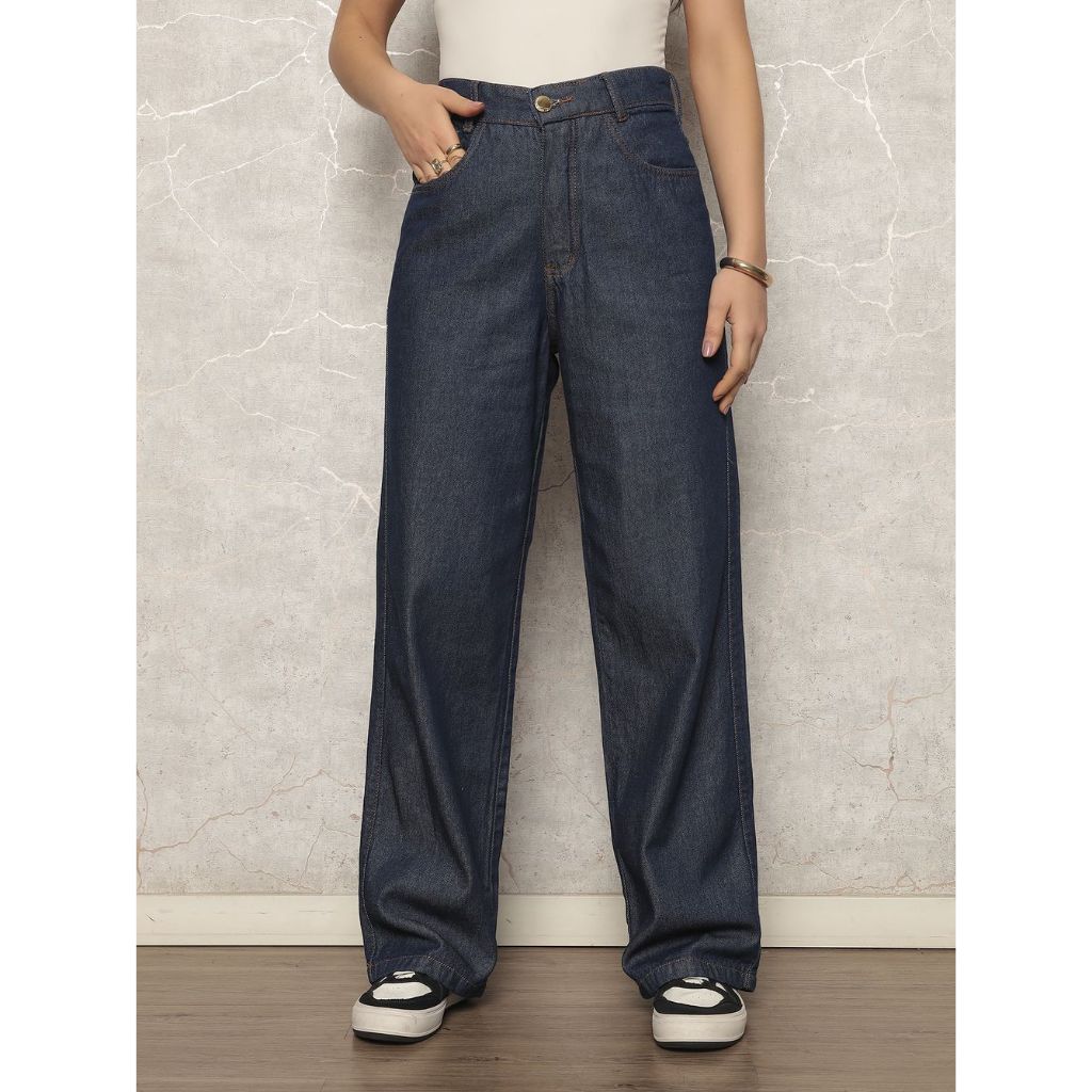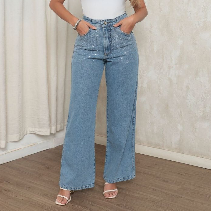 Calça Jeans Feminina Wide Leg sem Lycra Marmorizada Pantalona Cintura Alta Confortável Sofisticada