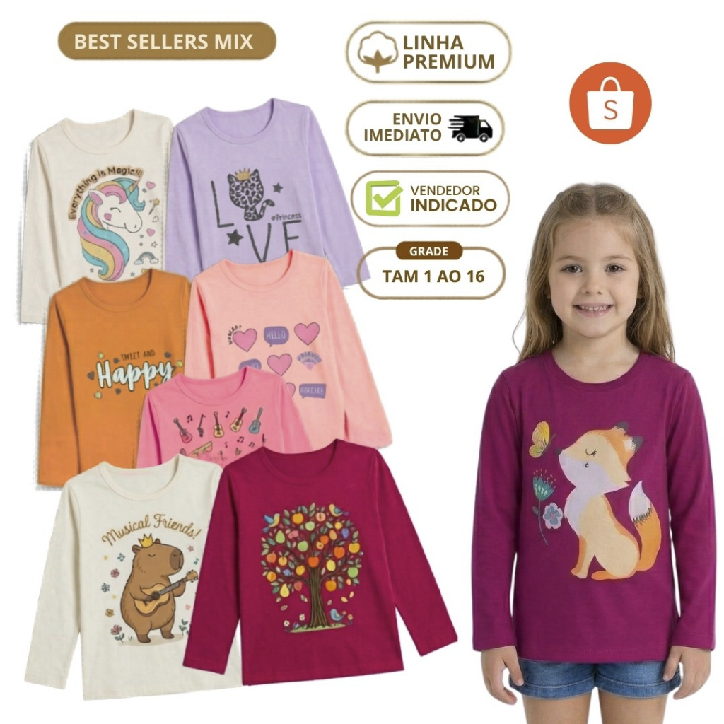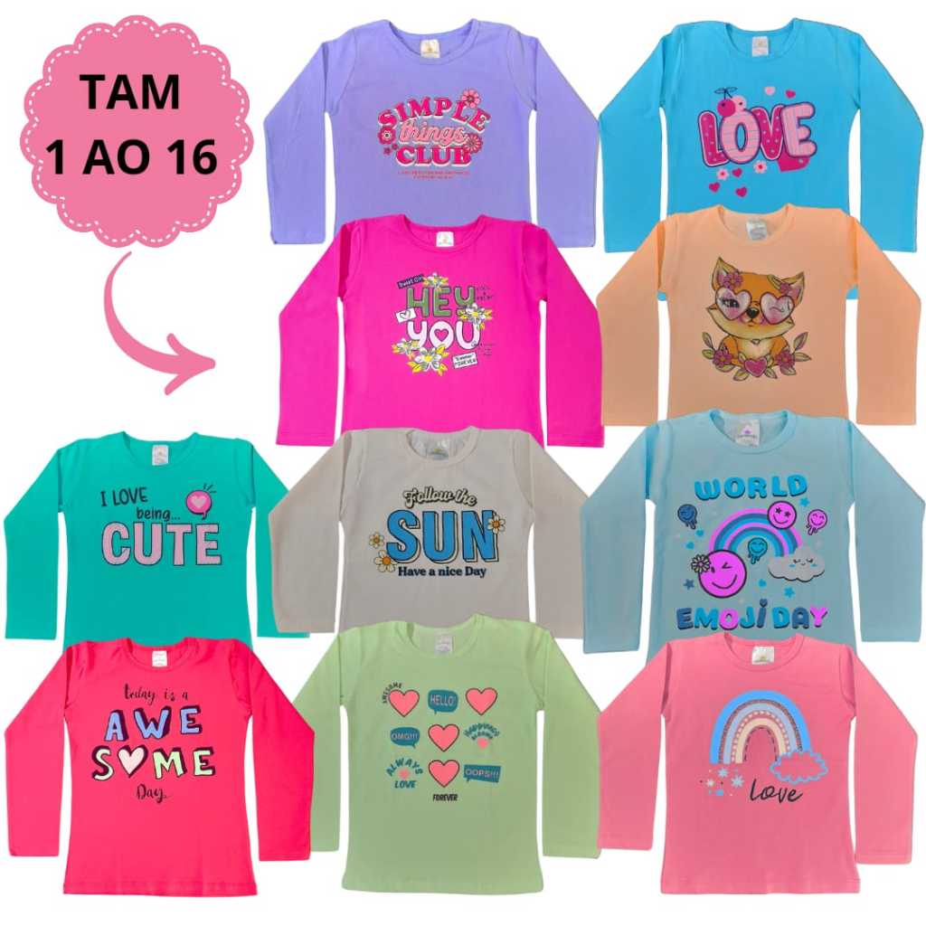 Kit 10 Blusa Manga Longa Menina Camiseta Meia Estação Infantil Feminina Camisa Criança Inverno 1 ao 16 anos Algodão