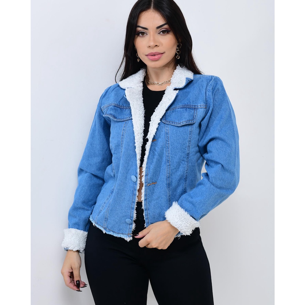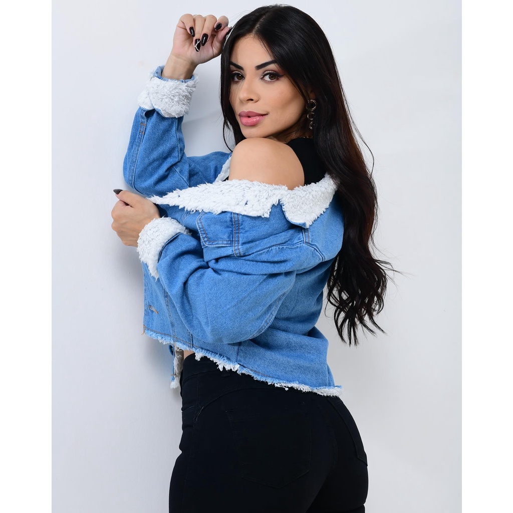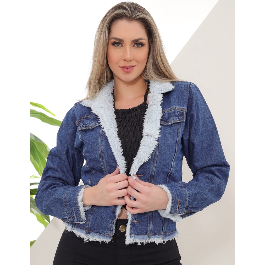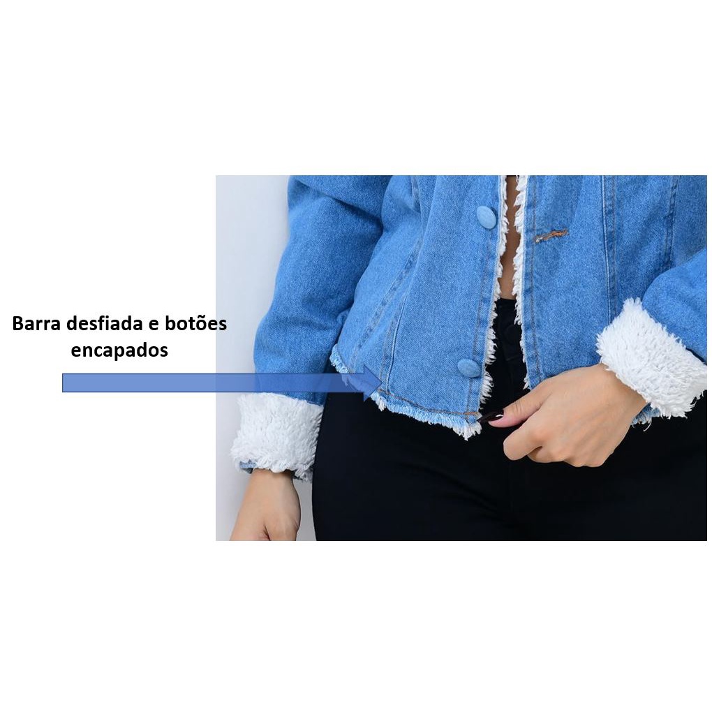 Jaqueta Jeans Azul Feminina Pelinhos e Barra Desfiada