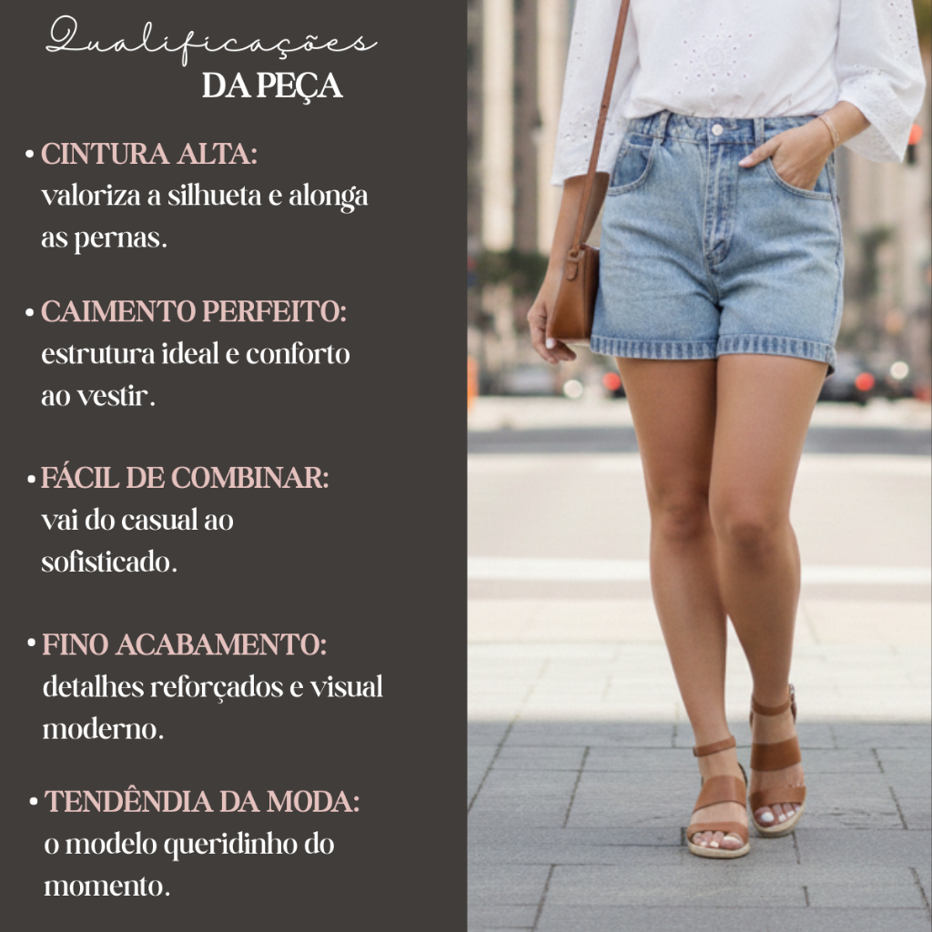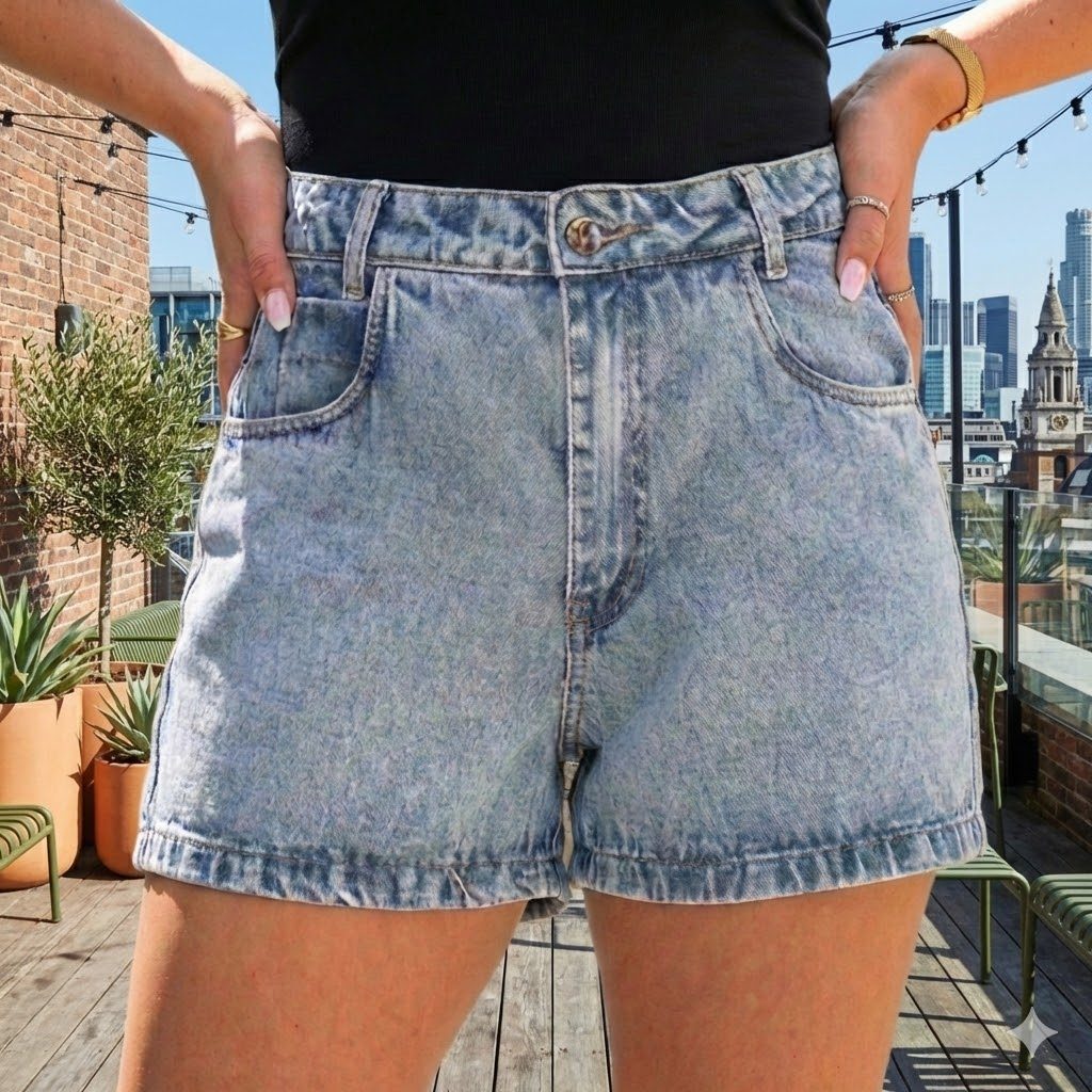 Short Jeans Feminino Cintura Alta Marmorizado Casual Solto 100% Algodão Sem Lycra