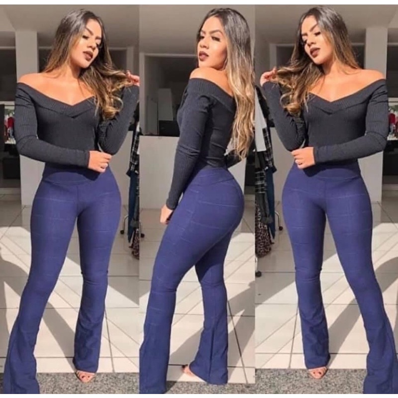 Calça Flare de Bandagem Modelo Boca de Sino Bailarina Cintura Alta e Tecido Grosso