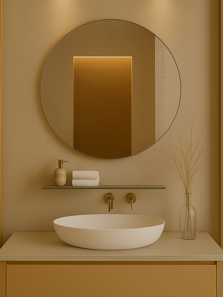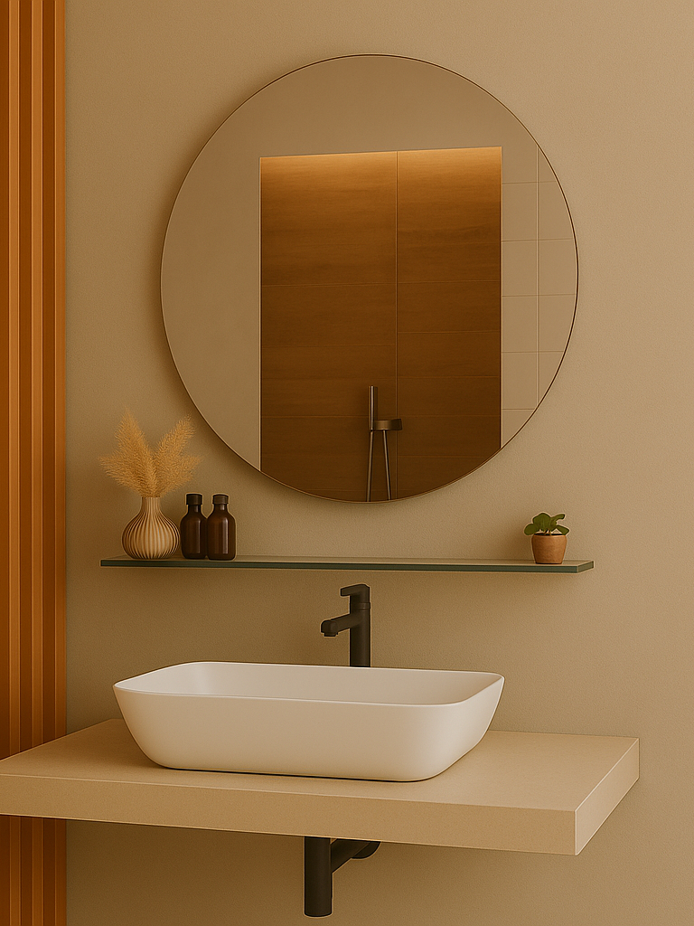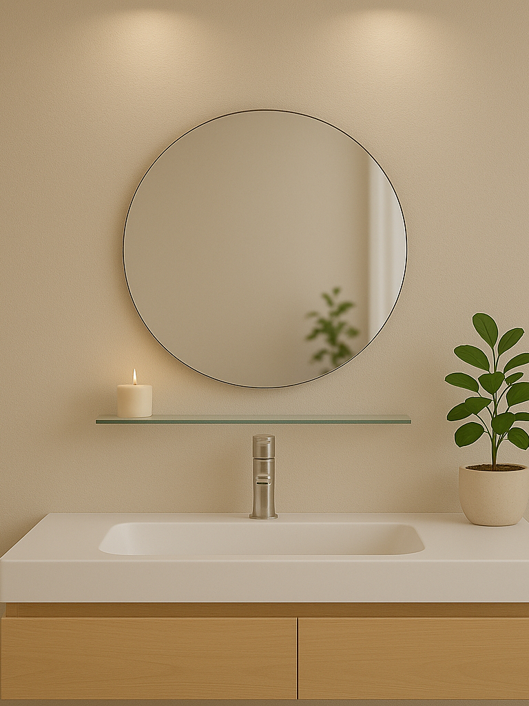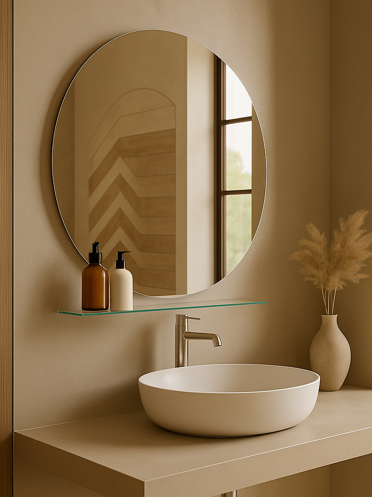 Espelho Banheiro Redondo 40cm + Prateleira de Vidro e Kit Instalação Decoração Sala Lavabo Casa