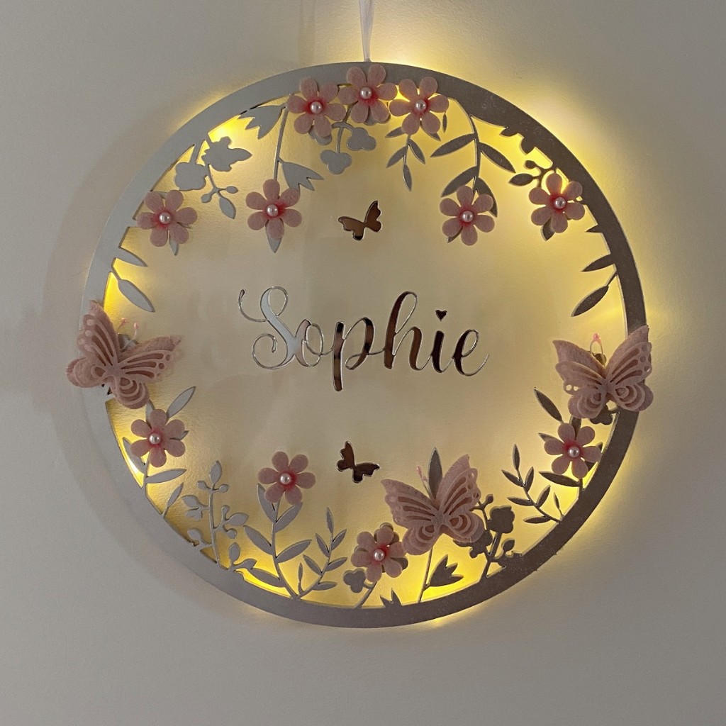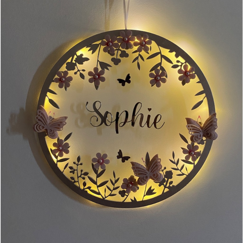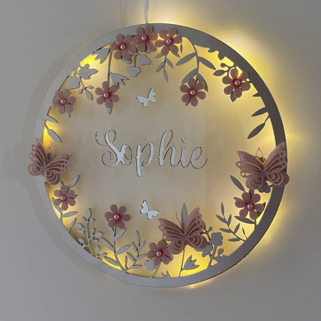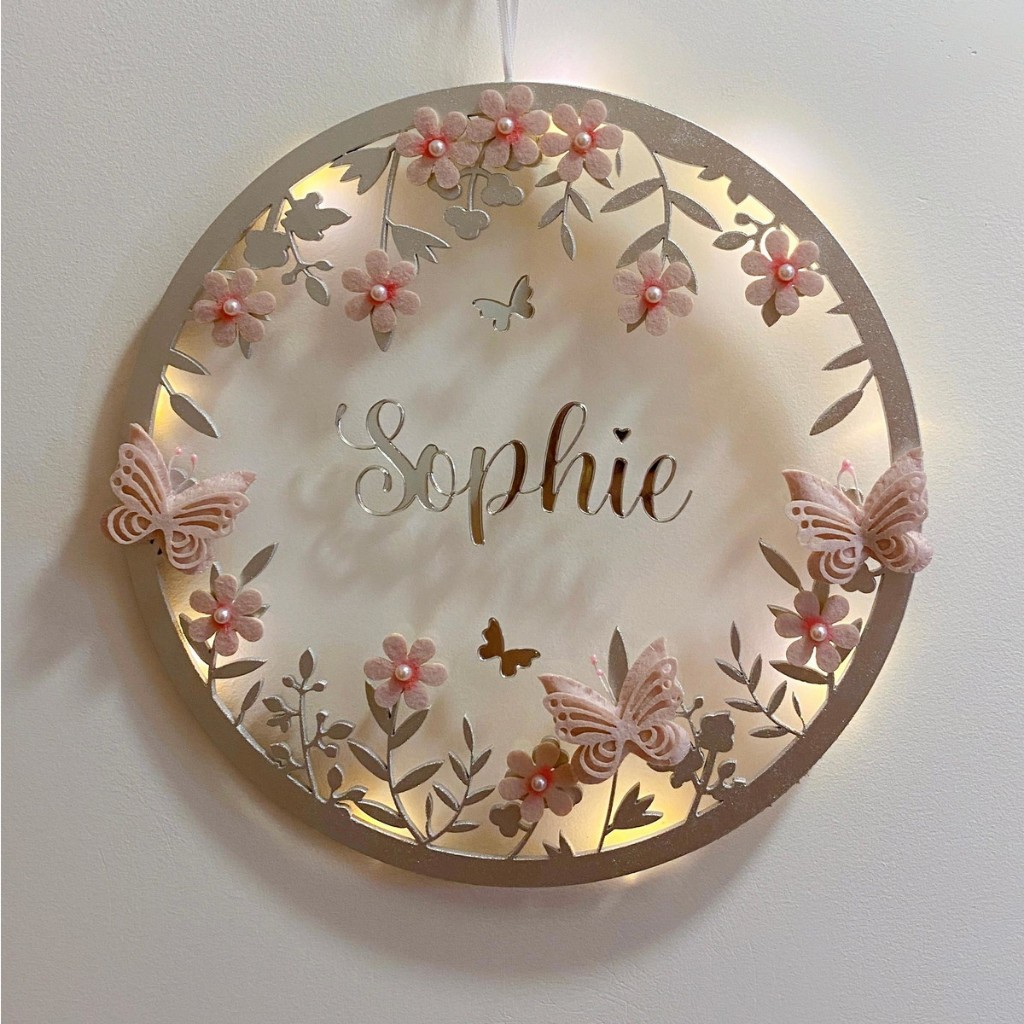 Porta Maternidade Borboletas LED acrílico Nome no Espelho Prata