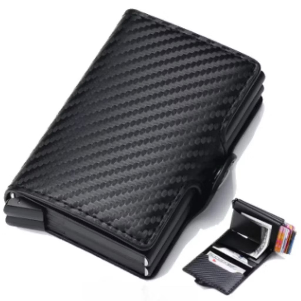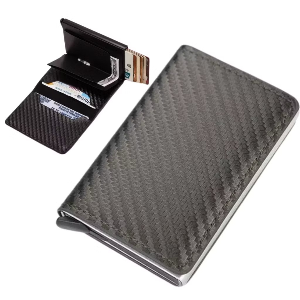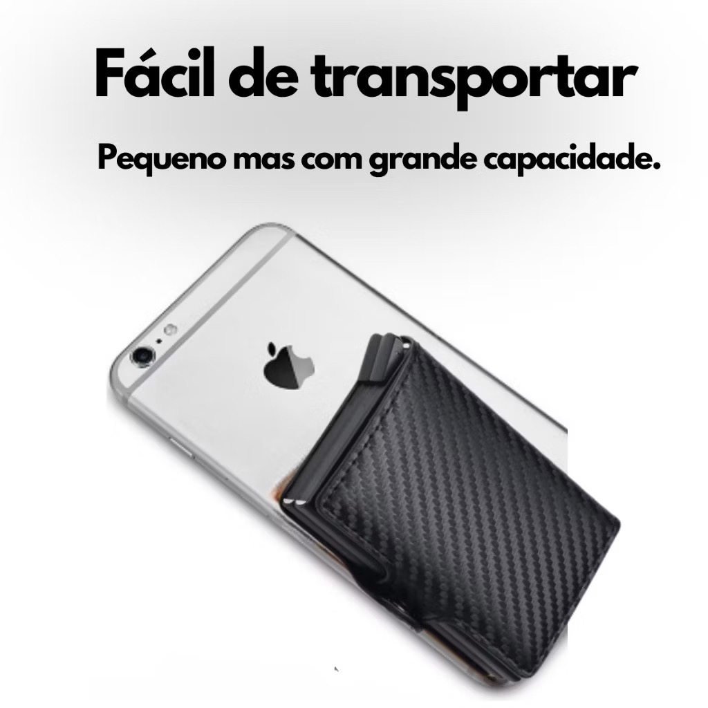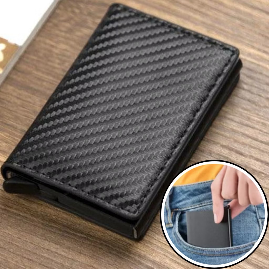 Carteira Porta Cartão Crédito Pop-up Inteligente Mágica Fibra Carbono Slim Antifurto Preta Smart