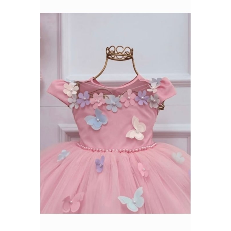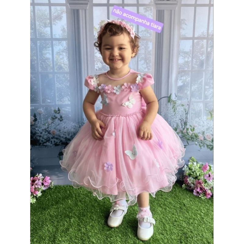 Vestido infantil luxo jardim encantado com apliques de borboletas, Rosa, lilás 1 ao 4 anos