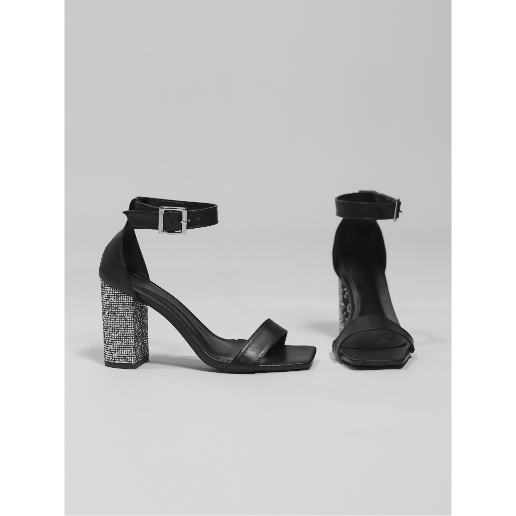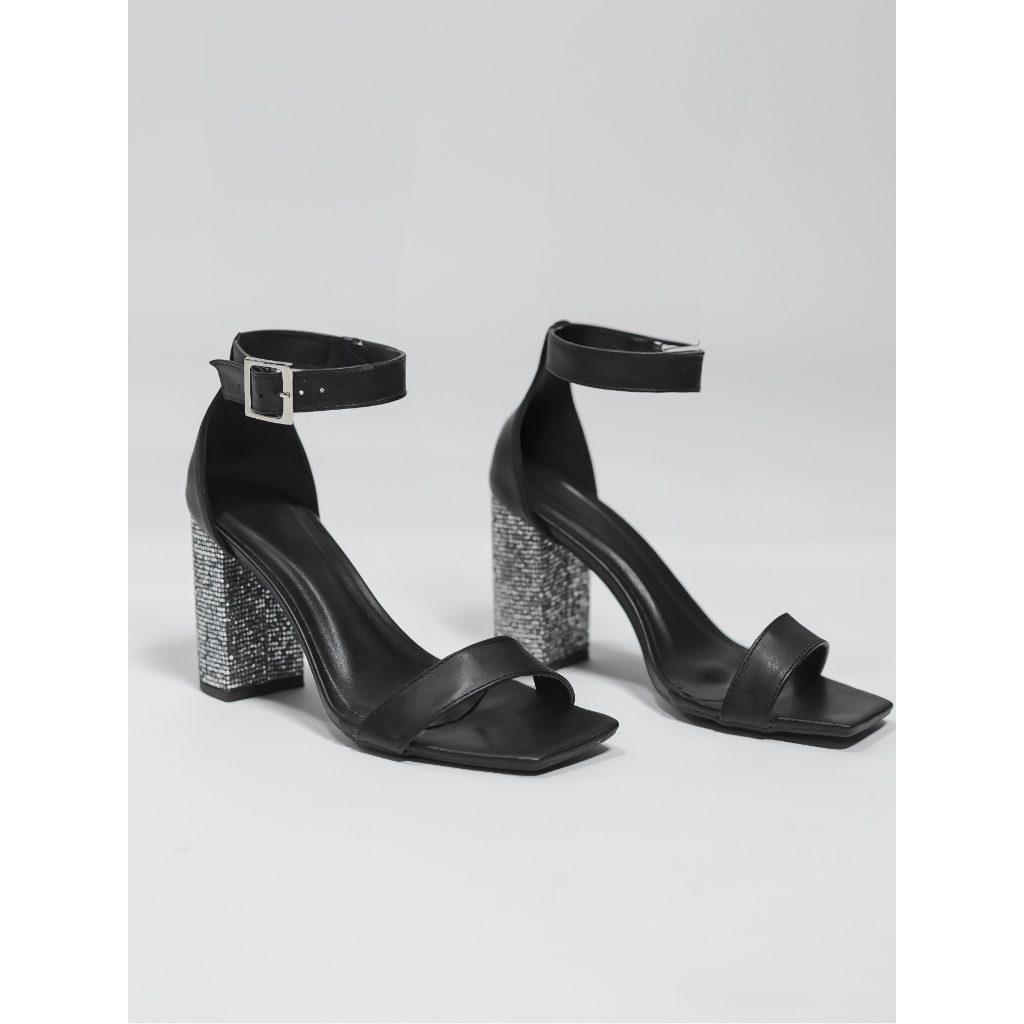 Sandália Preta Salto Bloco 9cm Glitter Prata Confortável Elegante