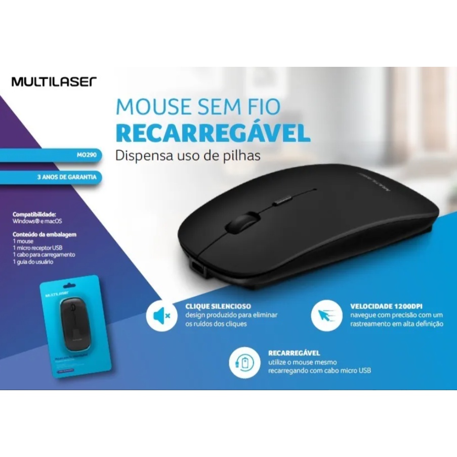 Mouse Para Computador Sem Fio Recarregavel De Lítio 2.4Ghz Tamanho Único Multilaser MO290
