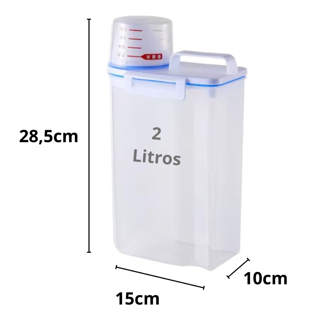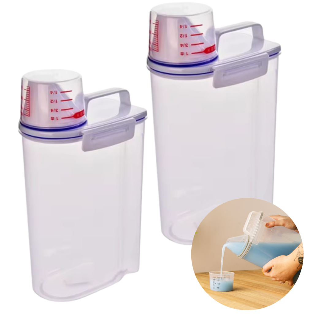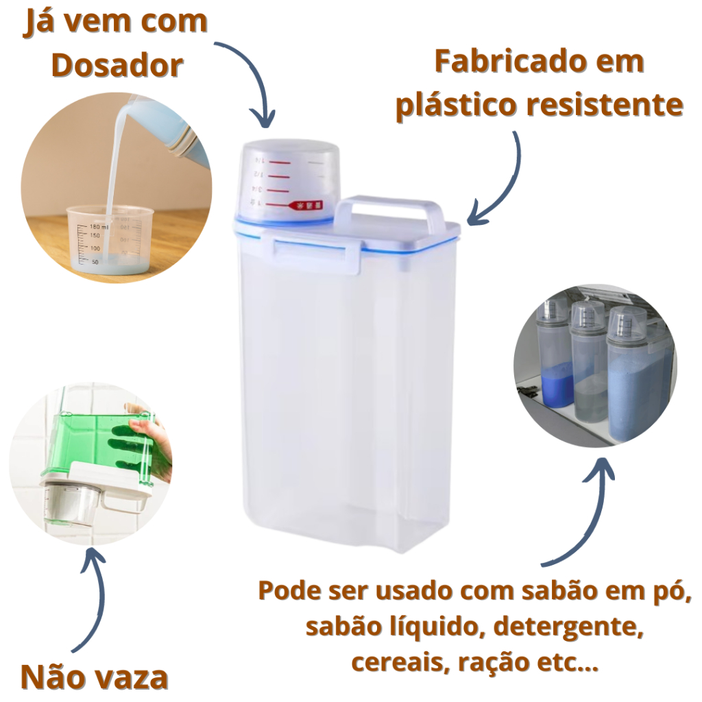 Kit Dispenser Organizador Plástico Lavanderia Com Tampa Dosadora Medidora 2L Sabão Em Pó