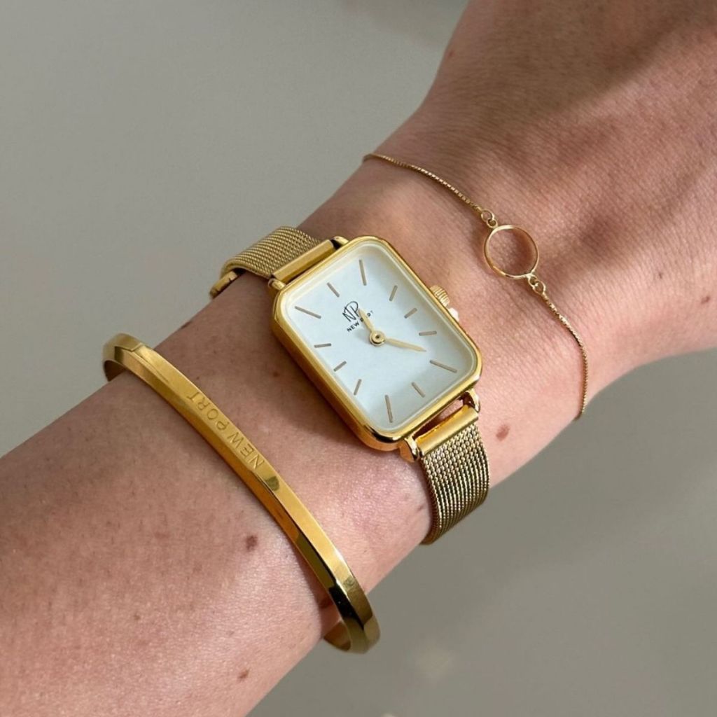 Relógio Feminino Quadrado Dourado Casual Elegante + Bracelete New Port